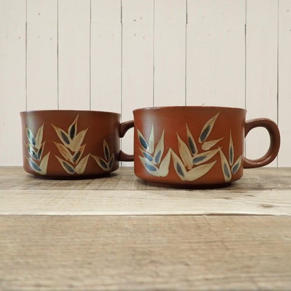 Vintage Stoneware Pottery Bowl Set of 7 Brown Blue and White with Wavy Design Signed Westby Westly