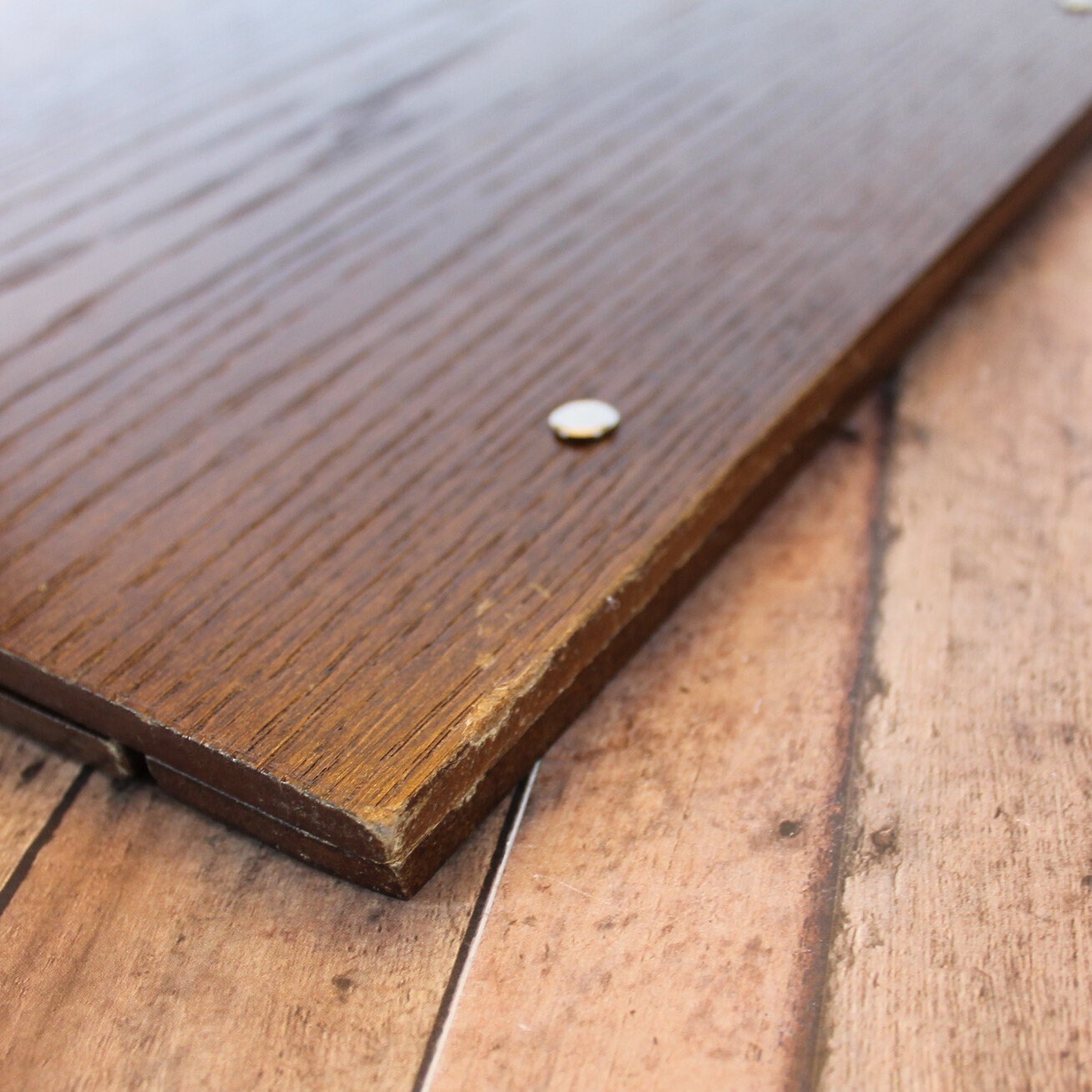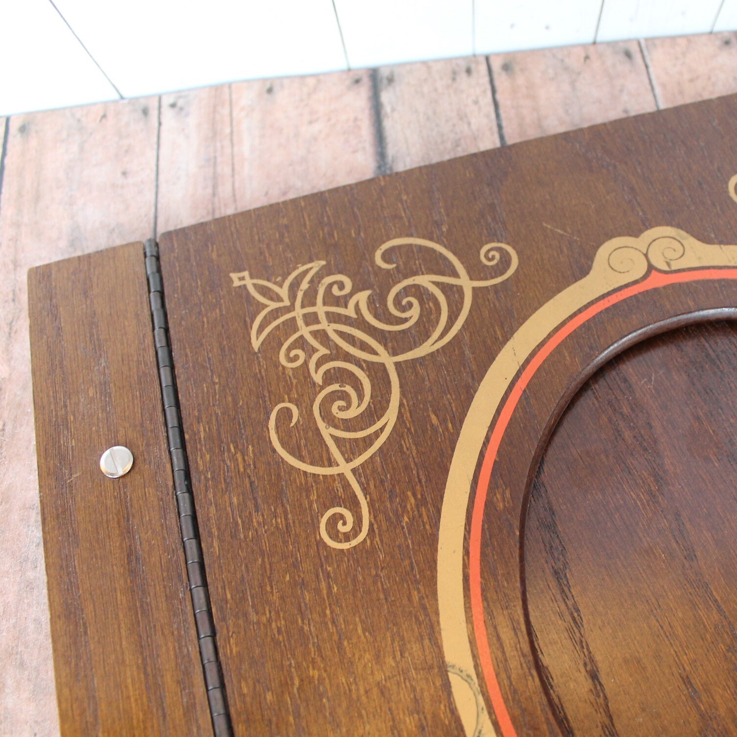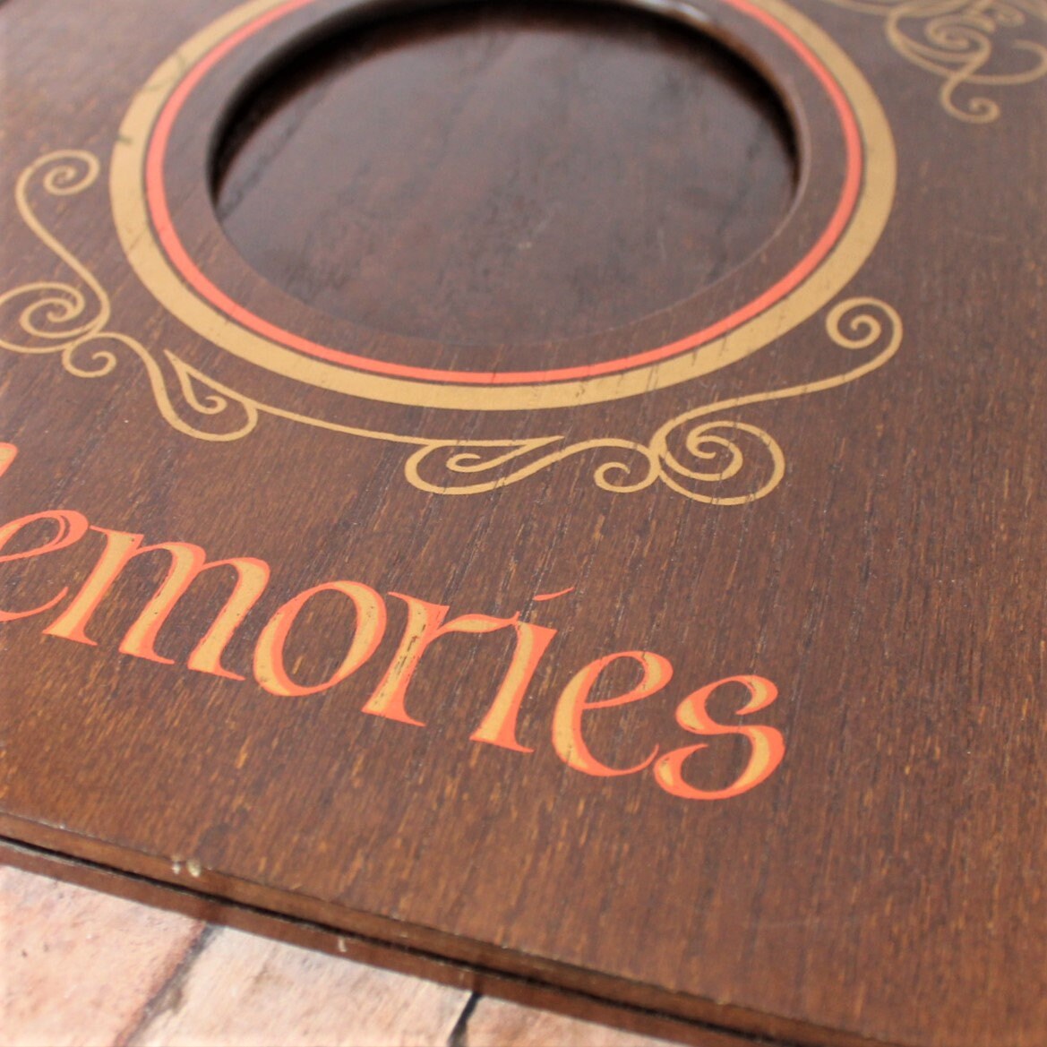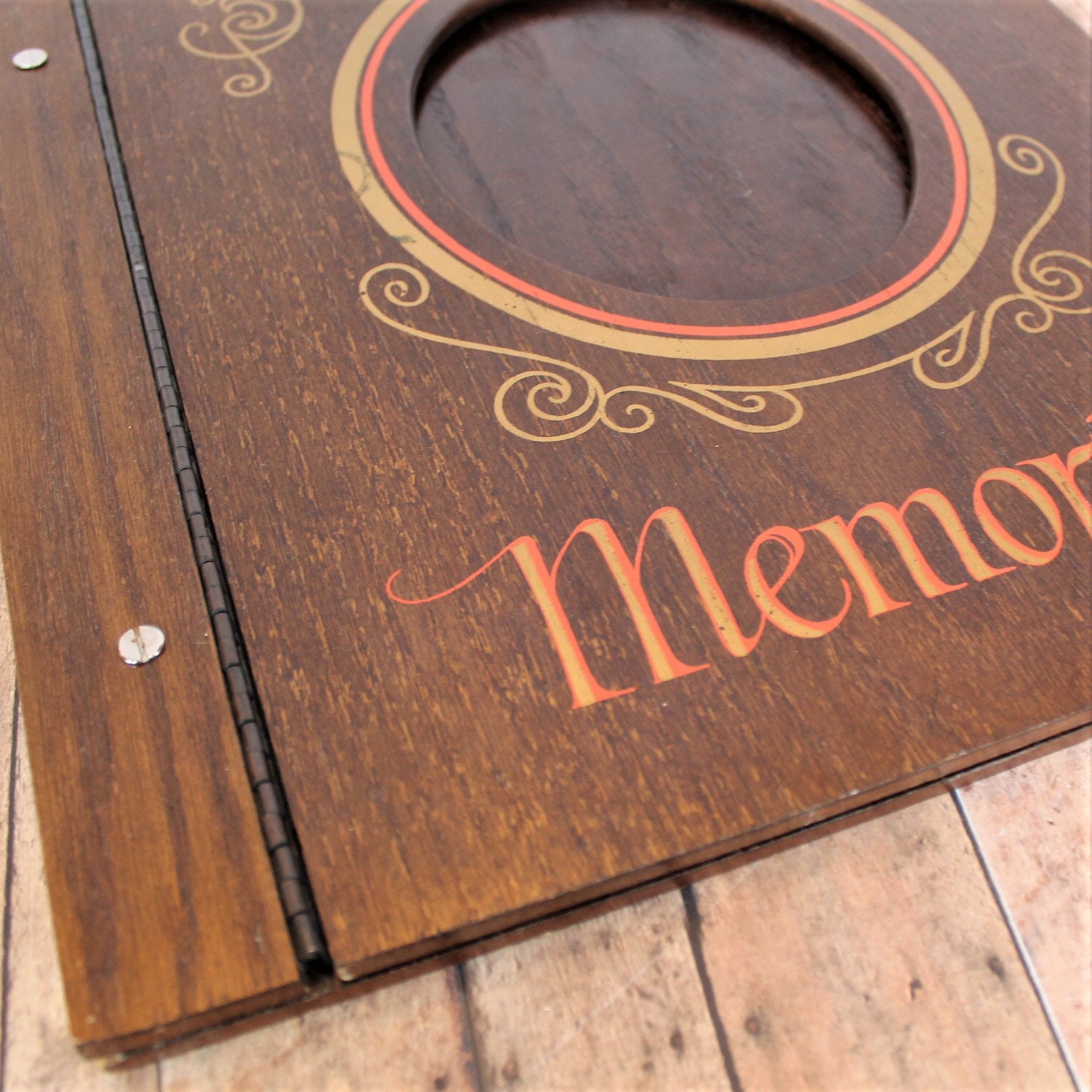 This vintage wooden scrapbook album is 14" long and 13" wide. It has 2 wooden panels with a hinged section on the front panel. The front panel also has an oval cut-out opening, and is decorated with a gold scroll design around the opening. The album says "Memories" on the front. The album opens like a book with the hinged cover, and the cover can lie completely flat. The are 2 posts for attaching pages, the those openings are 8.75" apart.