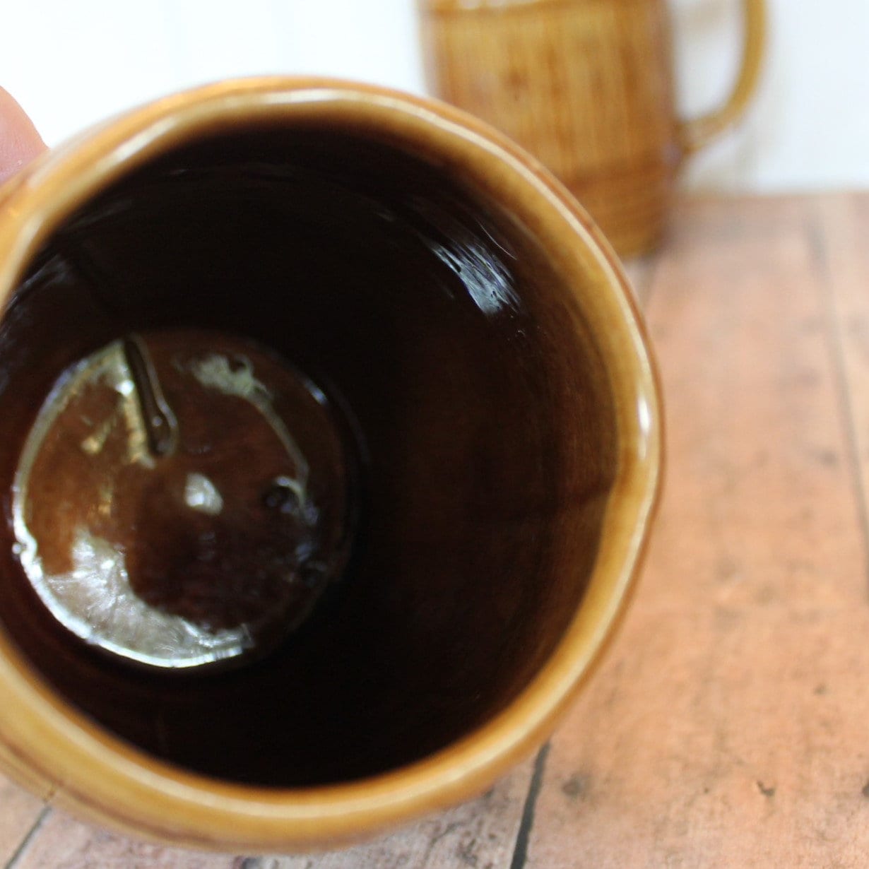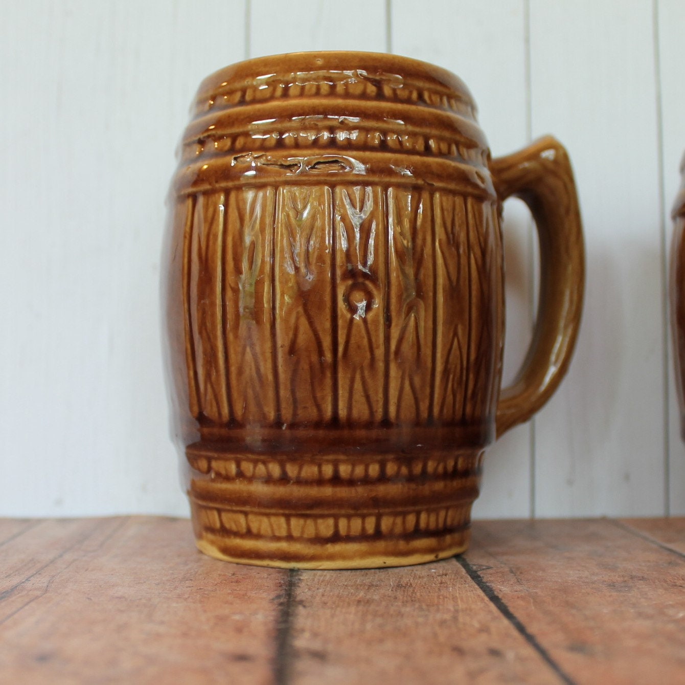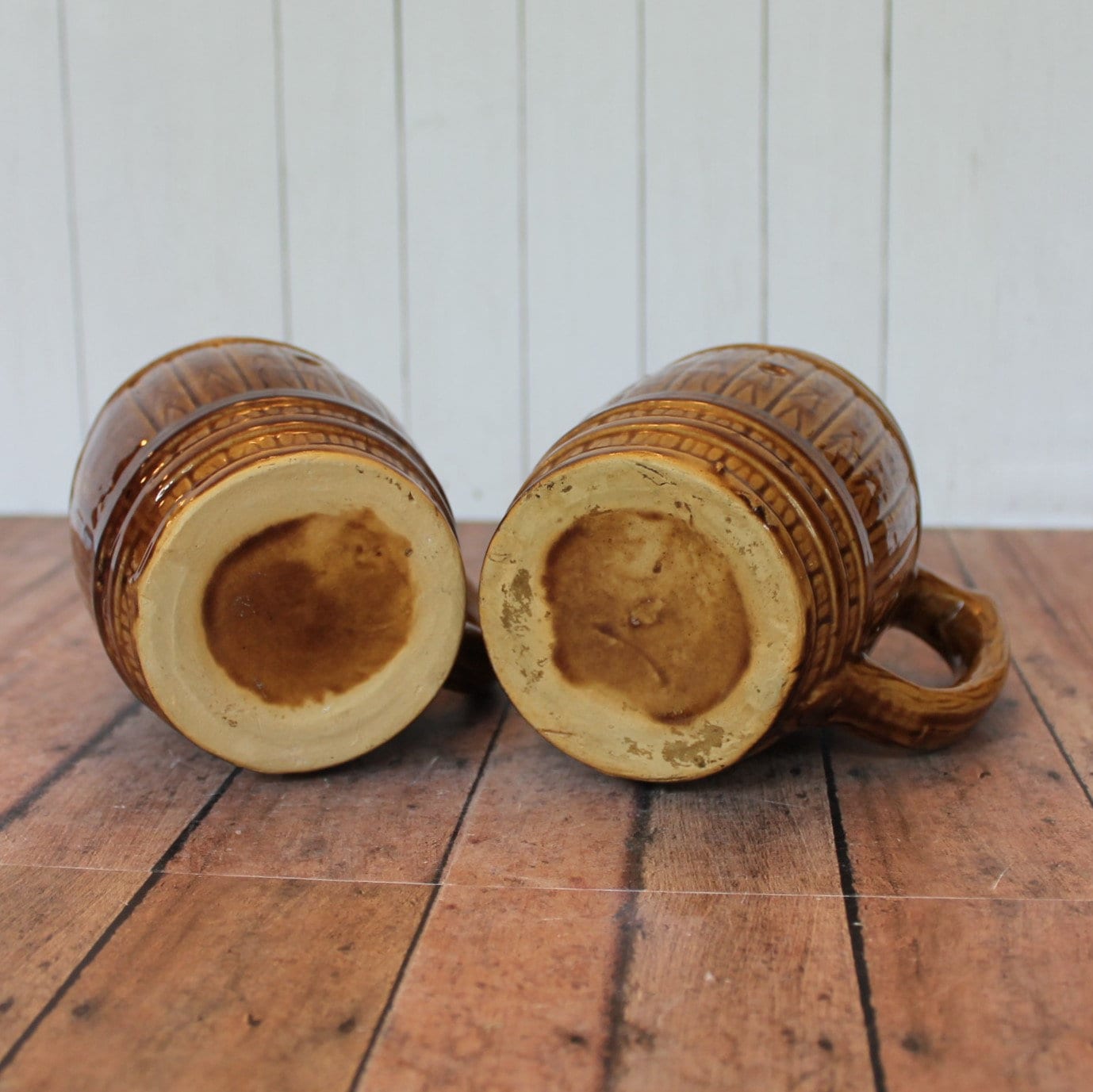 Both mugs are in very nice condition with no chips or cracks. These are rustic pieces and they do have imperfections in the surface of the ceramic from production. There are some chunky ceramic pieces on the insides of the mugs, under the glaze. Great set of old barrel mugs for your bar or man cave!