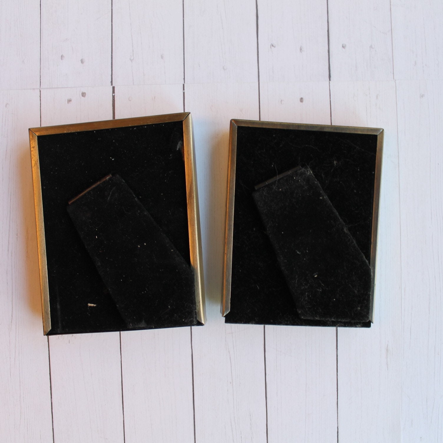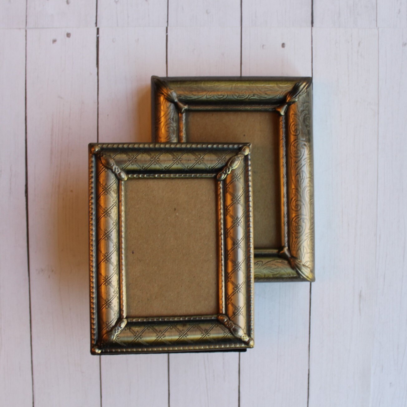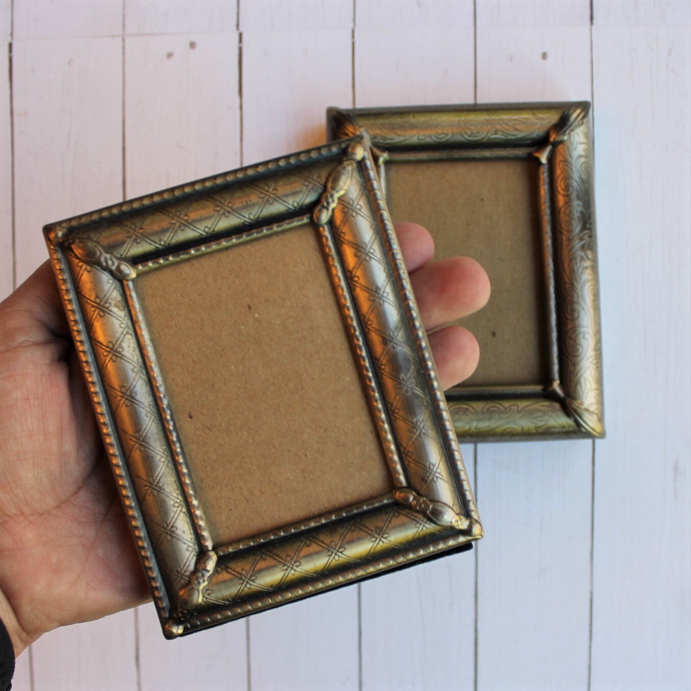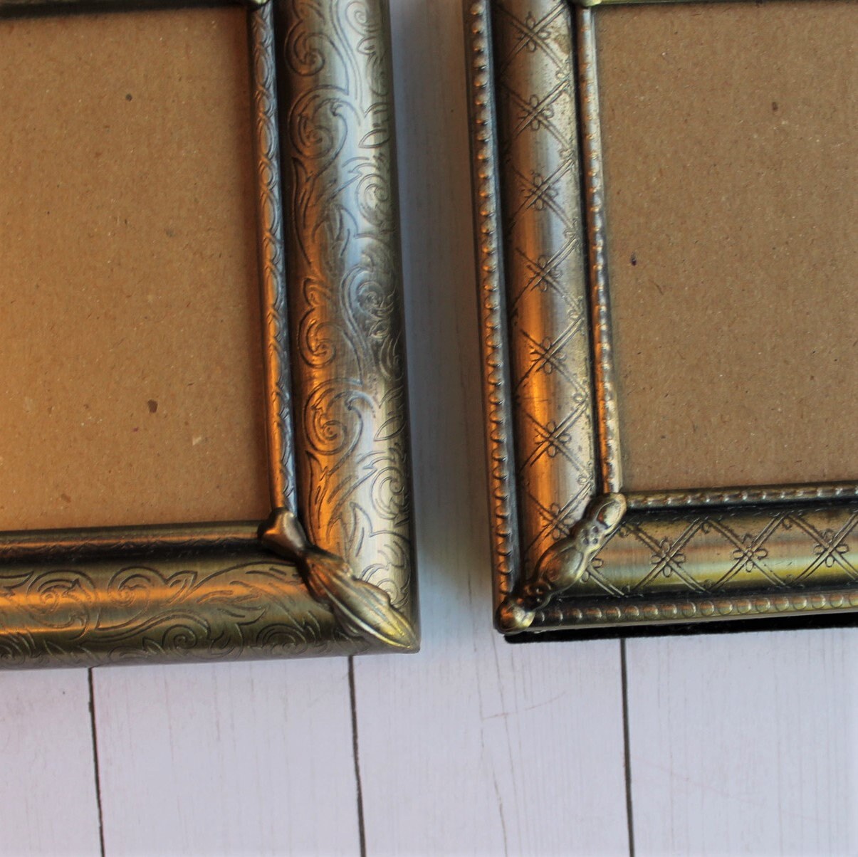 This set of frames includes 2 coordinating frames in a bronze color. These bronze or brass colored frames have a simple and elegant lightly etched designs - one with a diamond pattern and one with scrolling branches and leaves. Each corner is accented with an applied metal leaf shape. The photo openings are 2"x3", and the outside of the frames measure 3.75" x 4.75" and the frames are 3/4" thick. They all include the glass, filler cardboard, and the backing piece with photo stand that is covered in a black velvet material. These frames originally had labels on them from The Weston Gallery before I removed them to clean the frames.