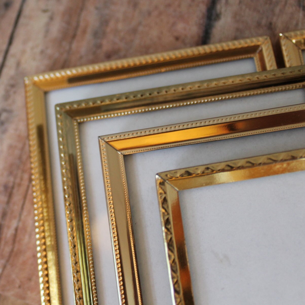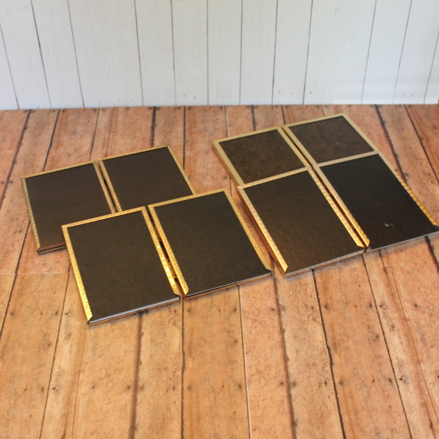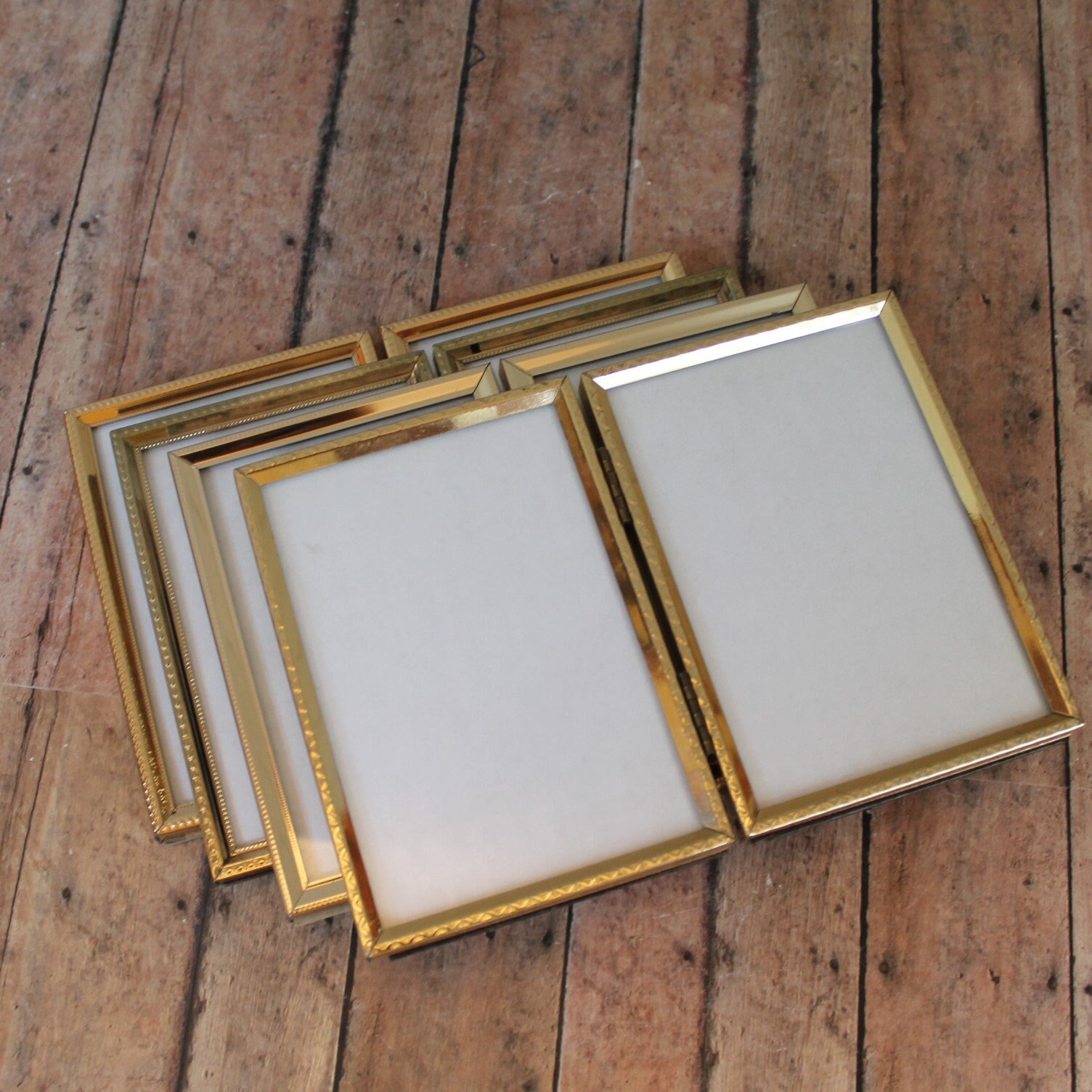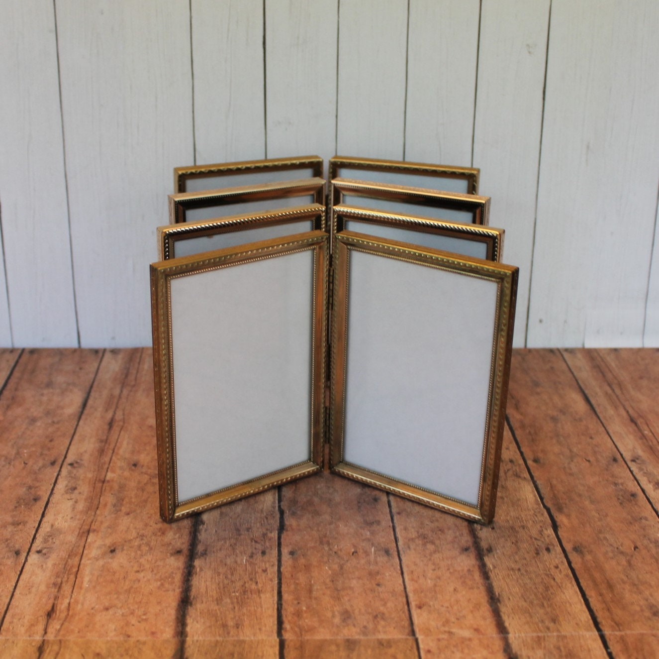 This set of brass frames includes four 3 1/2" x 5" double hinged frames, all in different designs and patterns. They are all a golden brass colored metal, and have nicely detailed designs around the edges. The overall dimensions of the frames are 7 1/2" wide by 5 1/4" tall. They each have a clear glass insert that covers the photo opening. Great set of vintage brass frames!