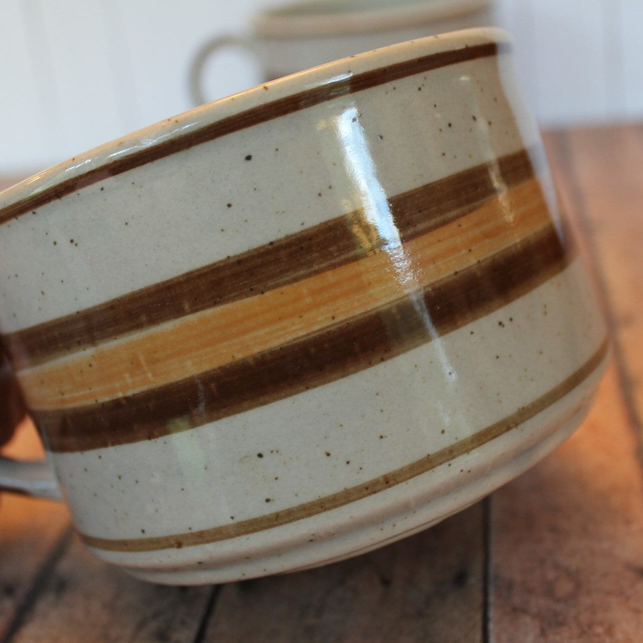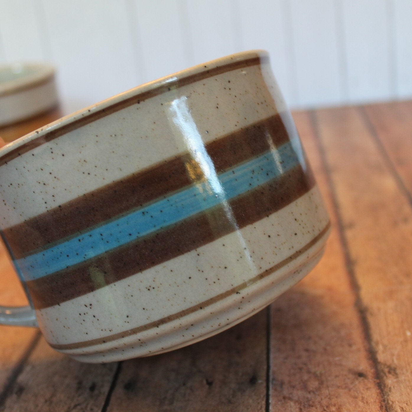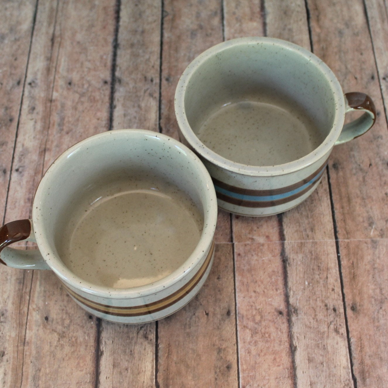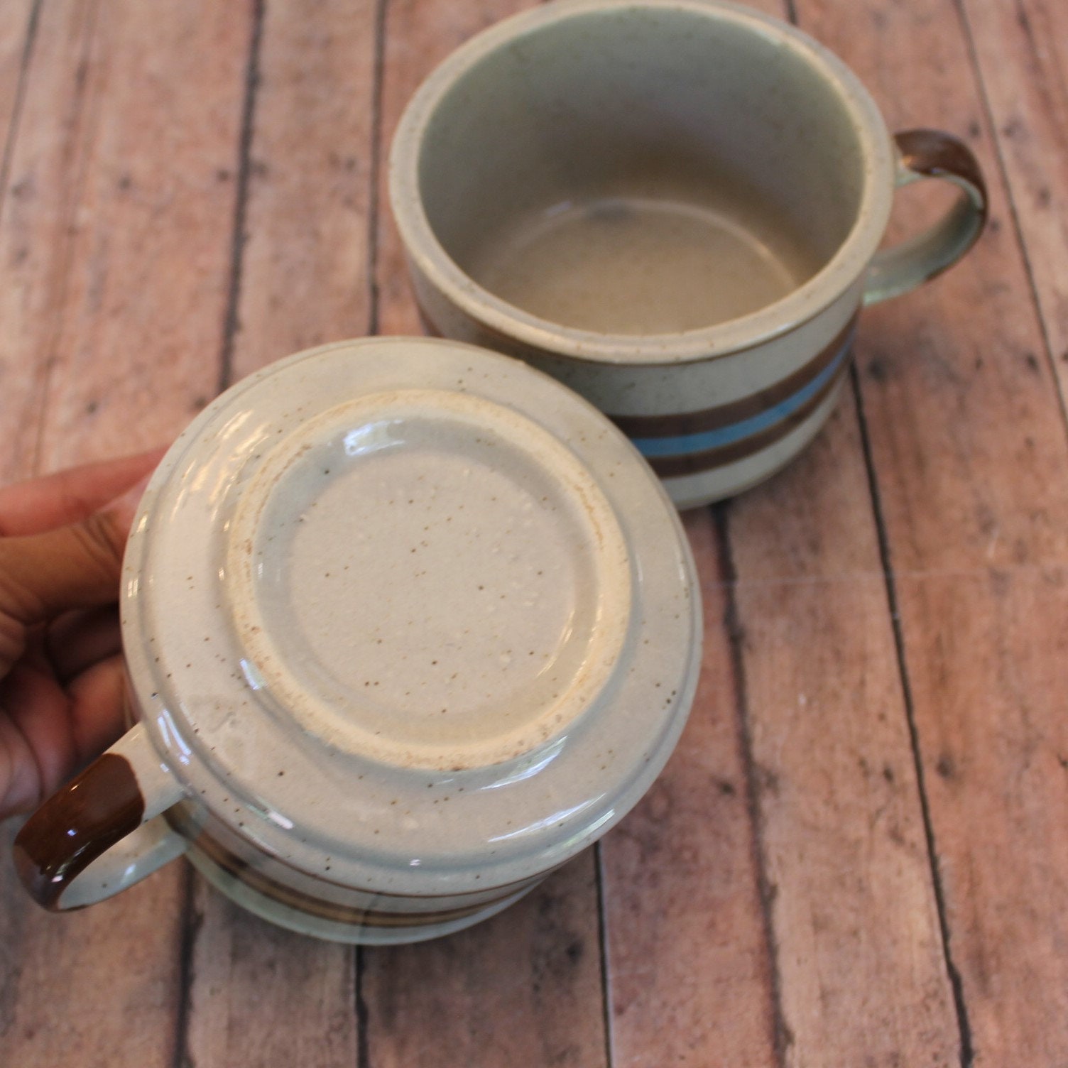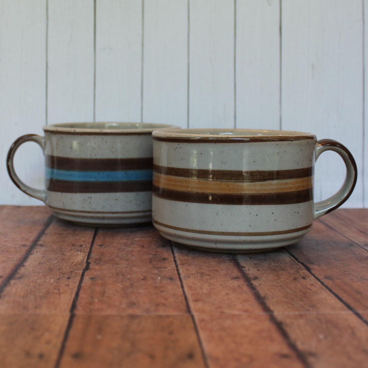 This set of 2 soup bowls or soup mugs includes 2 coordinating bowls in similar patterns. The bowls are a light gray stoneware with a brown bands around the bowl - one with a blue accent band, one with orange. Each bowl is 3.25" in diameter and 4.75" high. With the handle, they are 6" wide.