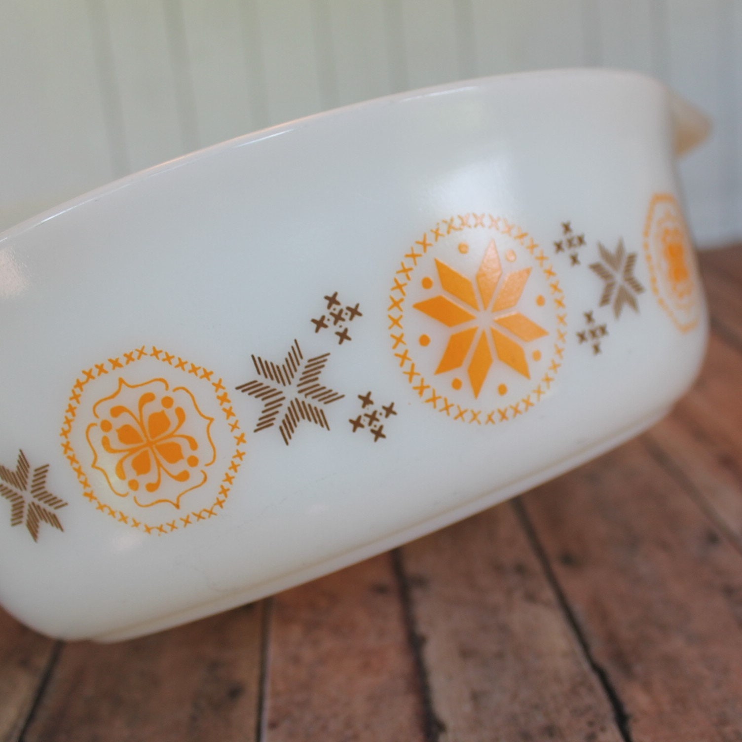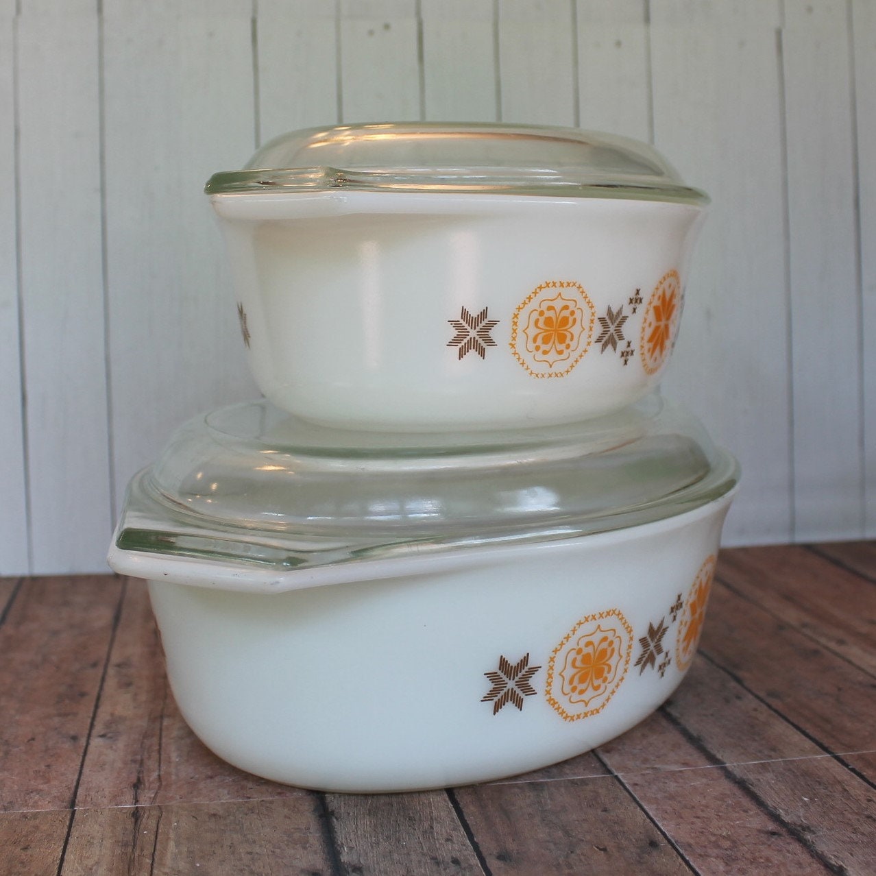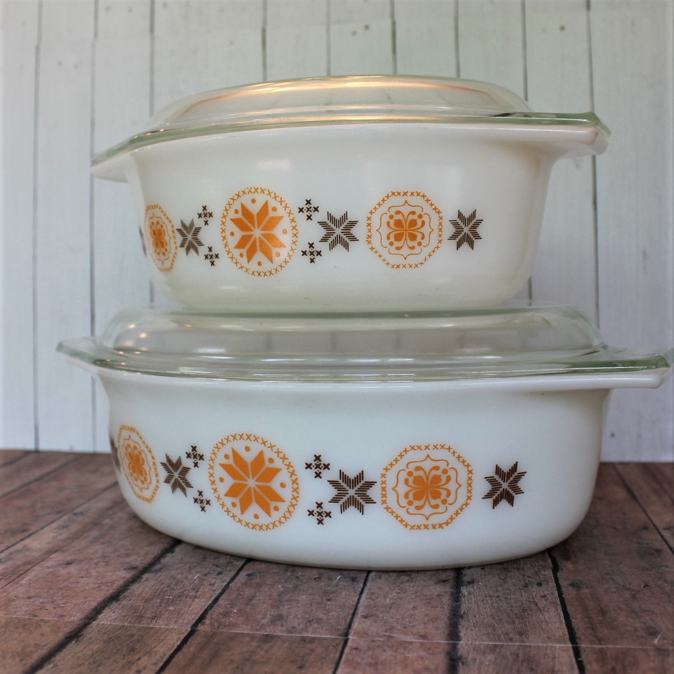 This lovely set of Pyrex casserole dishes includes 2 oval casserole dishes in the Town and Country pattern. There is one 1 1/2 Qt. Dish (style 043) and one 2 1/2 Qt. dish (style 045.) They are a white glass, and have orange and brown starburst or floral medallion design on both sides of the dish. The bottoms of both dishes are marked: PYREX / MADE IN USA, and one is marked 043 1 1/2 QT, and the other is marked 045 2 1/2 QT. The dishes includes lids - a 943C lid for the smaller dish, and a 945C lid for the larger dish.