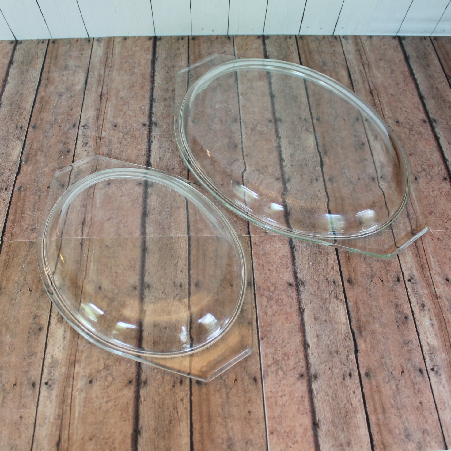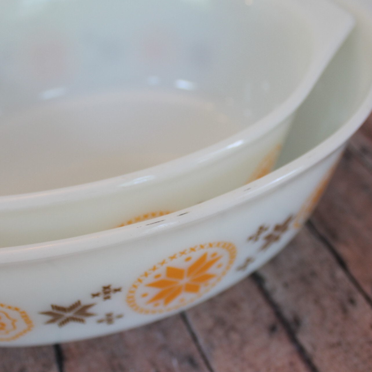 Both dishes are in very nice condition with no chips or cracks. There is a small black marking along the rim of the larger dish. Both lids do show some wear and have scratches, and the larger lid also have a thin chip on one of the handles - it is a thin but long chip along the handle - this is shown in detail in the last 2 photos.