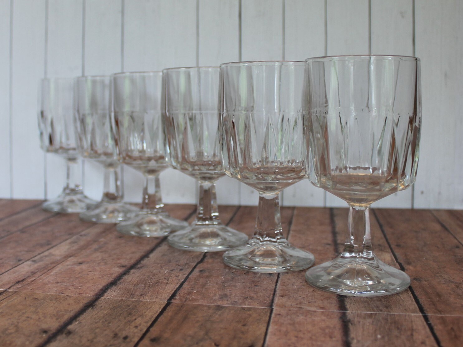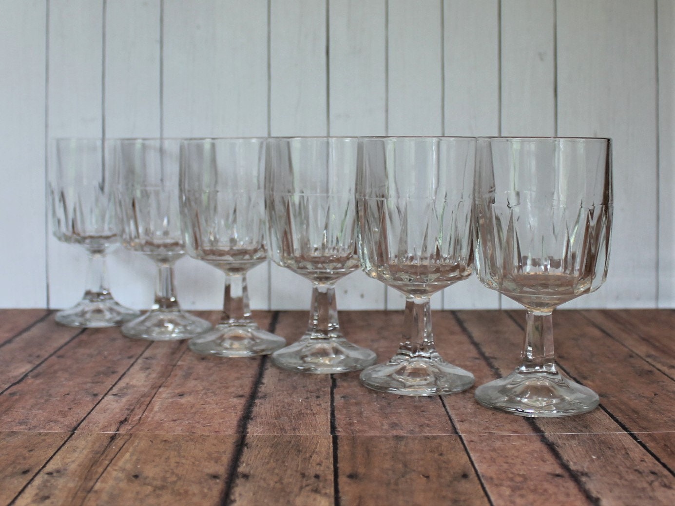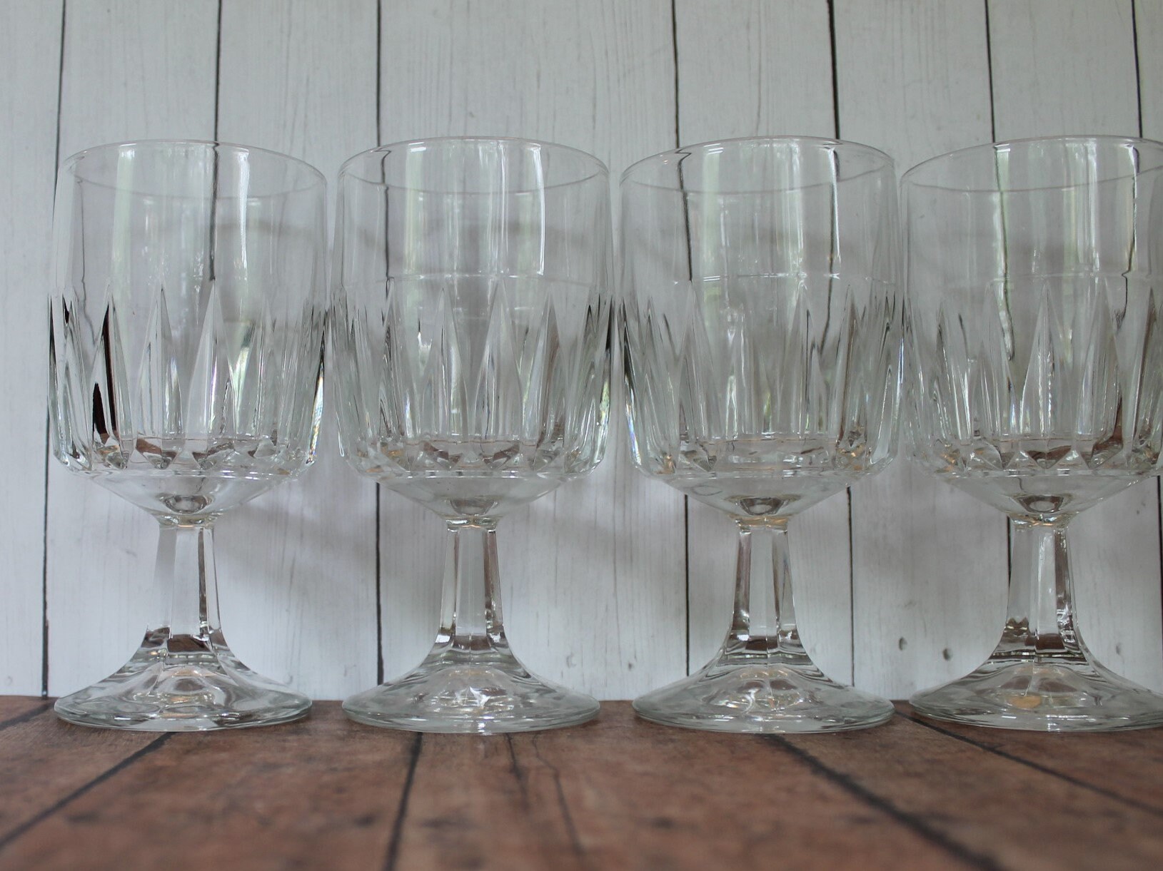 This set of 2 clear wine glasses by Libbey are in the Winchester pattern. They are each 5 1/4" tall and 2 3/4" in diameter. They are a smooth class with vertical diamond designs along the bottom of the glass. These glasses were introduced by Libbey in 1983, and this popular and stylish pattern is still being made today. Each glass can hold 6 ounces filled to the rim.