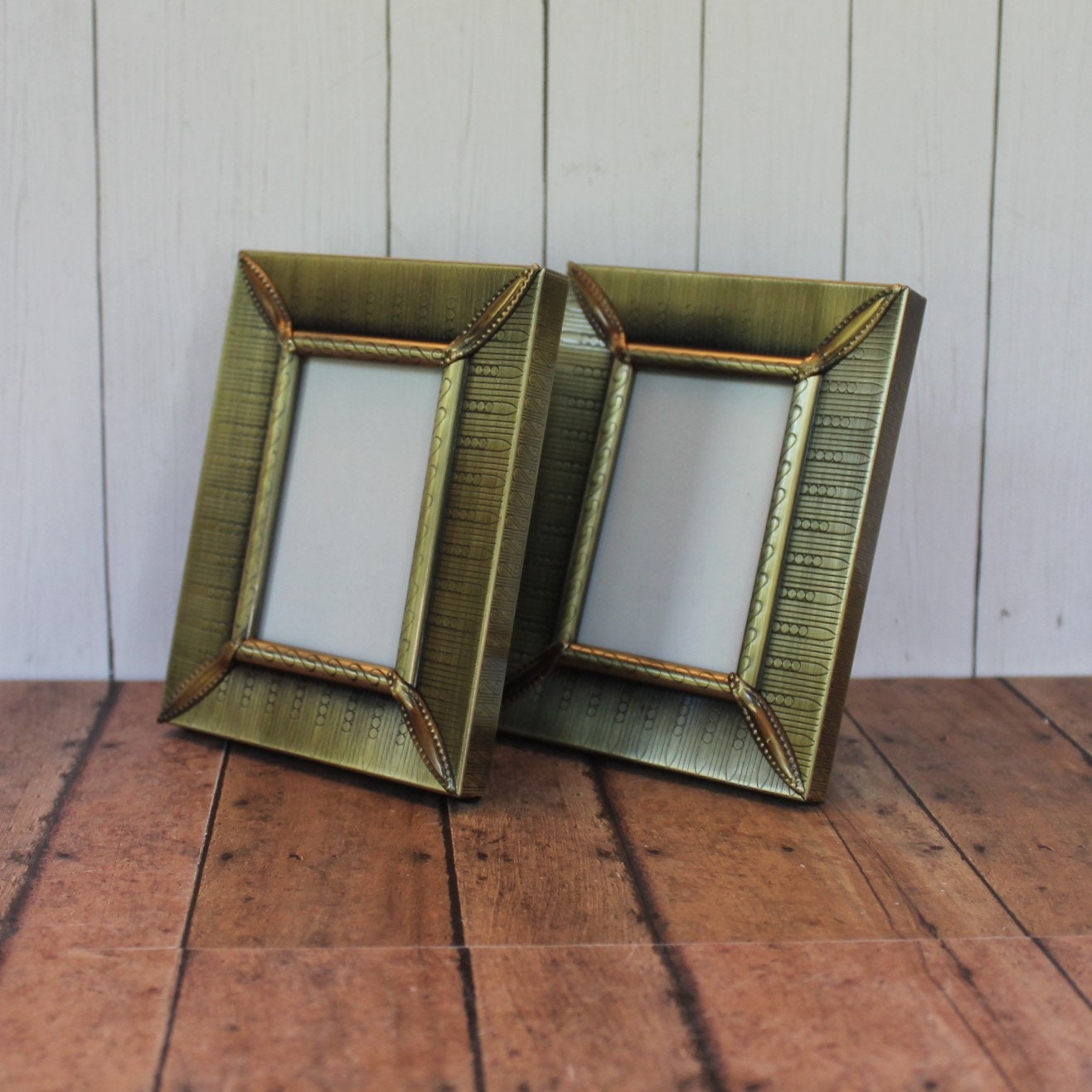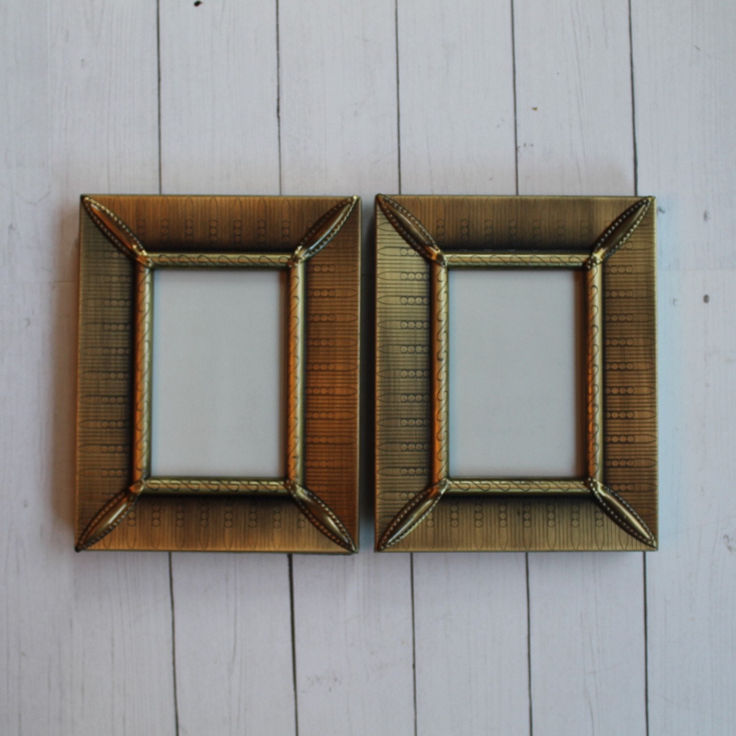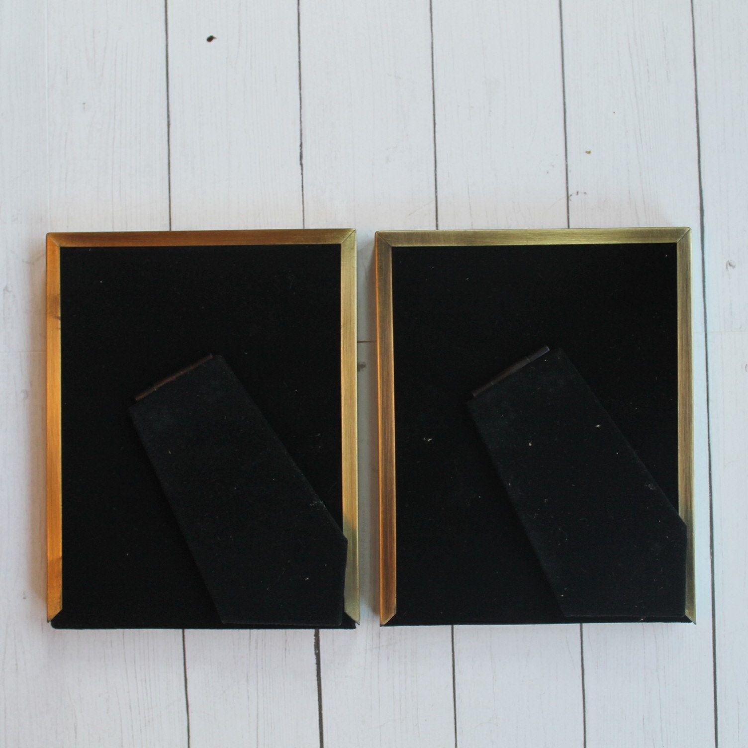 This set of frames includes 2 matching frames in a bronze color. These bronze or brass colored frames have a lightly etched design with a modern geometric pattern. Each corner is accented with an applied metal leaf shape. The photo openings are 2"x3", and the outside of the frames measure 4" x 5" and the frames are 1/2" thick. They all include the glass, filler cardboard, and the backing piece with photo stand that is covered in a black velvet material. These frames originally had labels on them from The Weston Gallery before I removed them to clean the frames.