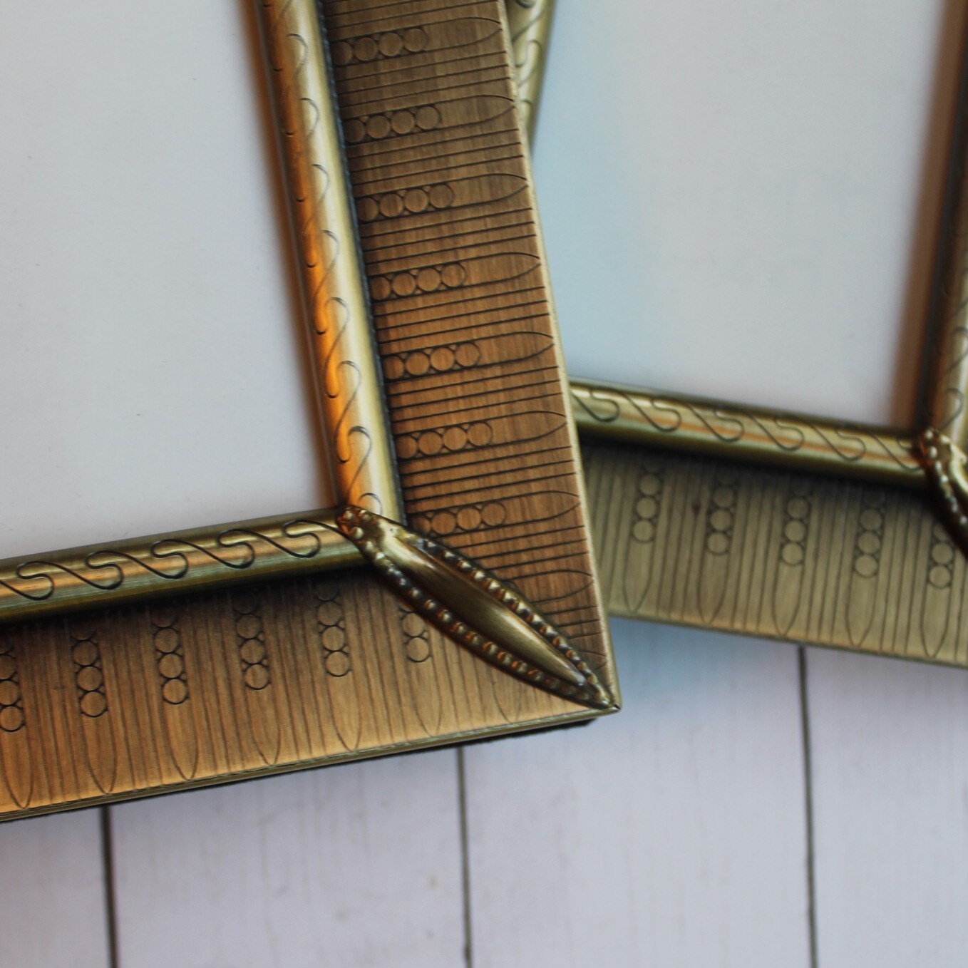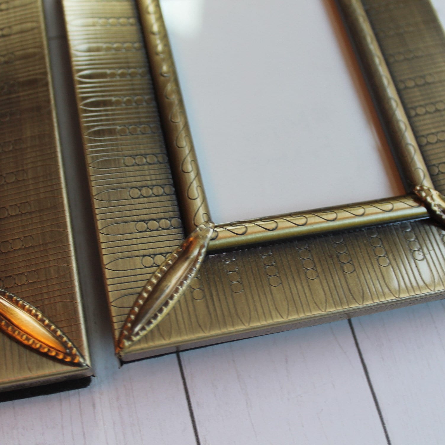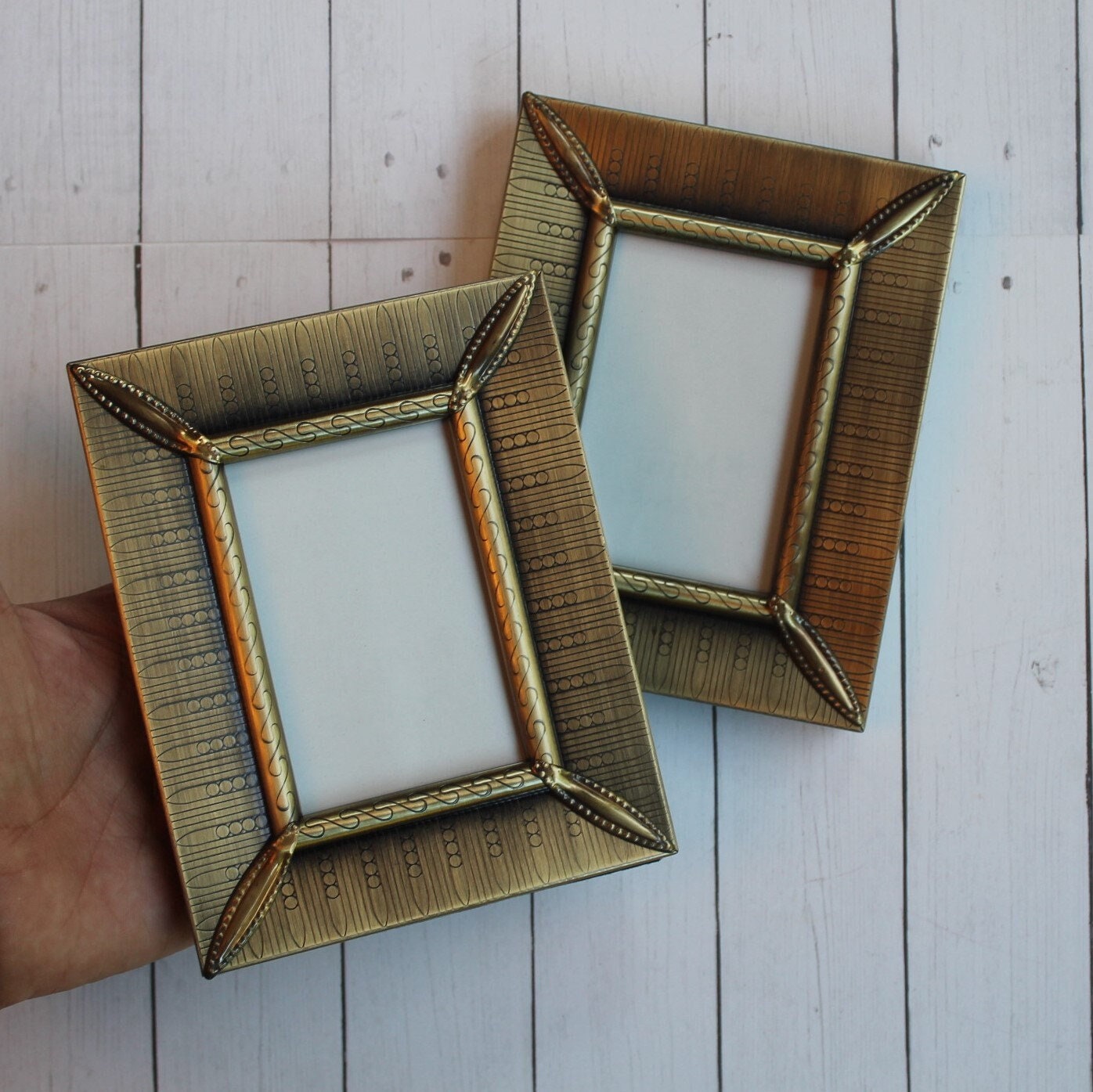 This set of frames includes 2 matching frames in a bronze color. These bronze or brass colored frames have a lightly etched design with a modern geometric pattern. Each corner is accented with an applied metal leaf shape. The photo openings are 2"x3", and the outside of the frames measure 4" x 5" and the frames are 1/2" thick. They all include the glass, filler cardboard, and the backing piece with photo stand that is covered in a black velvet material. These frames originally had labels on them from The Weston Gallery before I removed them to clean the frames.