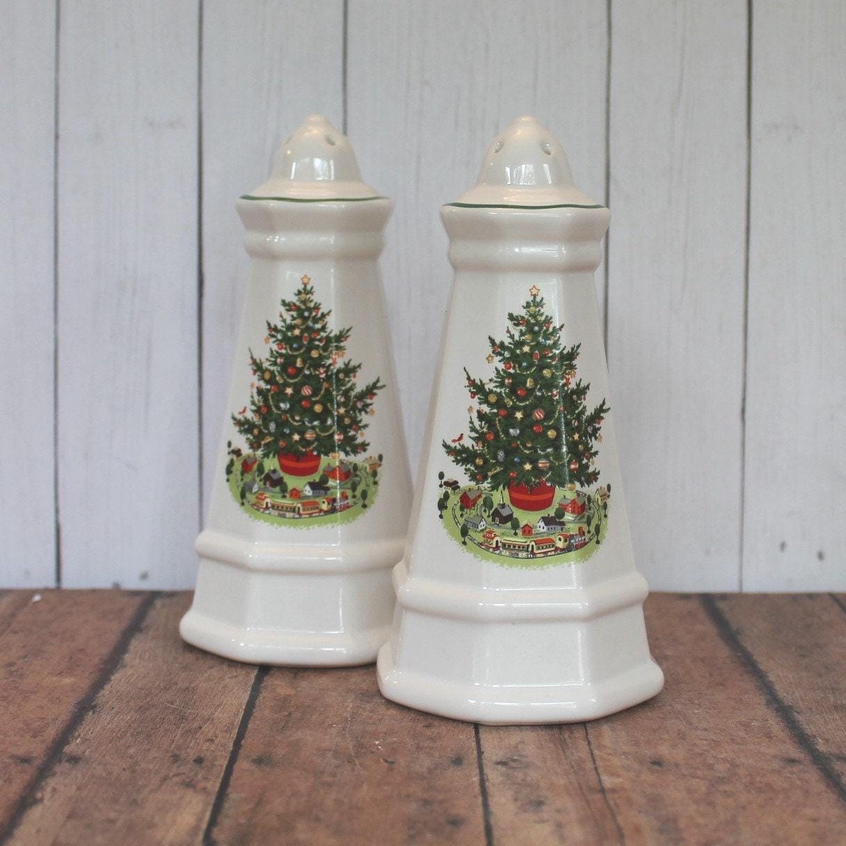 This set of salt and pepper shakers by Pfaltzgraff are in the Christmas Heritage pattern. They are each 6" tall and 2.75" in diameter at the base. They are a white ceramic, and are decorated on the front with a Christmas Tree design and a village and train under the tree. The rim is also accented with a green band. The bottoms are marked with the Pfaltzgraff logo, and both have their original plastic stoppers.