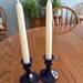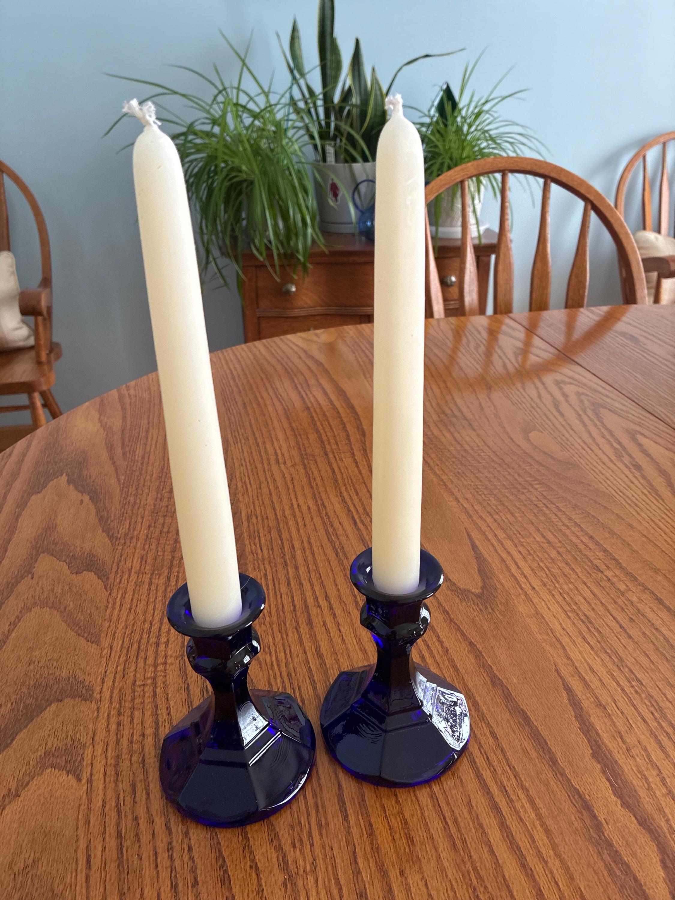 This set of 2 candle holders by Indiana glass includes 2 short blue candle holders. They measure 4.25" tall, 3.75" in diameter at the base, and 1.5" in diameter at the top. They have a 3/4" opening at the top to hold a taper candle or a glass votive cup. Both of the candlesticks are in very good condition with no chips or cracks. Great pair of blue glass candlesticks!