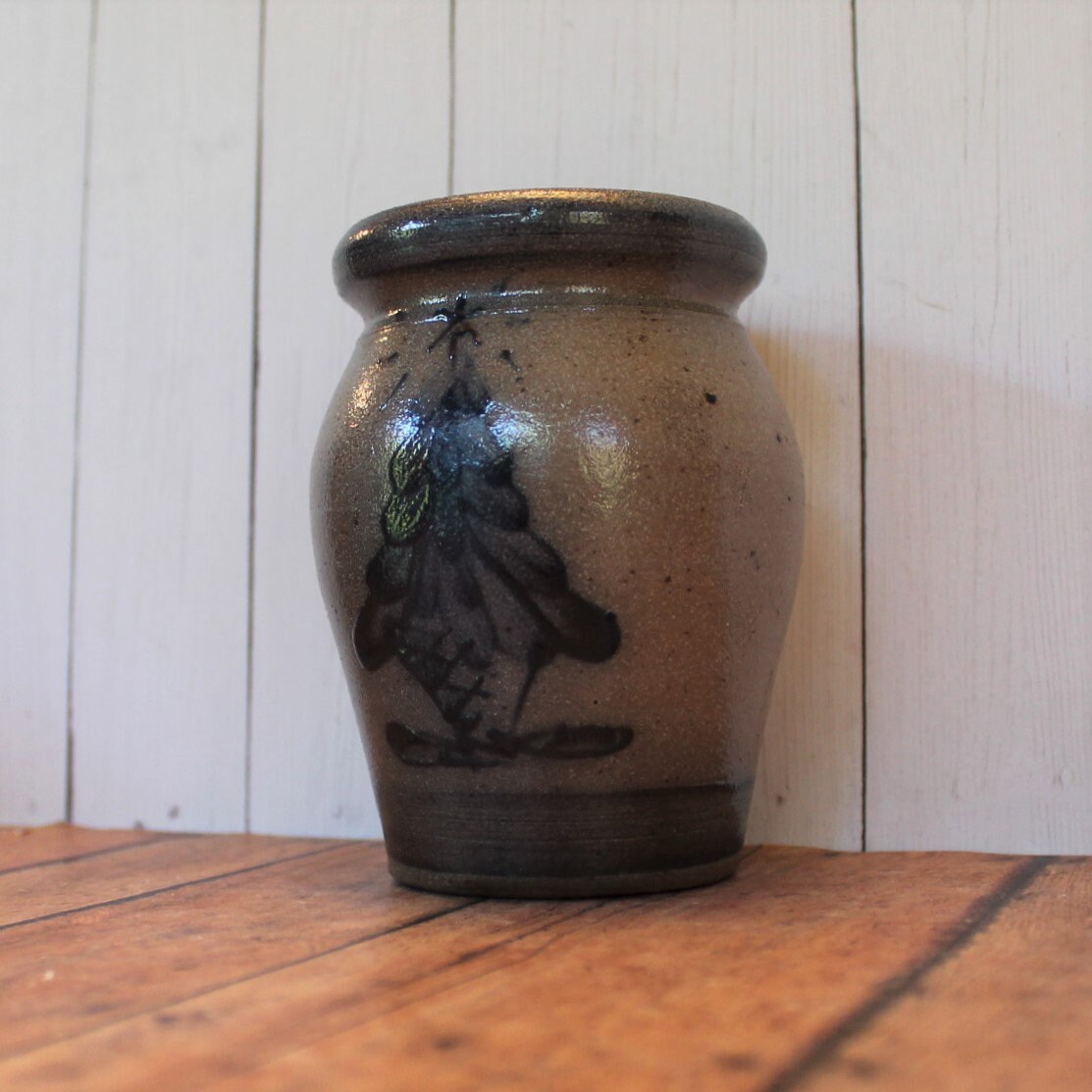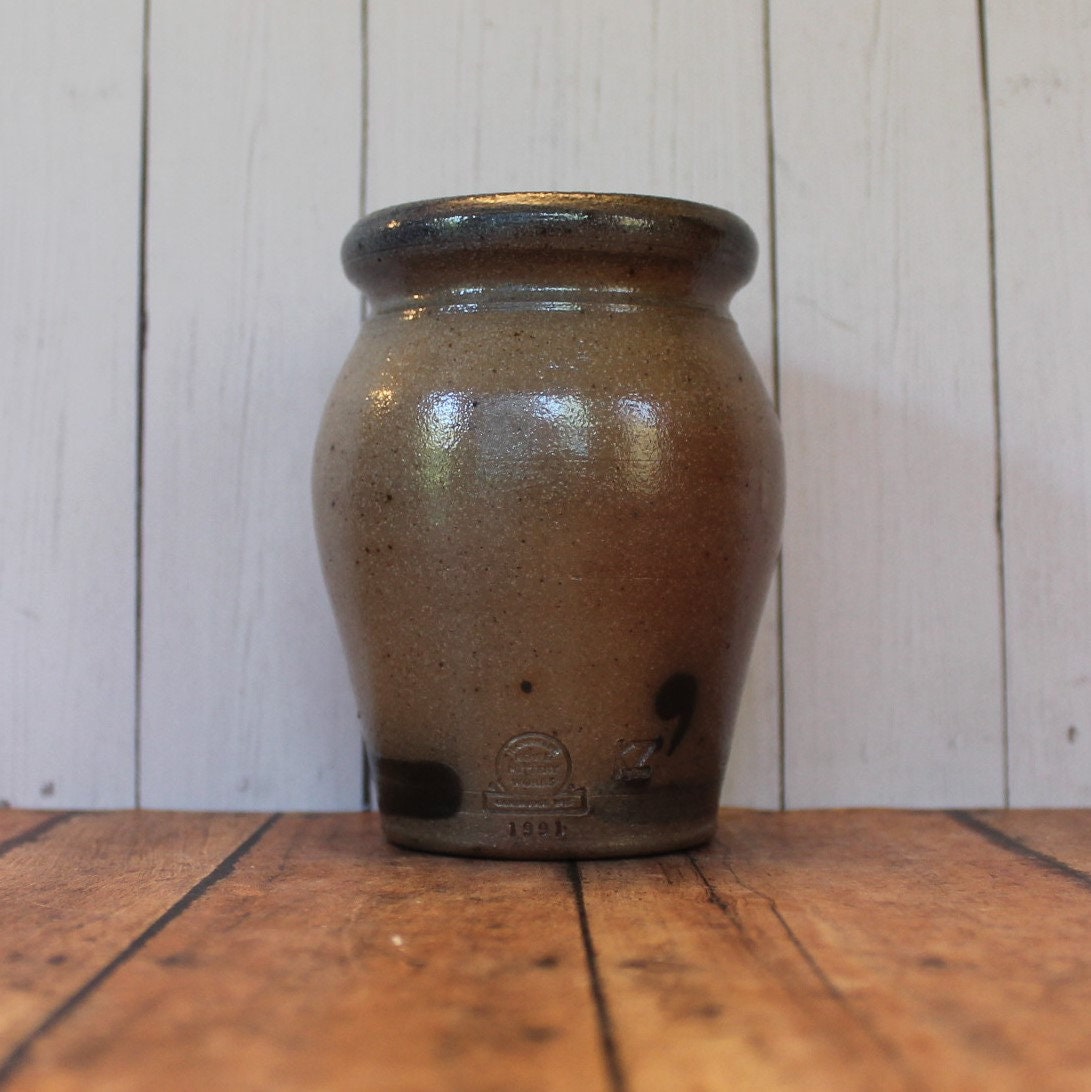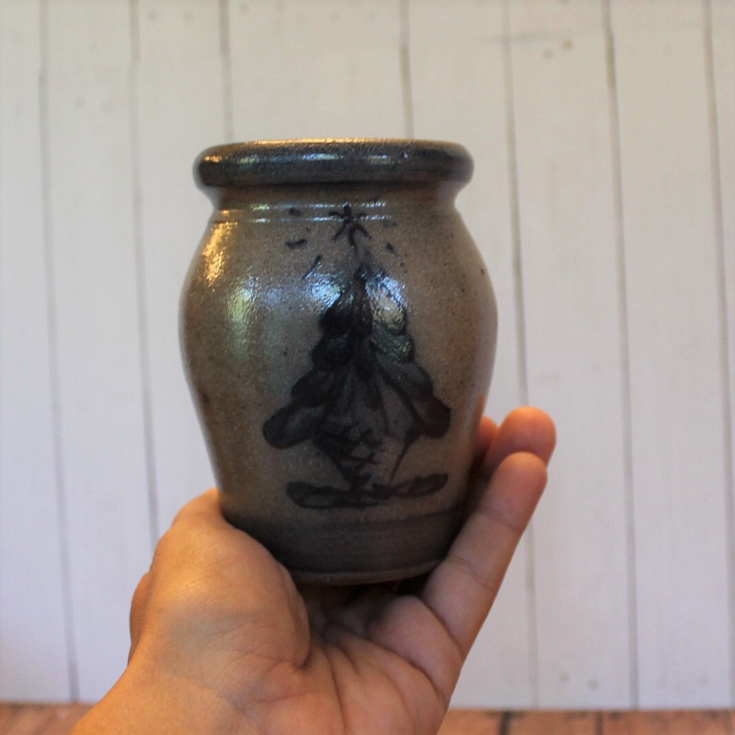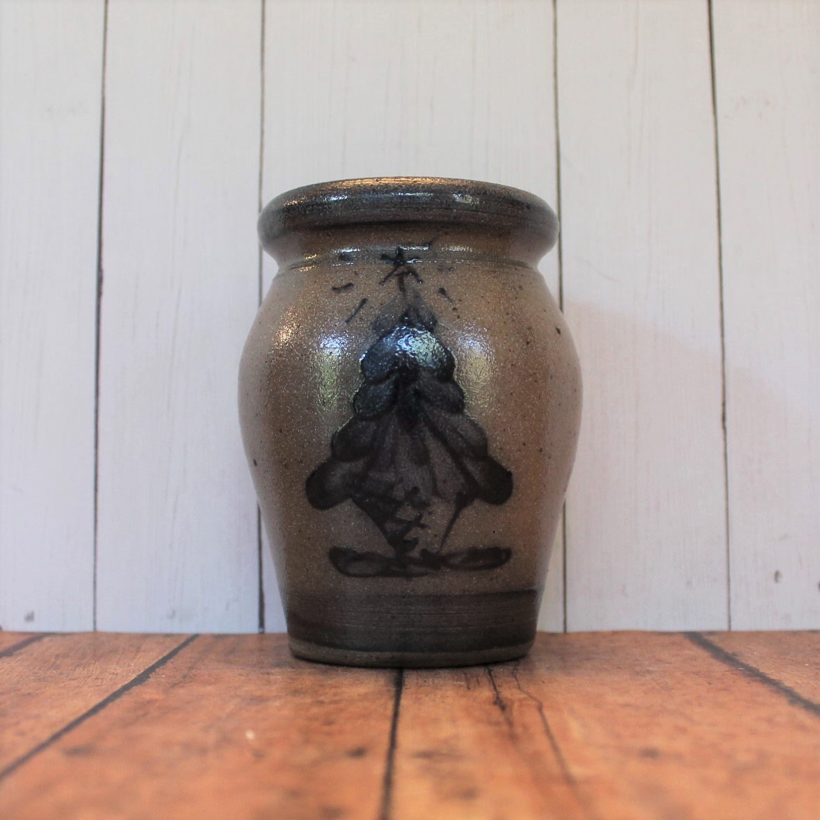 This Rowe Pottery Works small crock or spice jar bowl is 3.5" in diameter and 4.5" tall. It is a gray stoneware and has a hand painted Christmas Tree design on the front of the crock. The top is open and has a crock stopper. The back is stamped with the Rowe Pottery Works Logo, 1991, and KZ.