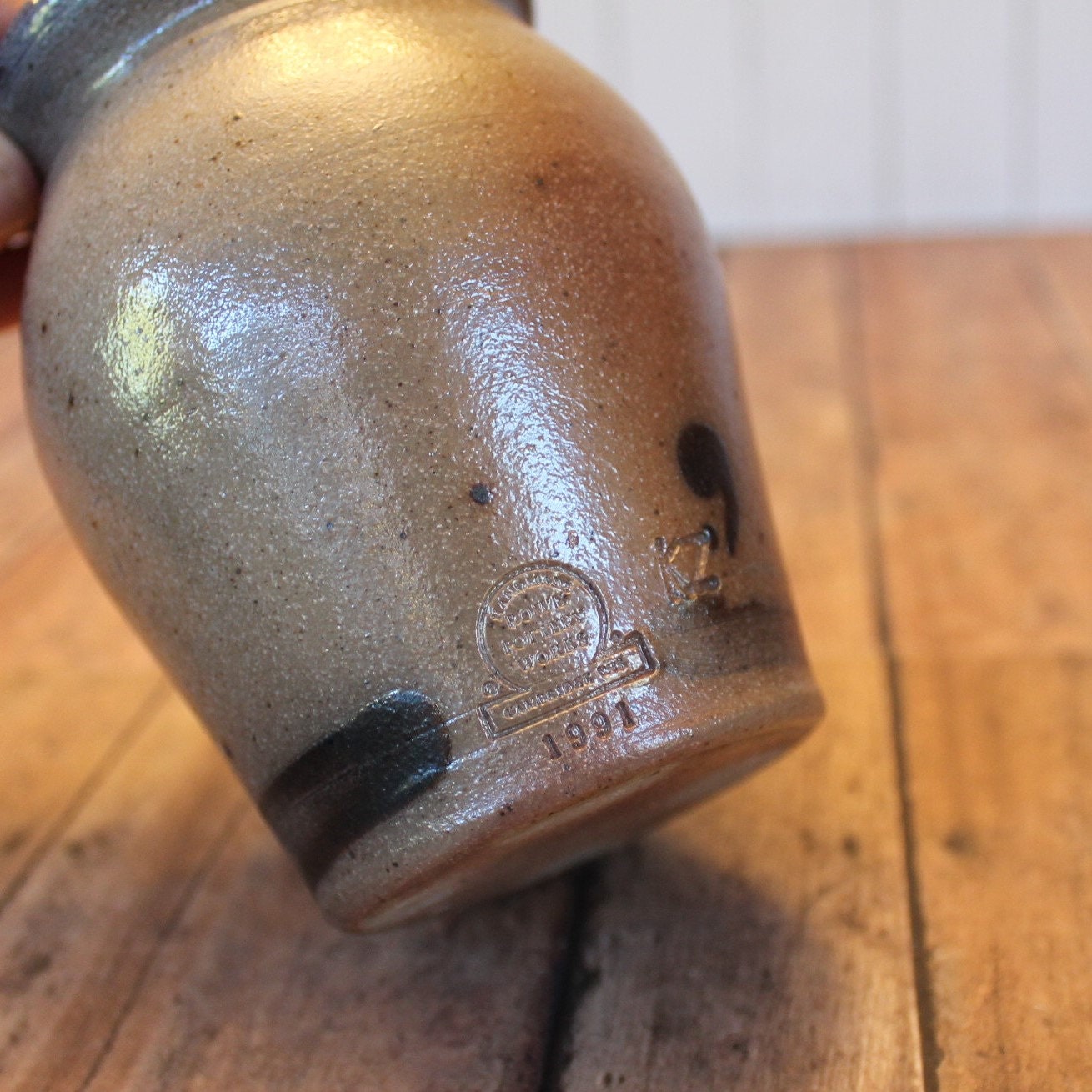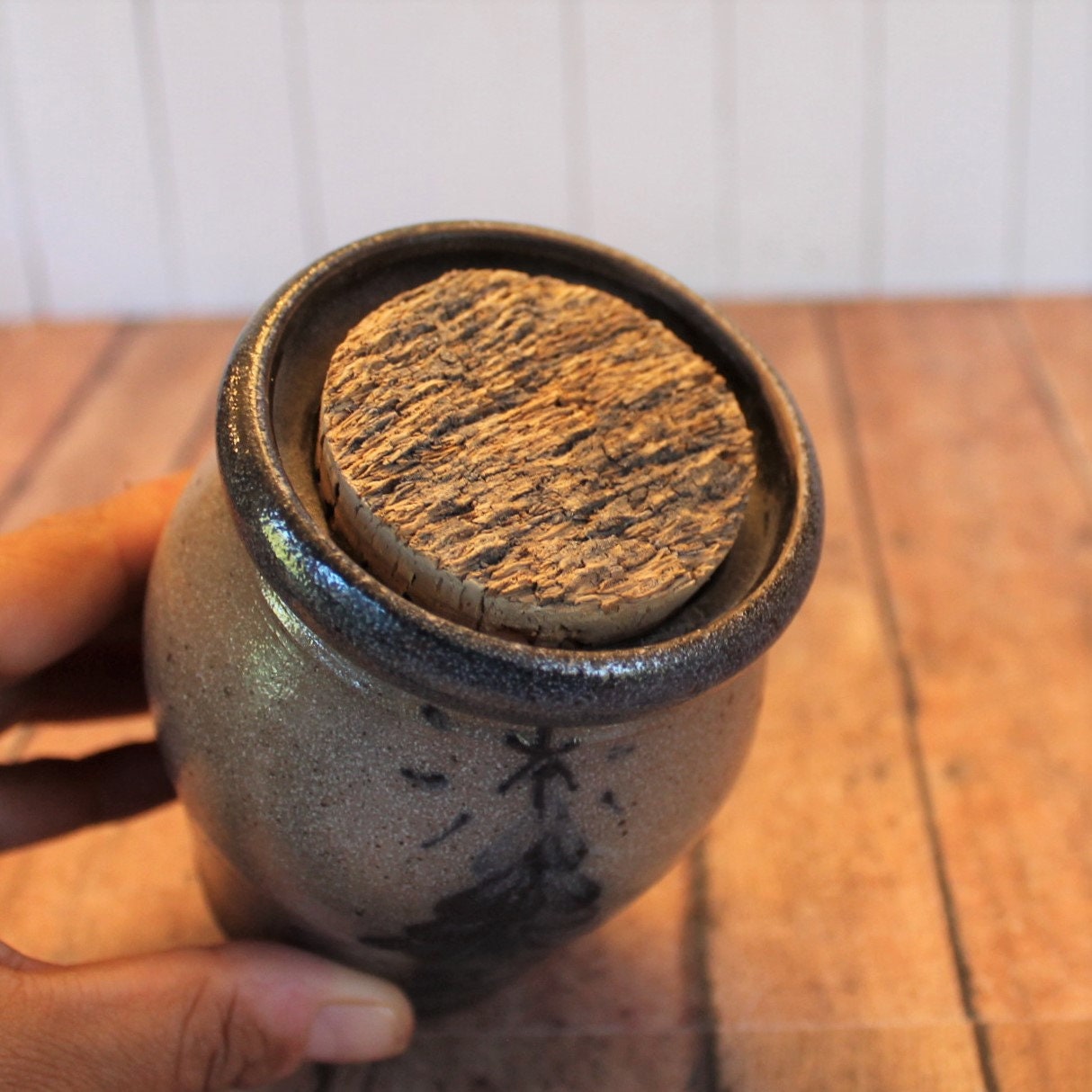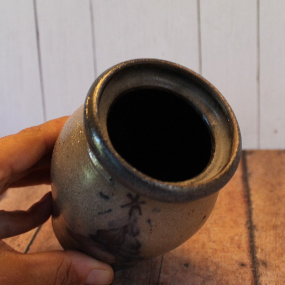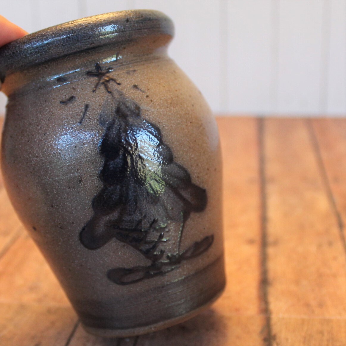 This Rowe Pottery Works small crock or spice jar bowl is 3.5" in diameter and 4.5" tall. It is a gray stoneware and has a hand painted Christmas Tree design on the front of the crock. The top is open and has a crock stopper. The back is stamped with the Rowe Pottery Works Logo, 1991, and KZ.