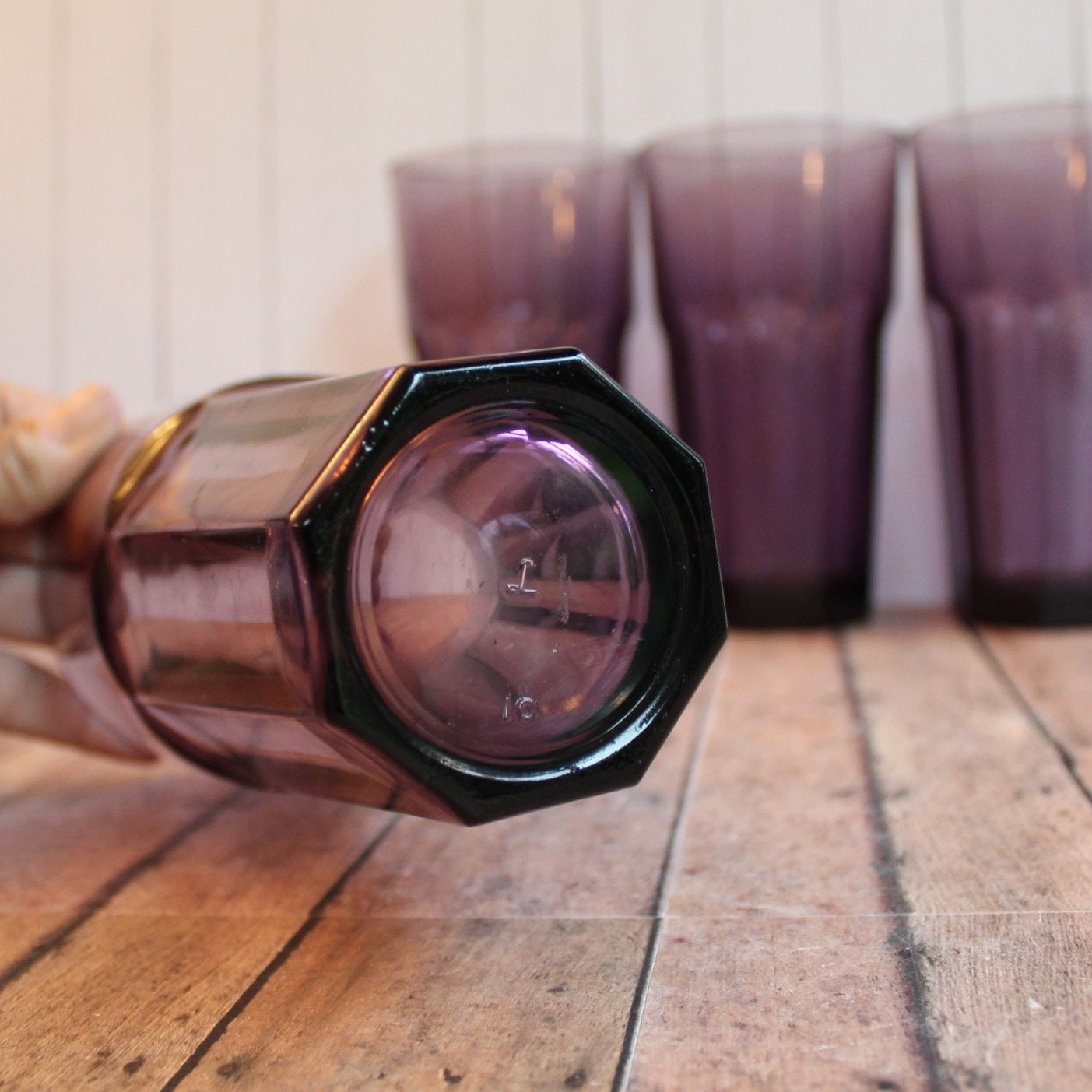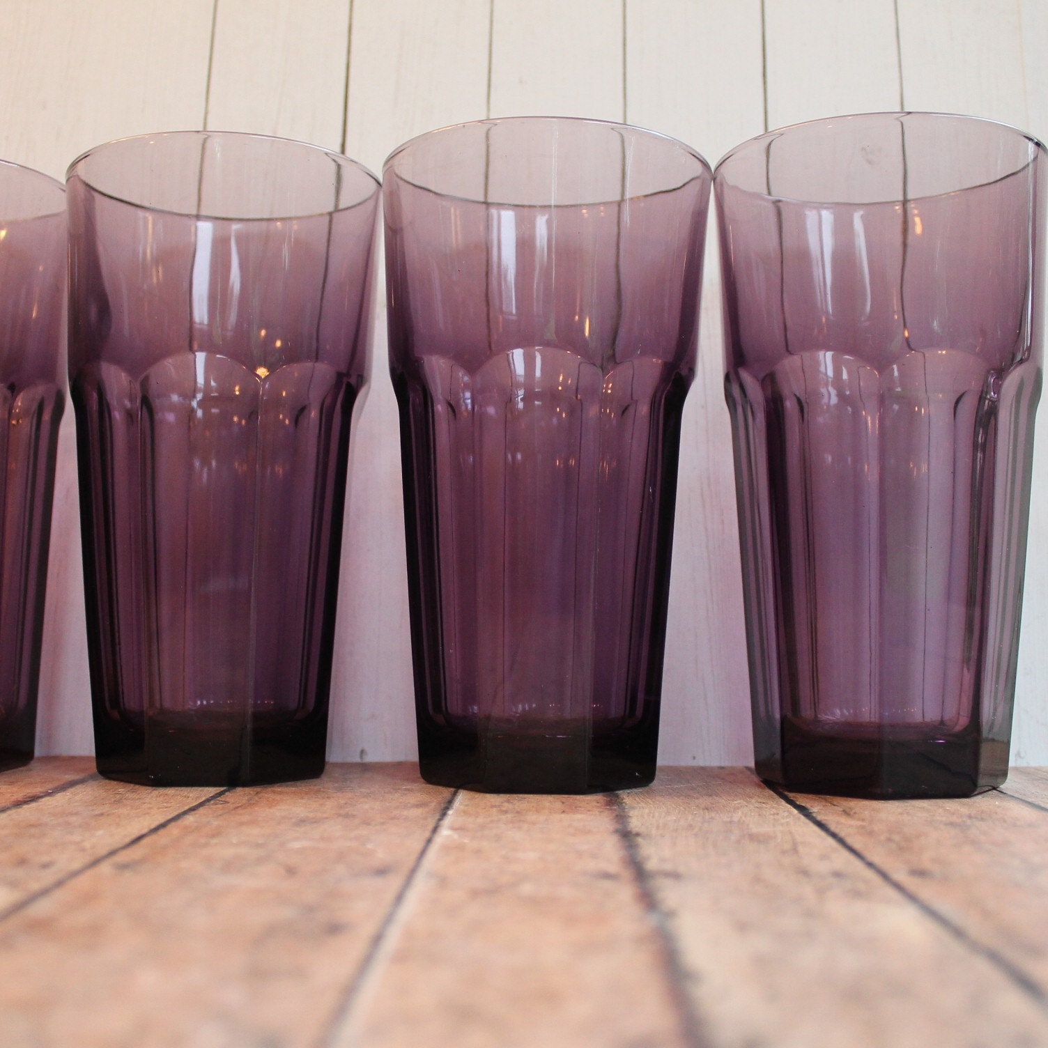 This set of 4 glasses by Libbey Glass are in the Gibraltar pattern and are the 6" Cooler glasses. They are each 6.25" tall and 3.5" in diameter. They are a pretty violet color and have a flat paneled design around the glass. Each glass can hold 16 oz. filled to the rim. The bottom is marked with the Libbey "L" logo.