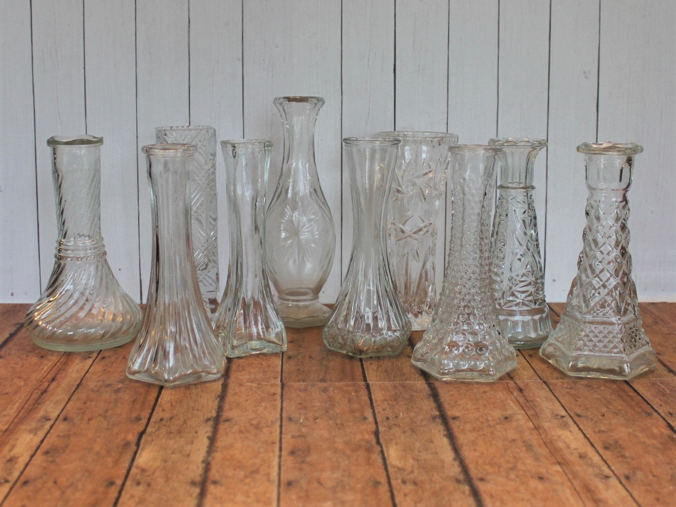 This set of 10 small vases includes 12 clear glass vases in different patterns and shapes. They range in height from 6" to 7" tall, and 2" to 4" in diameter. They are all clear glass vases with different floral, geometric, ribbed, and diamond designs.