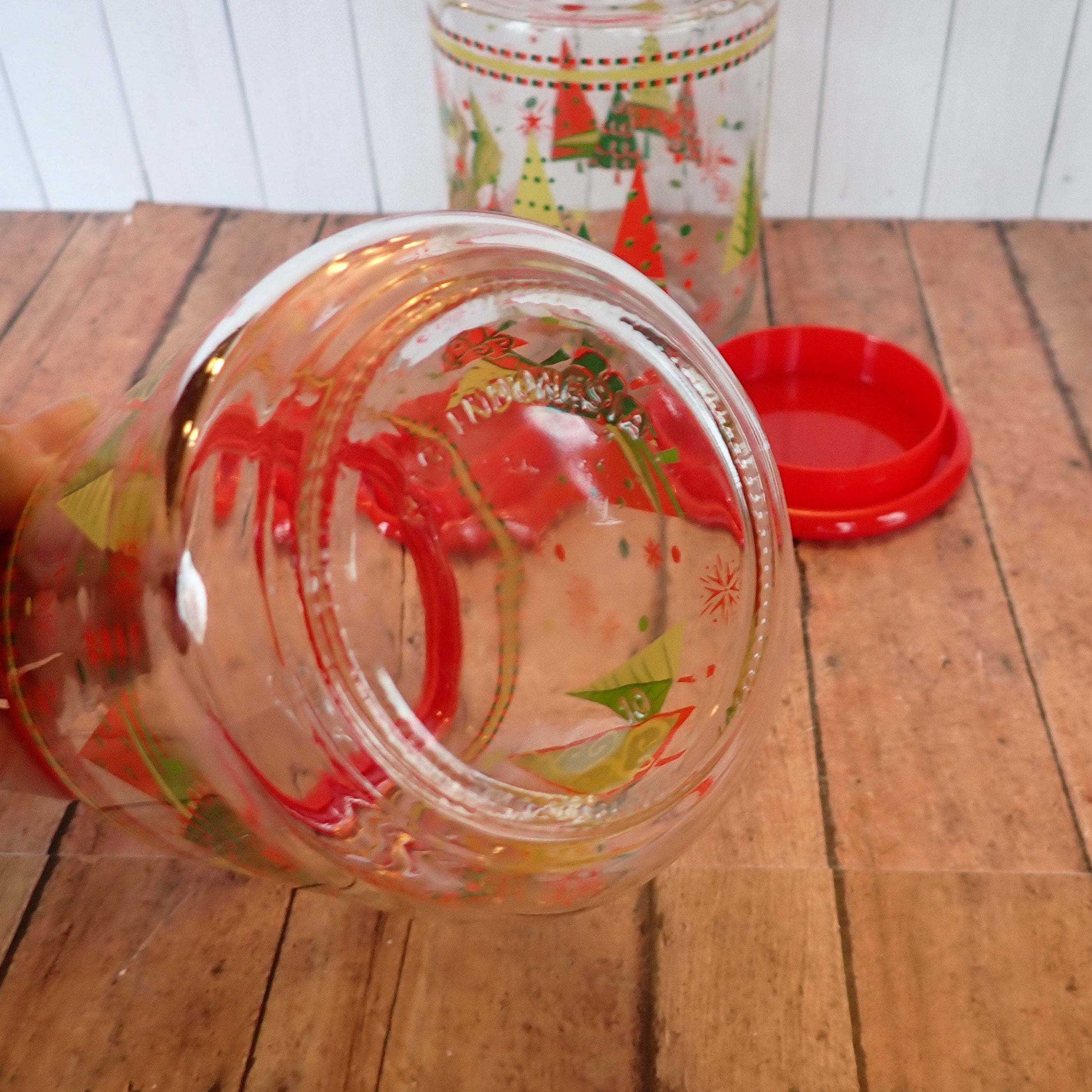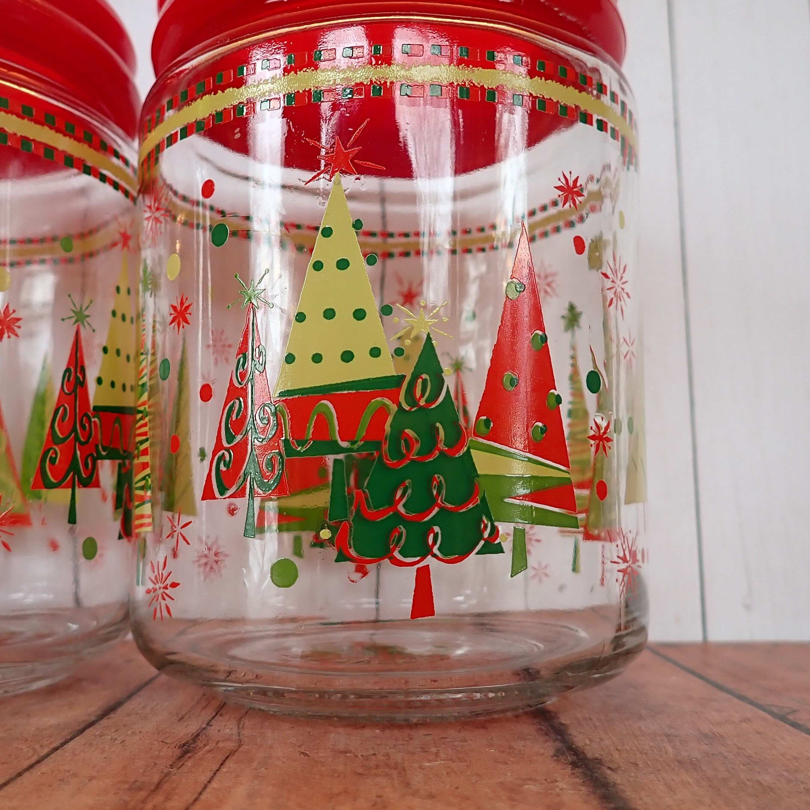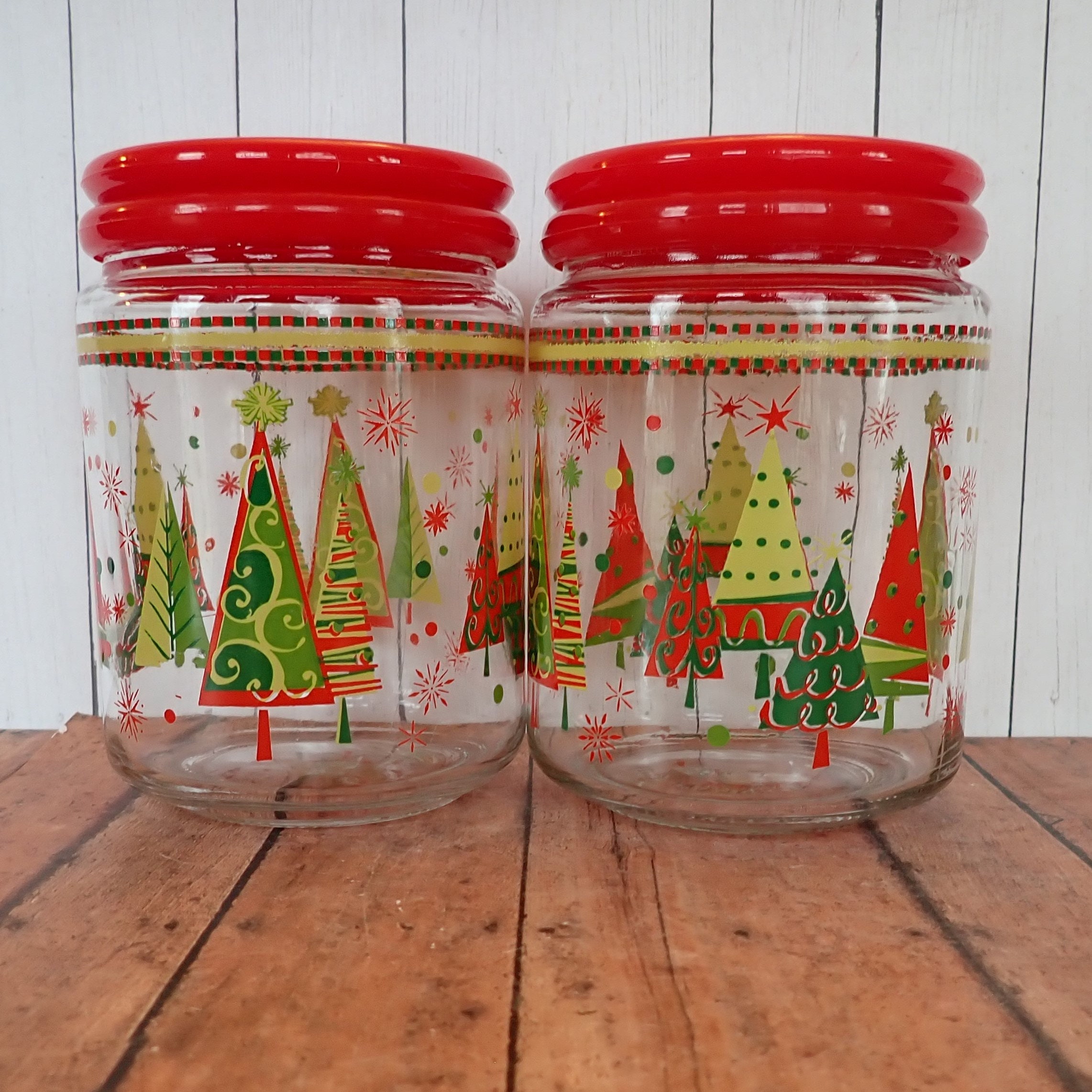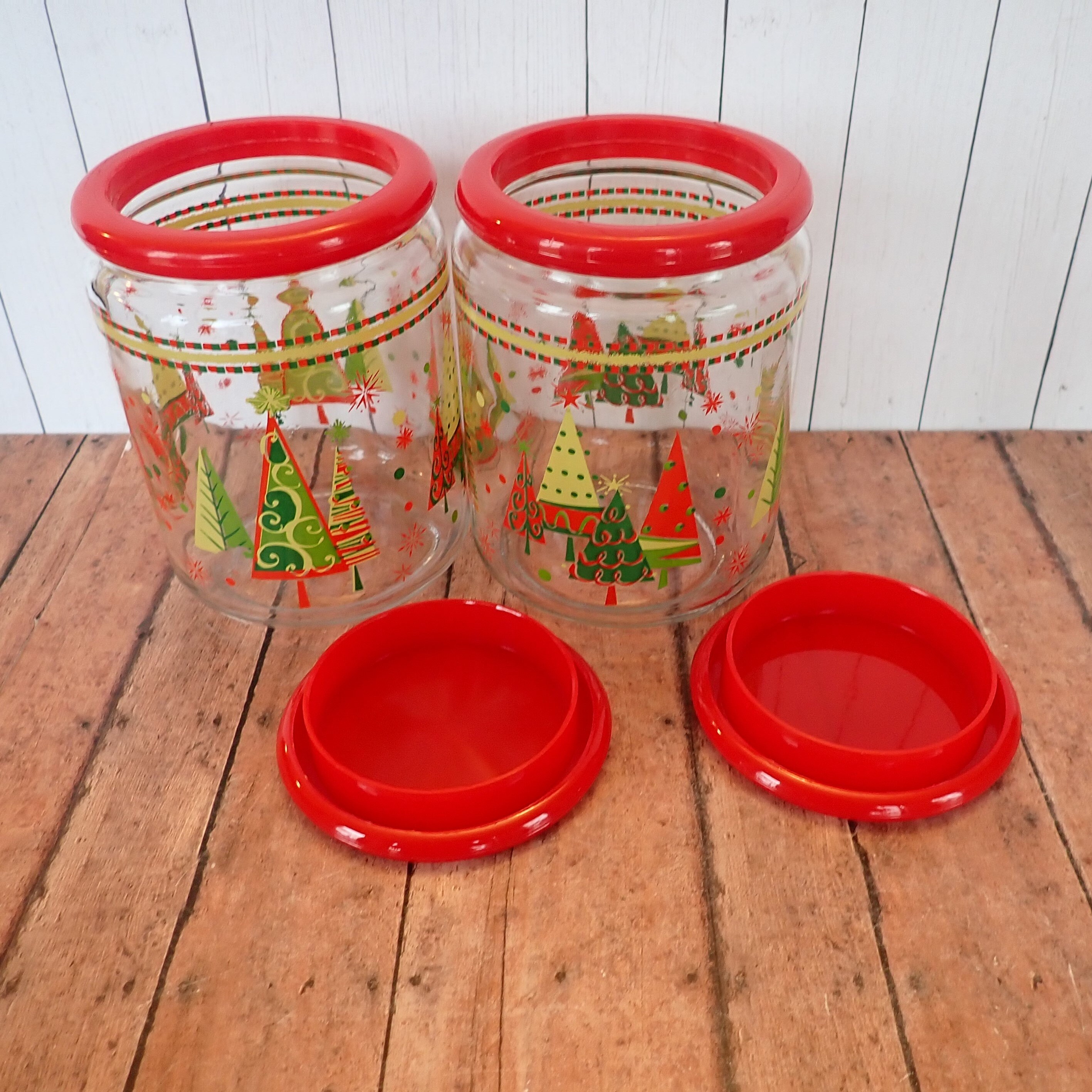 This set of 2 glass canisters with lids includes 2 matchng canisters with Christmas tree patterns. They each measure 4" in diameter and 5.5" tall with the lid on. The canisters are clear glass with a colorful red, yellow and green pine tree designs. The lids are a red plastic and have a snug fit on the canisters. The bottoms are marked KIG INDONESIA.