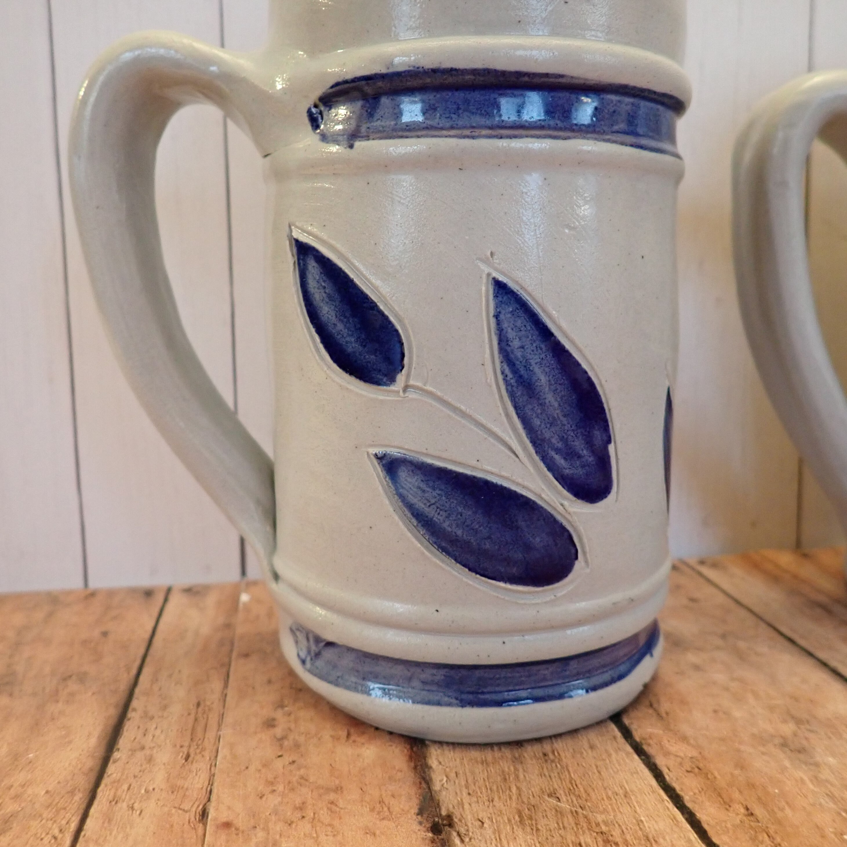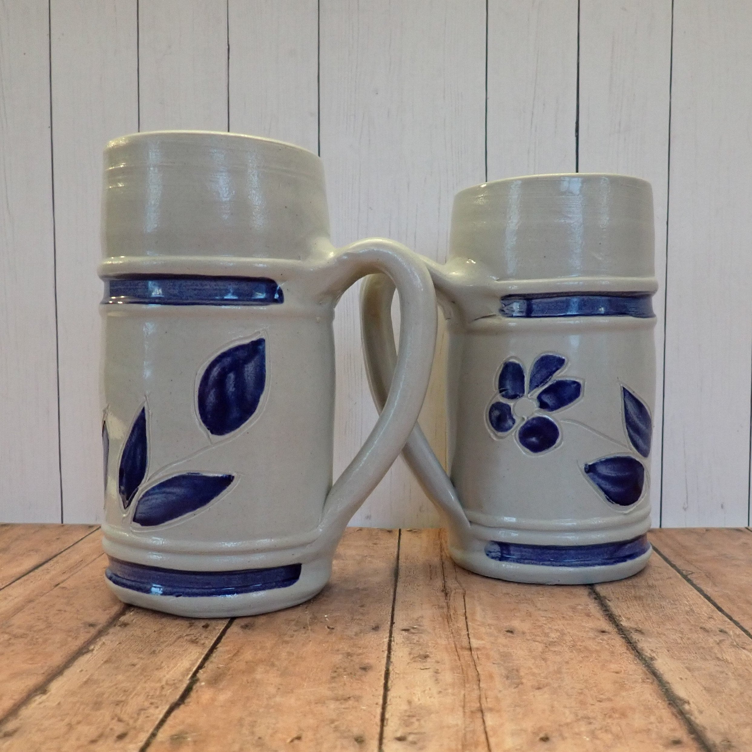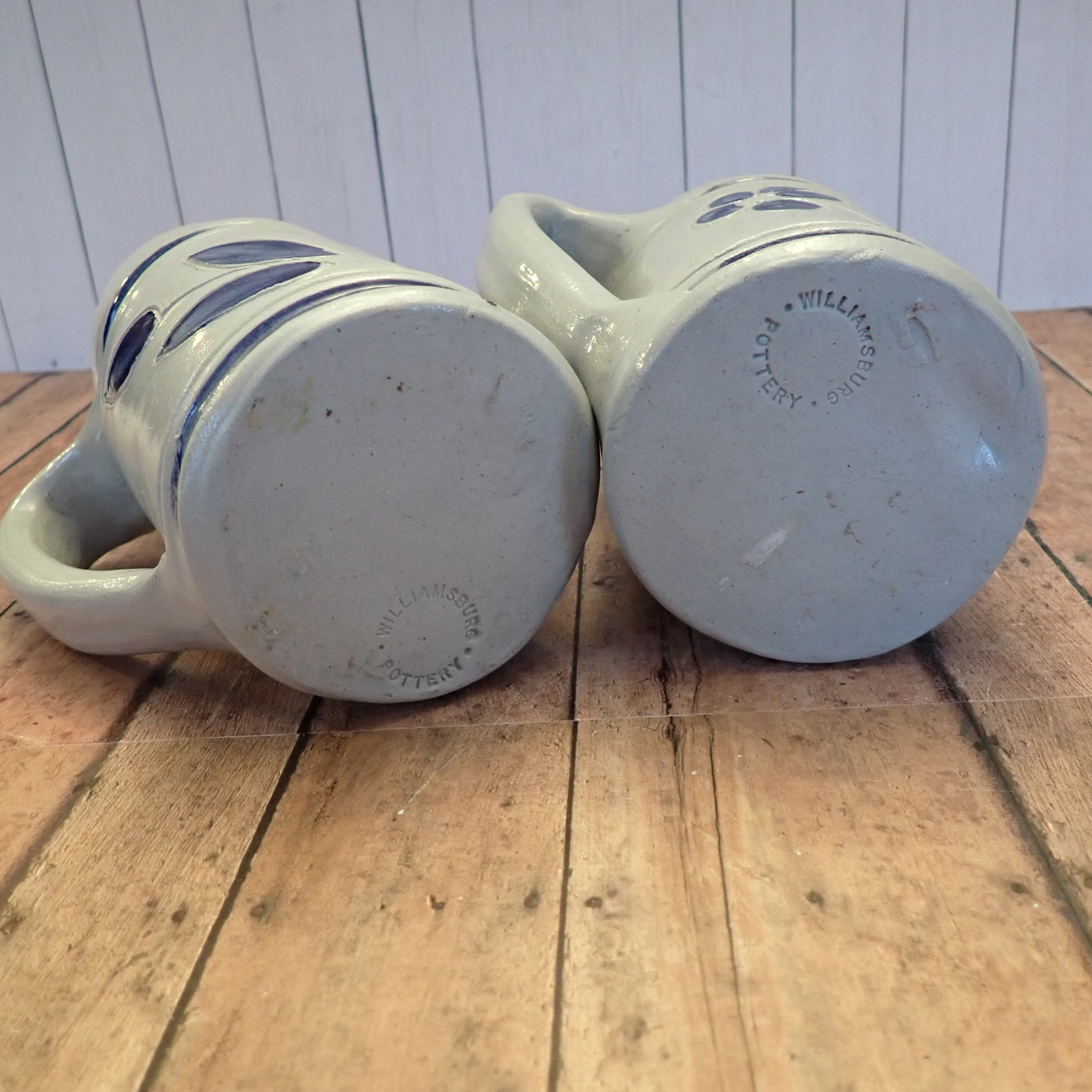 This great pair of Williamsburg Pottery stoneware steins includes 2 one mug with a leaf pattern and one with a daisy flower pattern. These mugs measure 6.5" tall and 3" in diameter. The mugs have a lightly ribbed and textured surface with a blue band on the top and bottom of the leaf/flower design. Both are marked on the bottom: WILLIAMSBURG POTTERY.