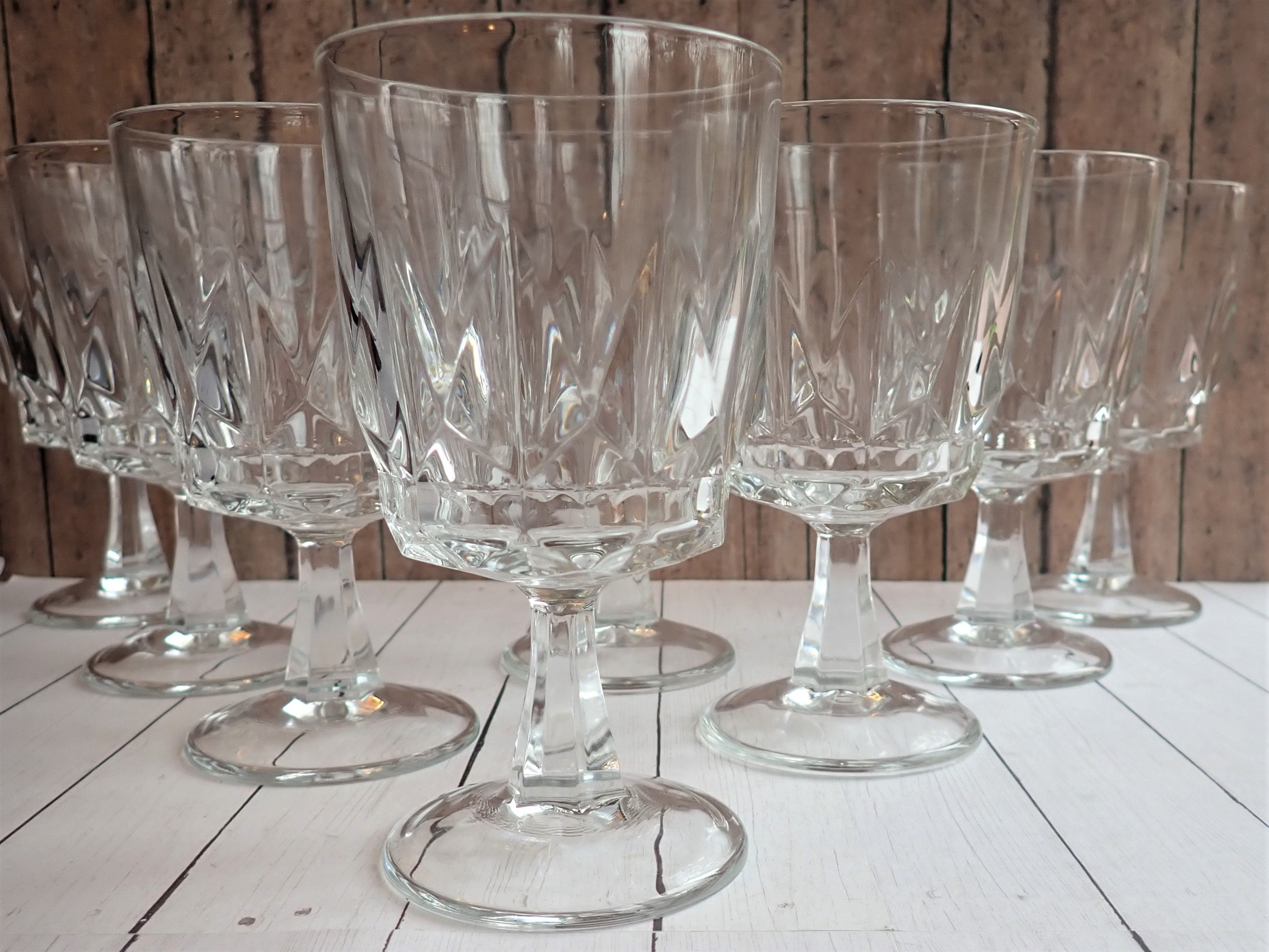 This set of 8 water goblets by Arcoroc are in the Artic pattern and are 5.75" tall and 3" in diameter. They are a clear glass, and have a vertical diamond pattern around the glass. The goblets are marked: ARCOROC FRANCE on the bottoms. These are the largest size of goblets available in this pattern and can hold 8 oz.