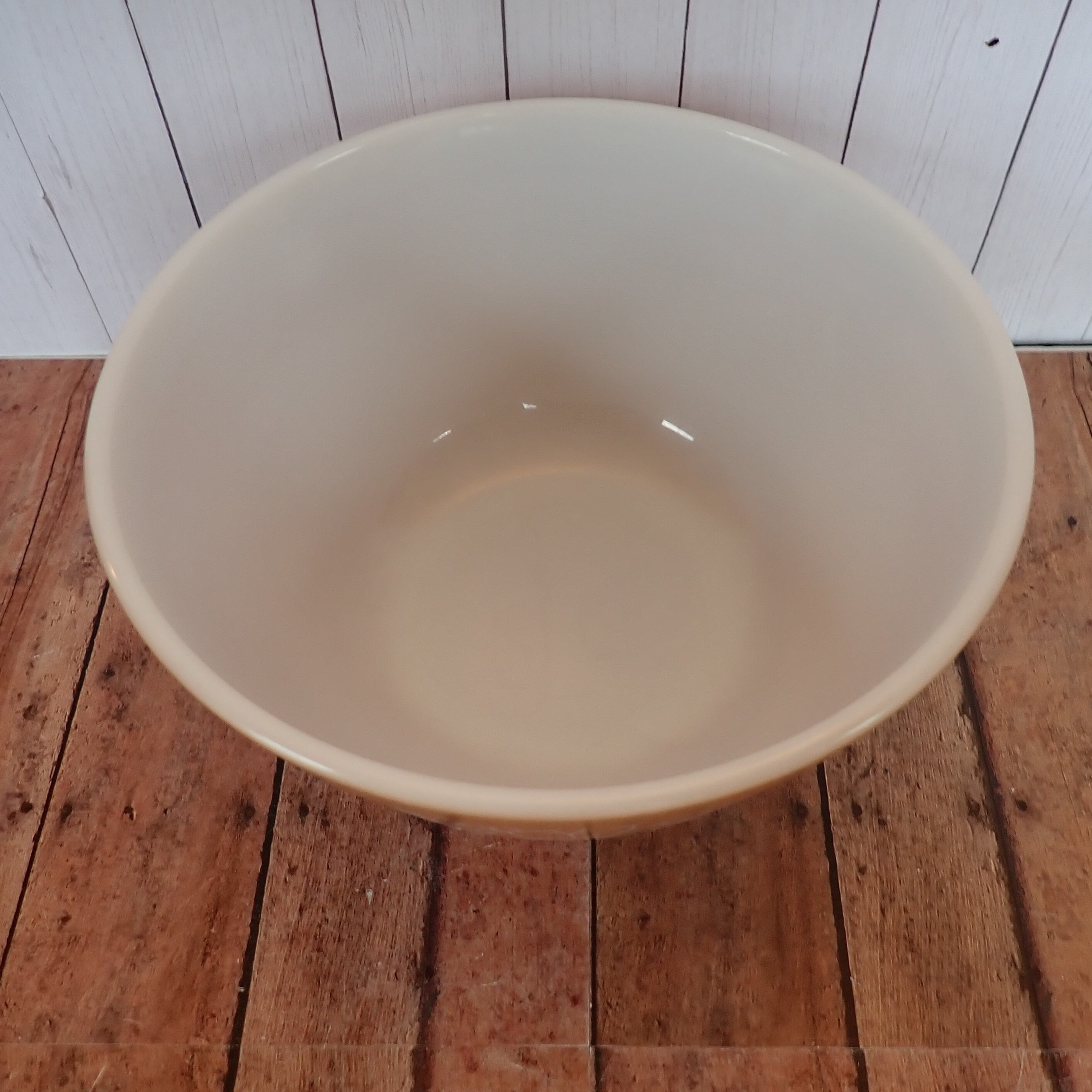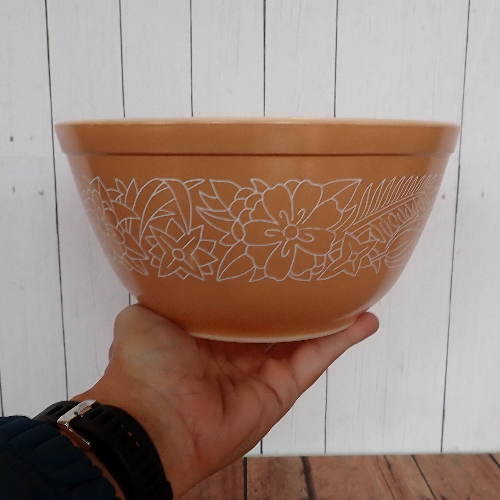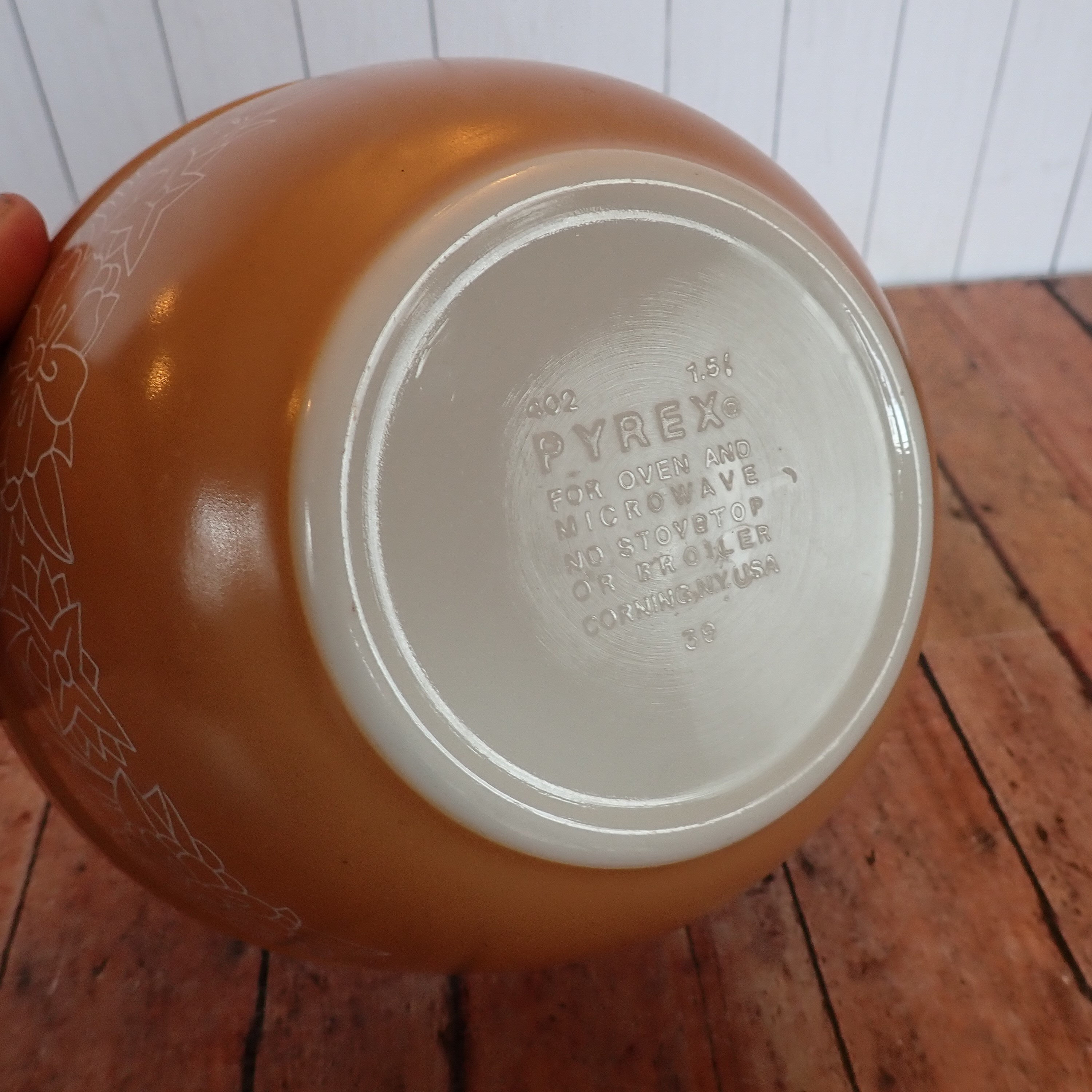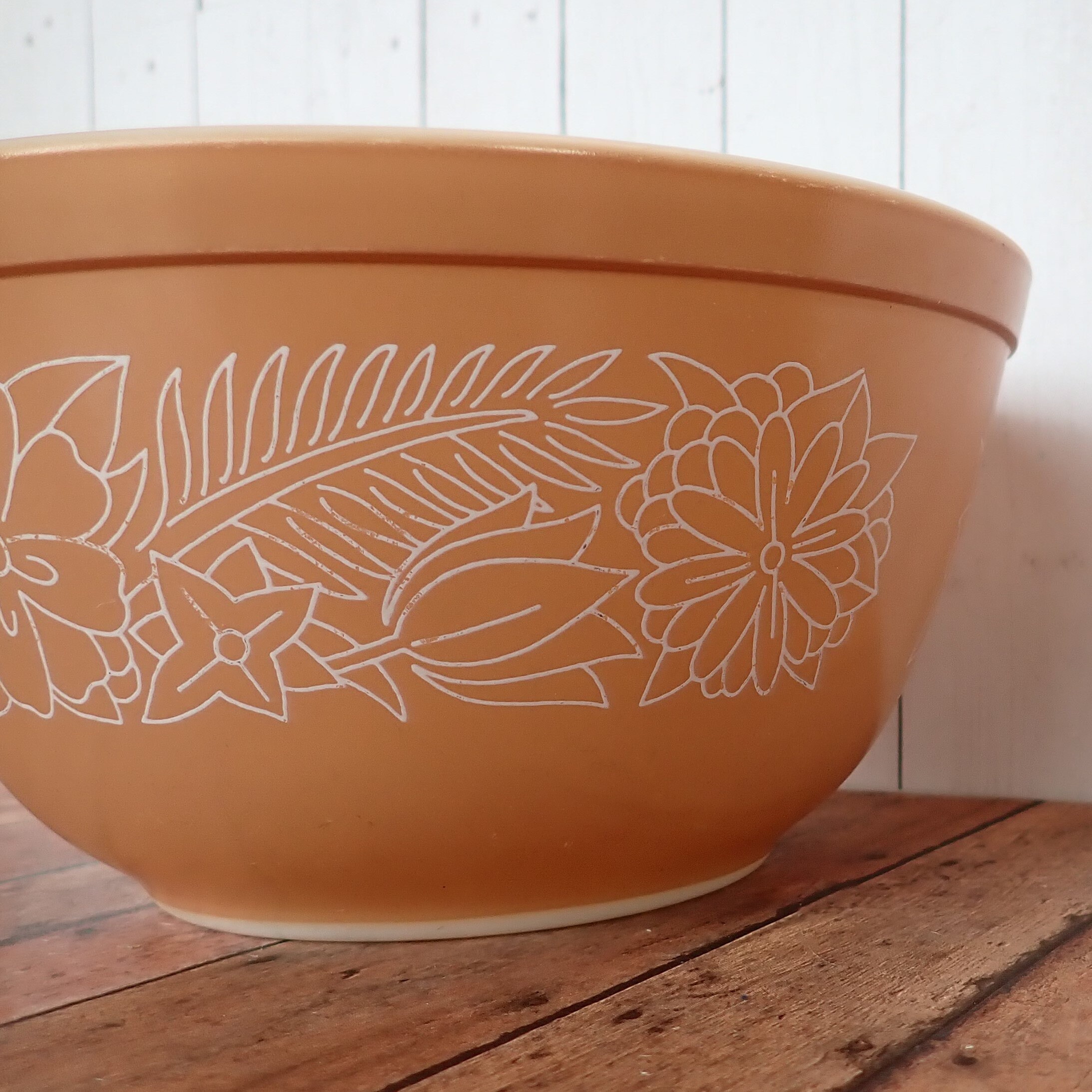 This mixing bowl by Pyrex is in the Woodland pattern and is bowl size 402. The bowl is 7.25" in diameter and 3.75" tall, and is beige with a white leaf and flower design. The bowl is marked Pyrex on the bottom.