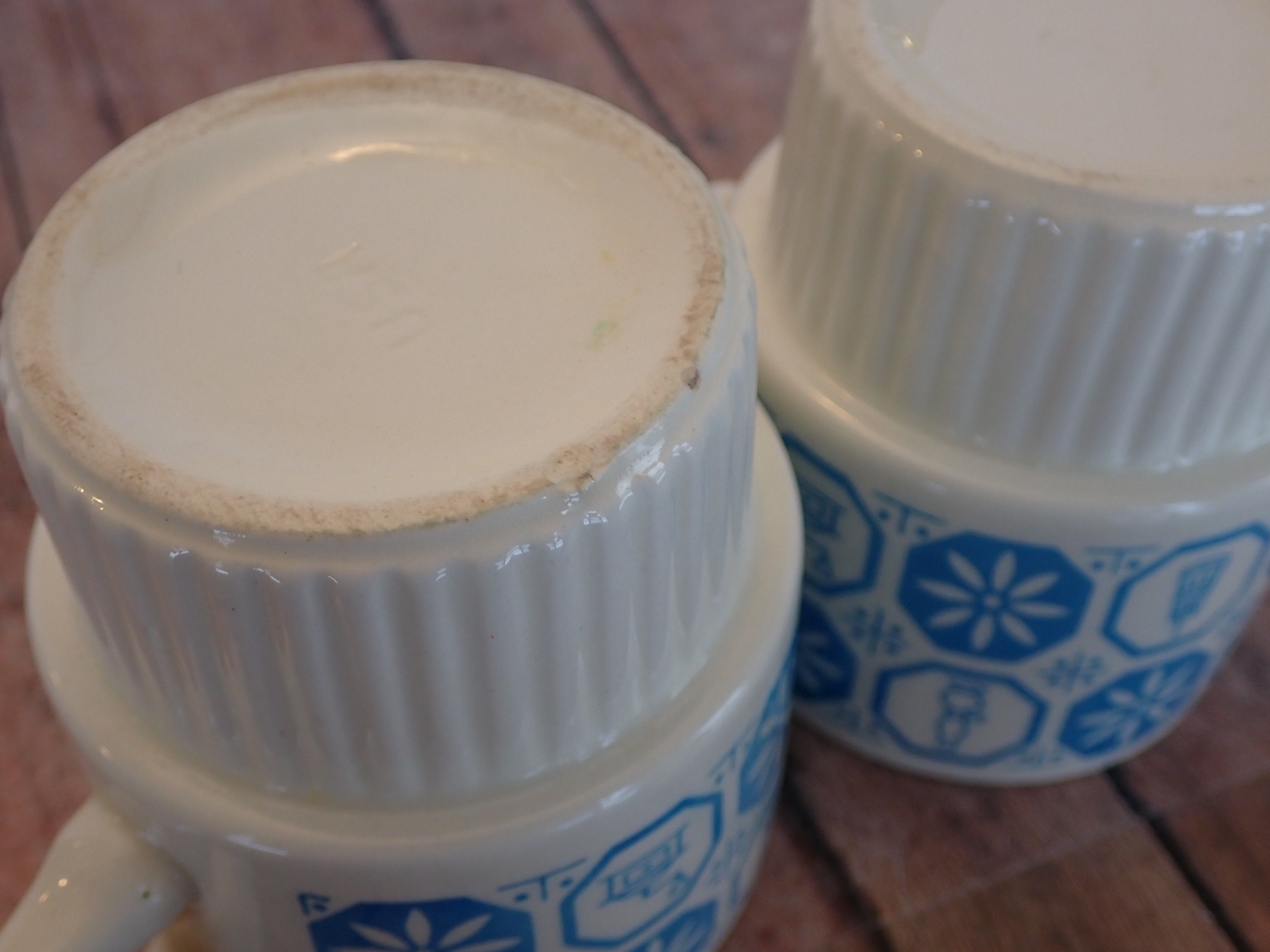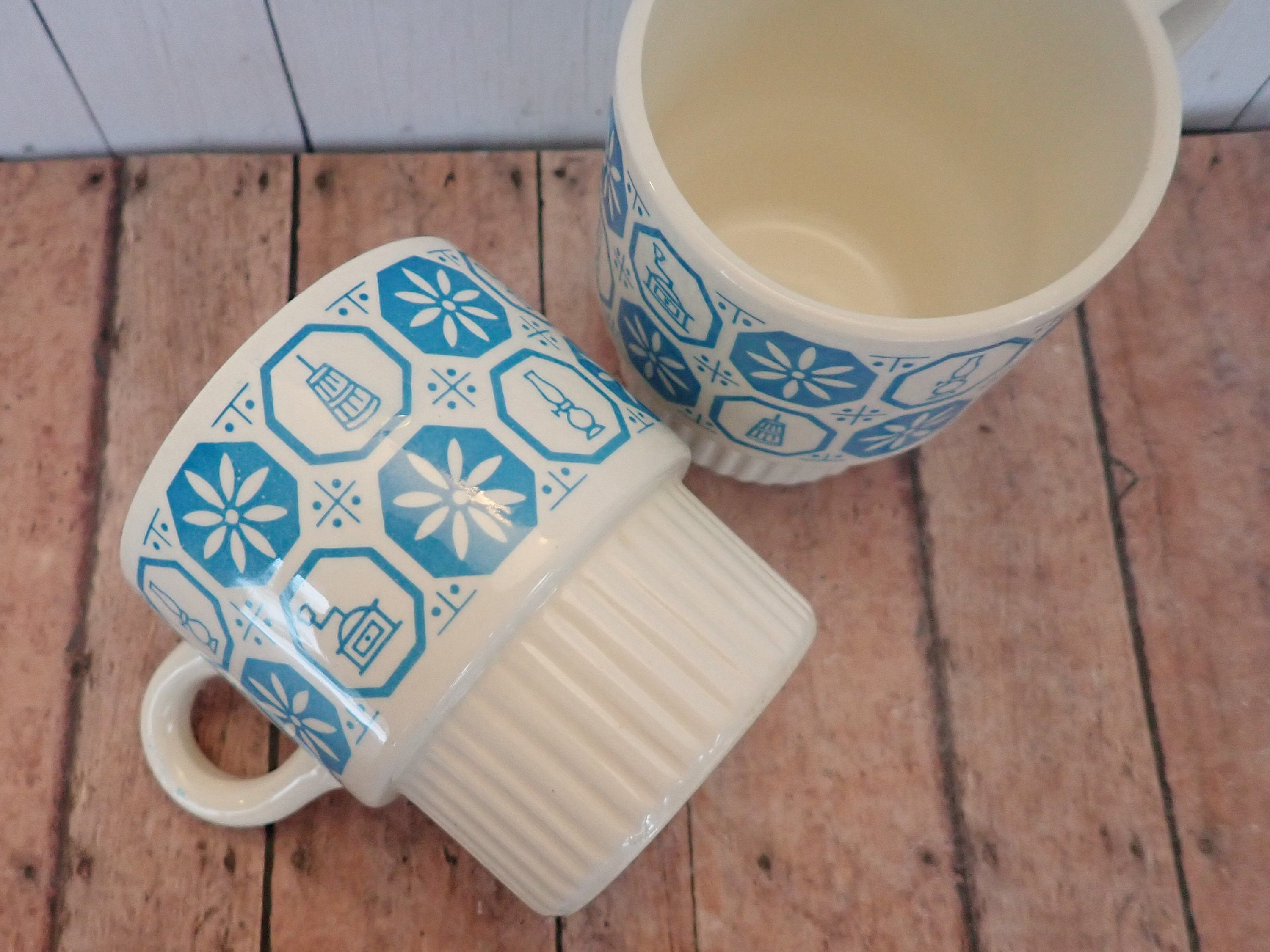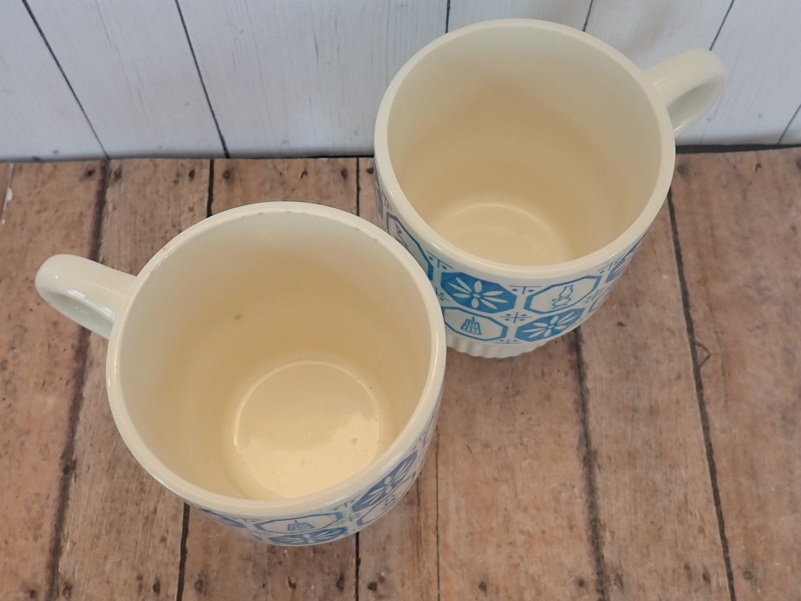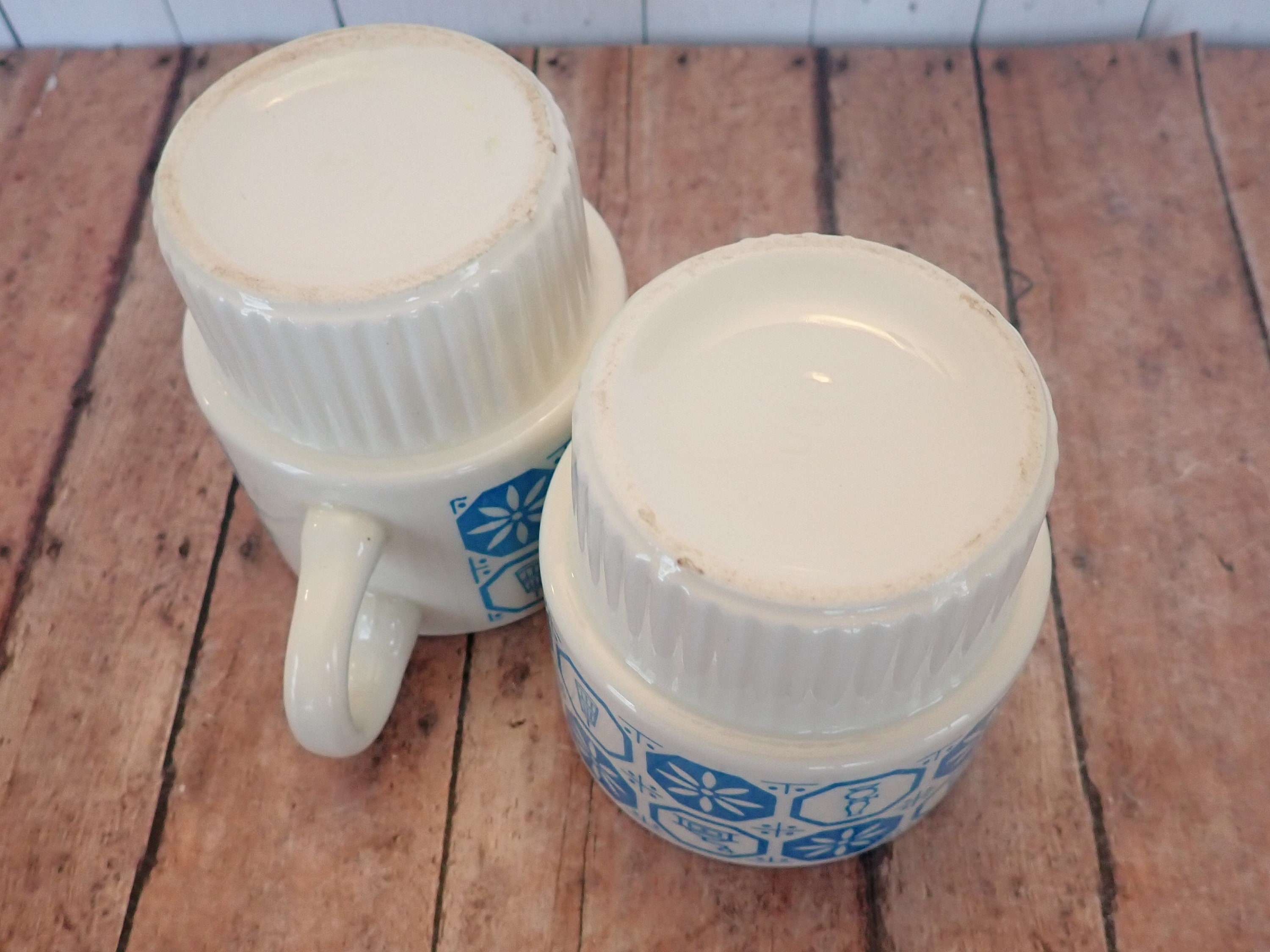 Both mugs are in very nice condition - there is a small nick in the base of one mug and the inside rim of one mug is a just a little rough to the touch - it is more square than rounded. Cute set of vintage stacking mugs!