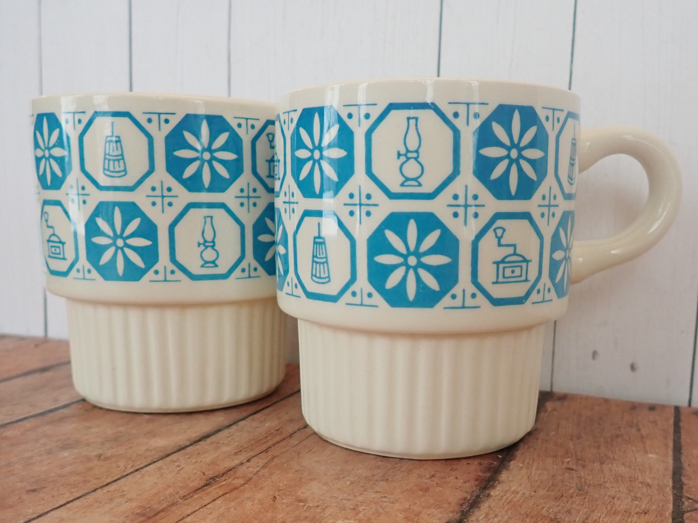 This set of 2 ceramic mugs set includes 2 matching mugs in the same pattern. They are a white ceramic, and each have a checkerboard design with alternating white and blue flowers and colonial items - a coffee grinder, a lantern and abutter churn. Each mug is 3.5" tall and 3" in diameter at the top. The bottoms narrow to 2.5" in diameter and the mugs are stackable within each other. The bottoms of the mugs are marked USA.