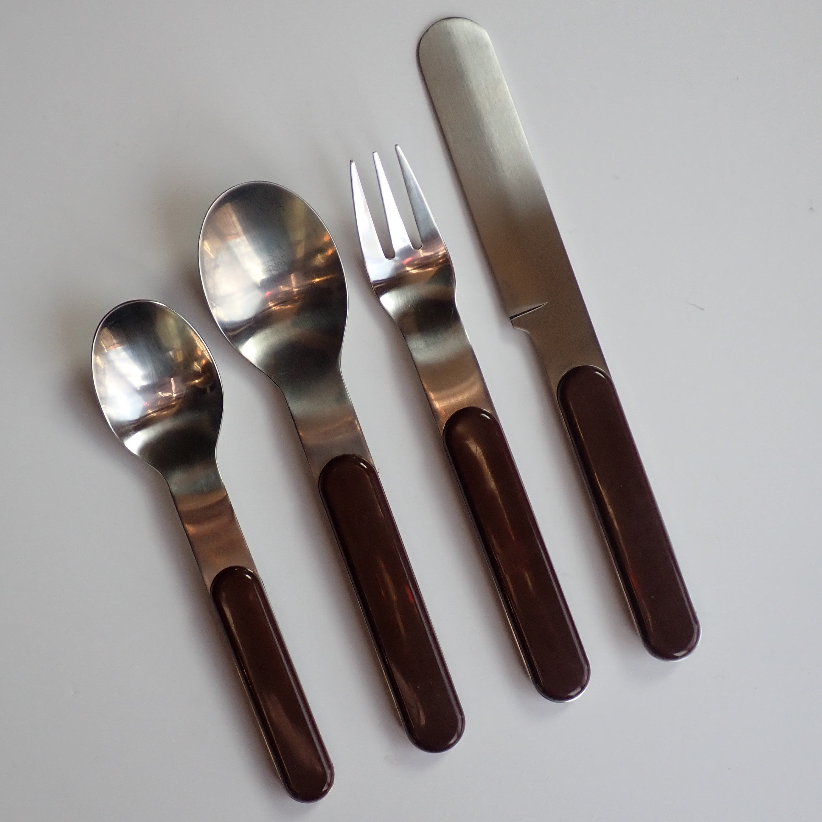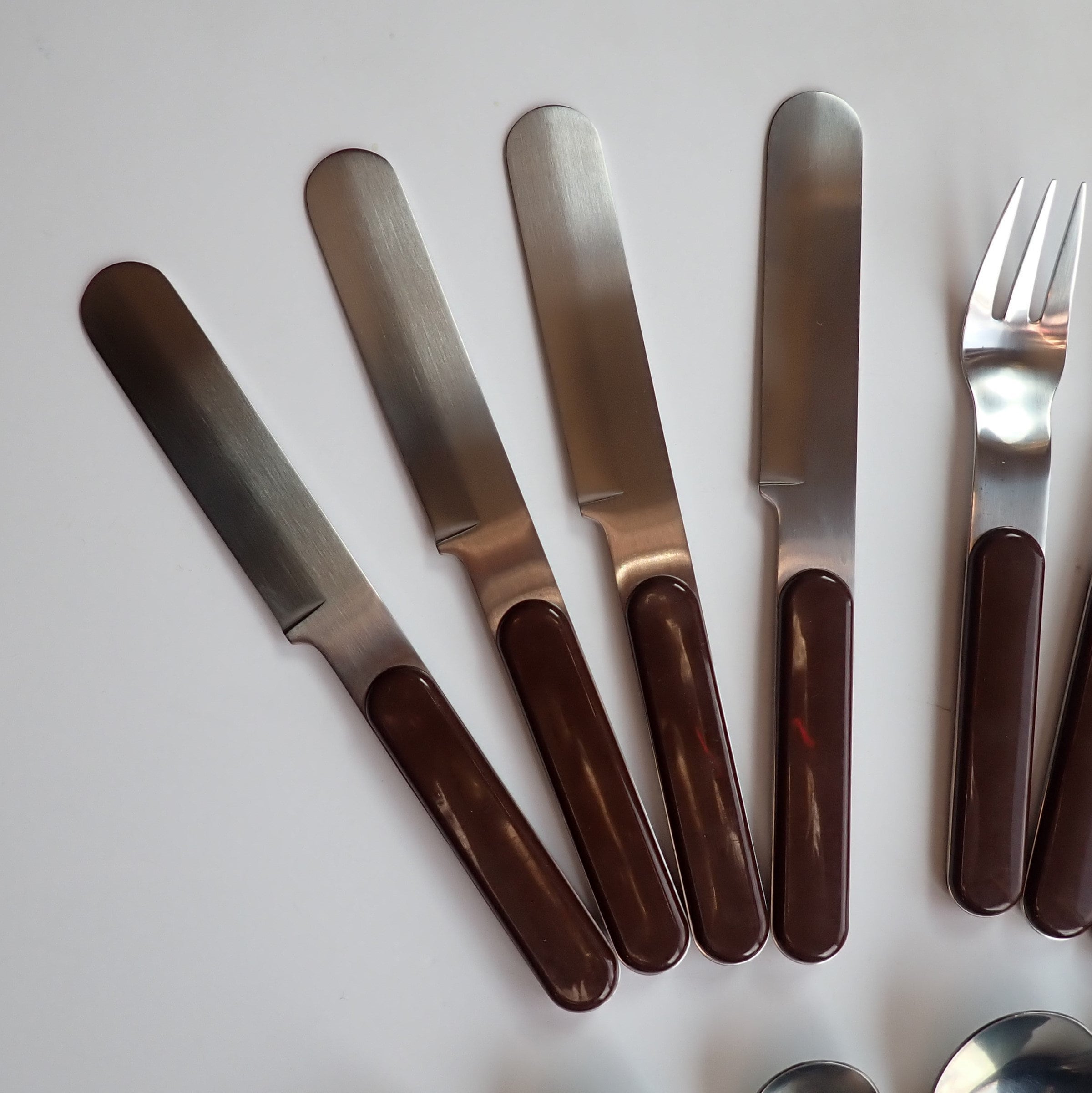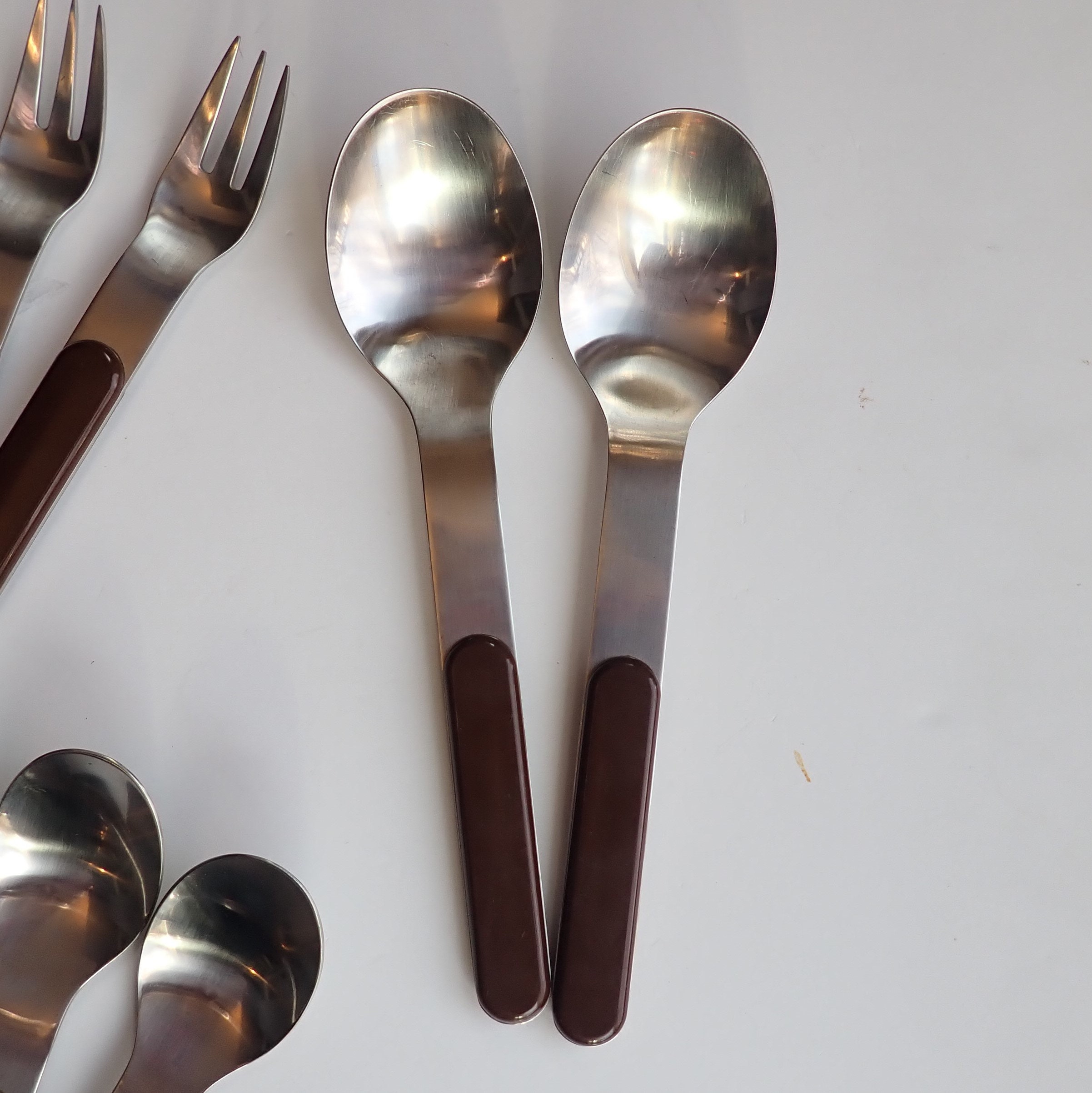 They are a silver metal with a smooth brown plastic handle. All of the pieces are marked DANSK on the backs. All of the pieces are in very good condition, there are some light scratches on the plastic areas of the handles.
