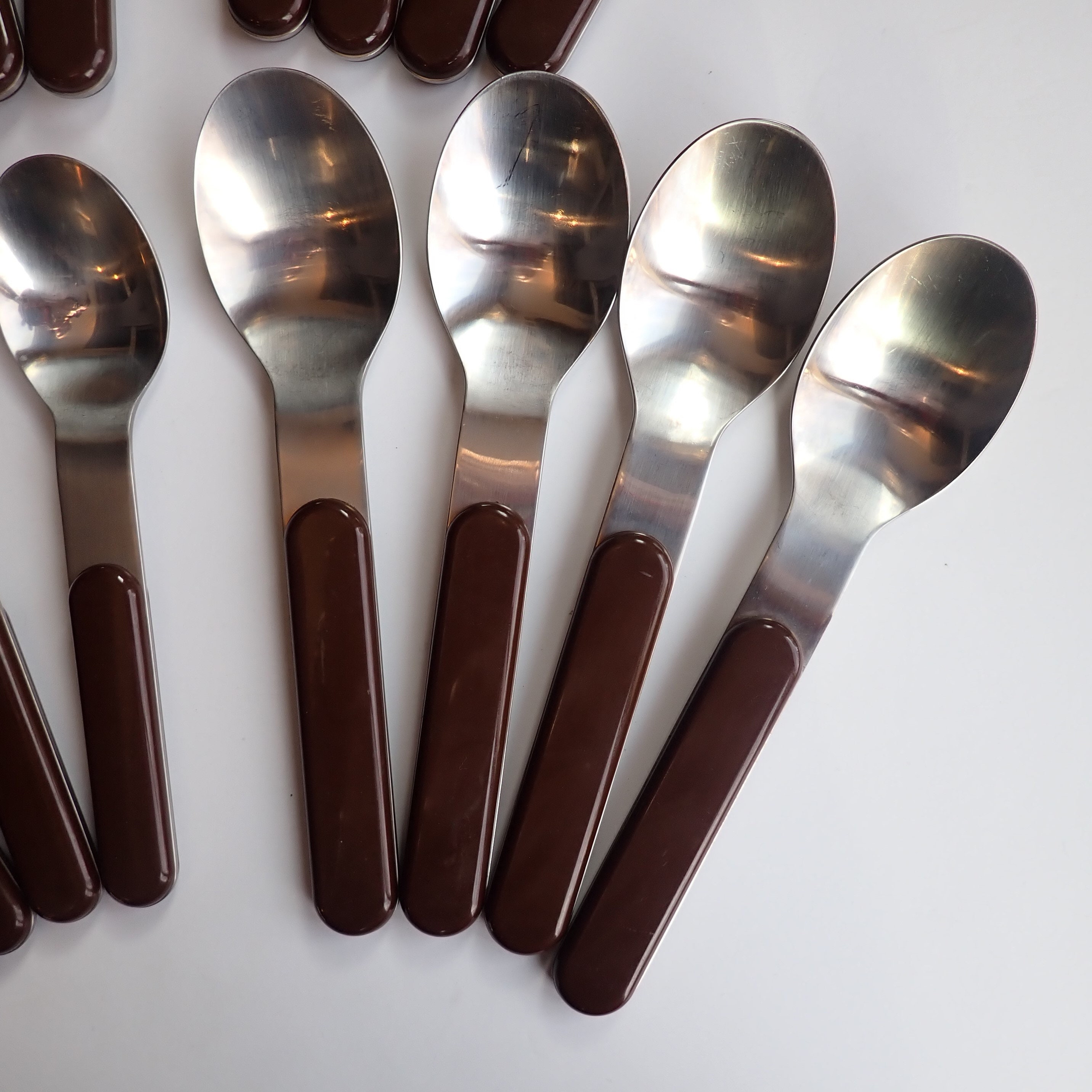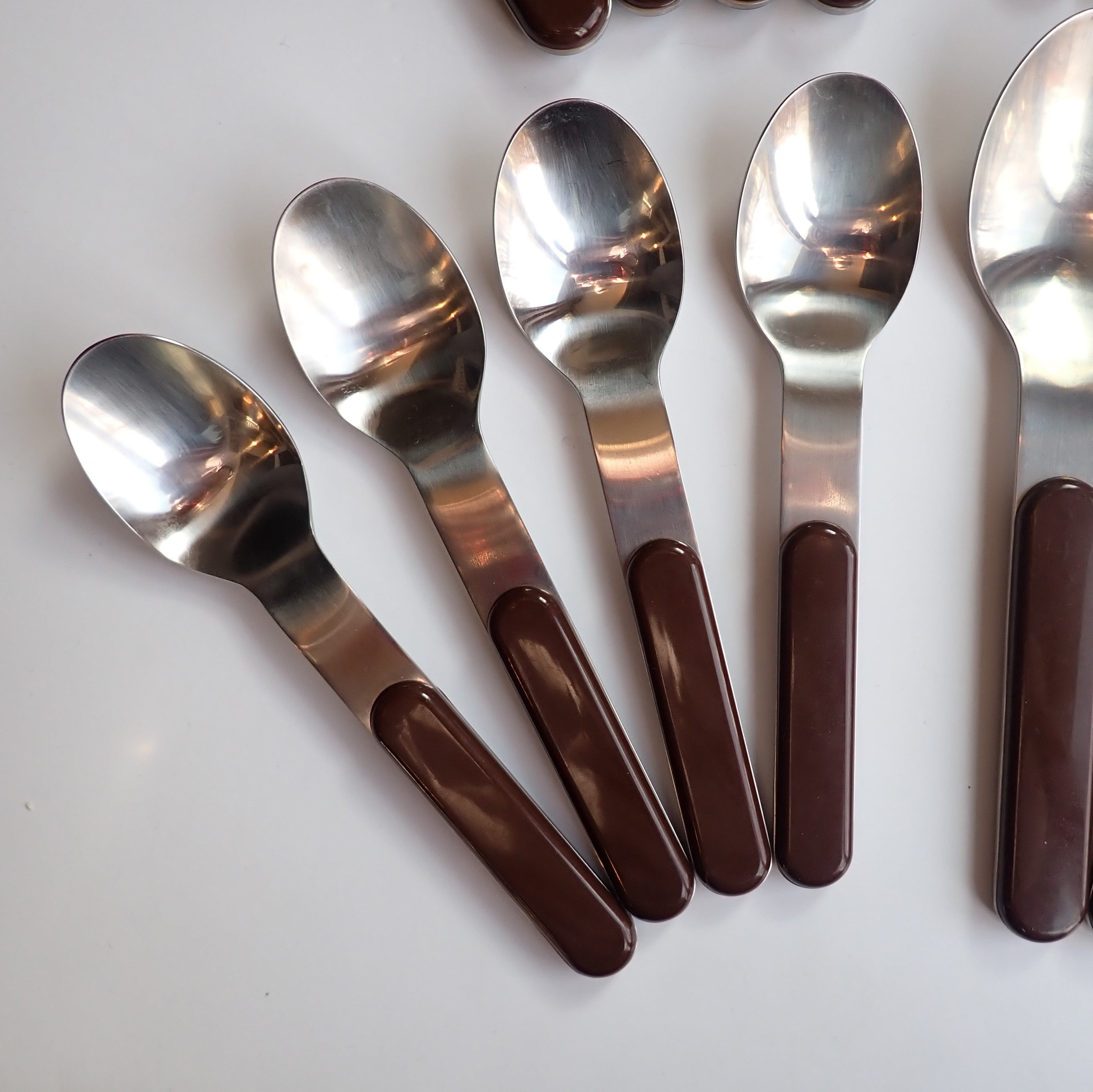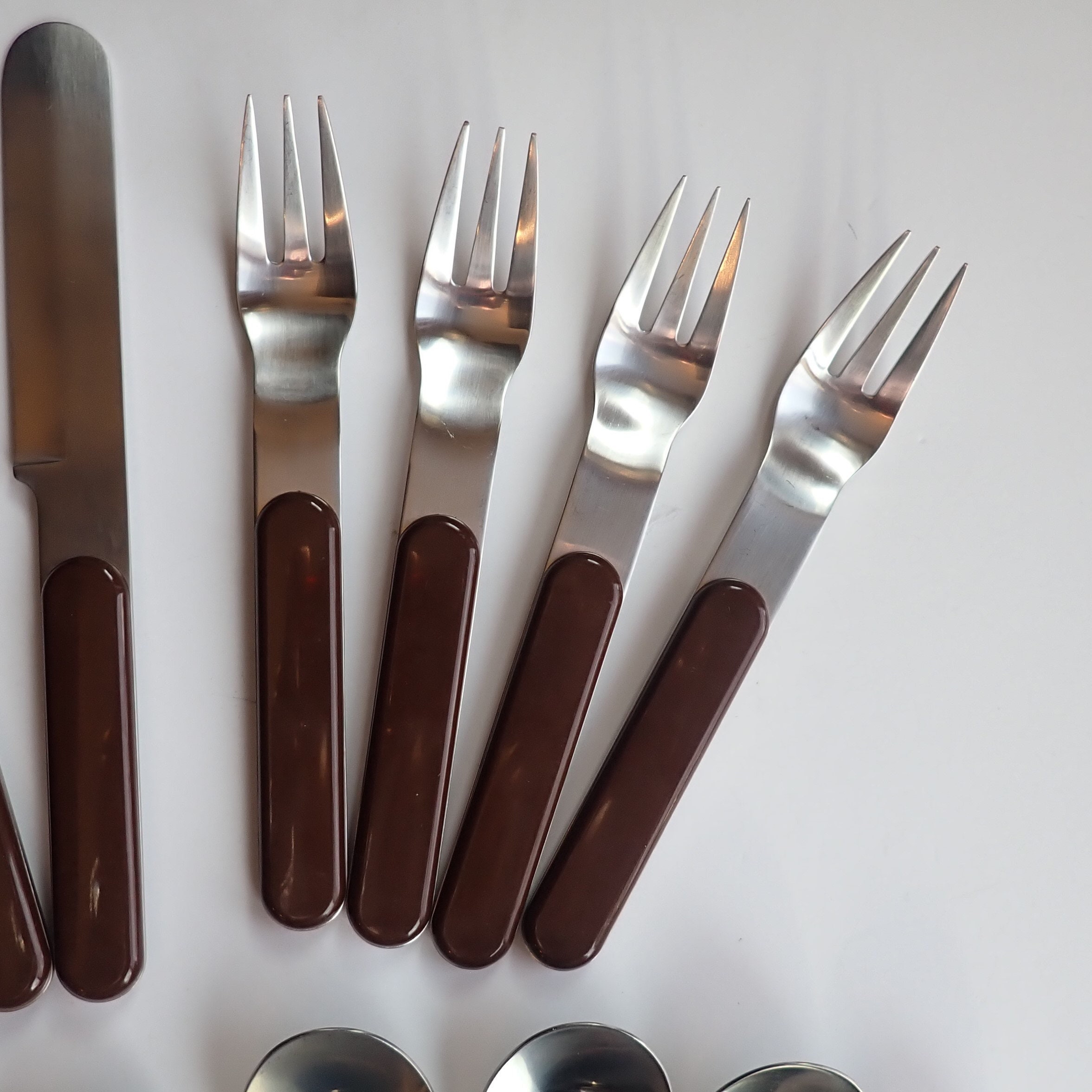 They are a silver metal with a smooth brown plastic handle. All of the pieces are marked DANSK on the backs. All of the pieces are in very good condition, there are some light scratches on the plastic areas of the handles.