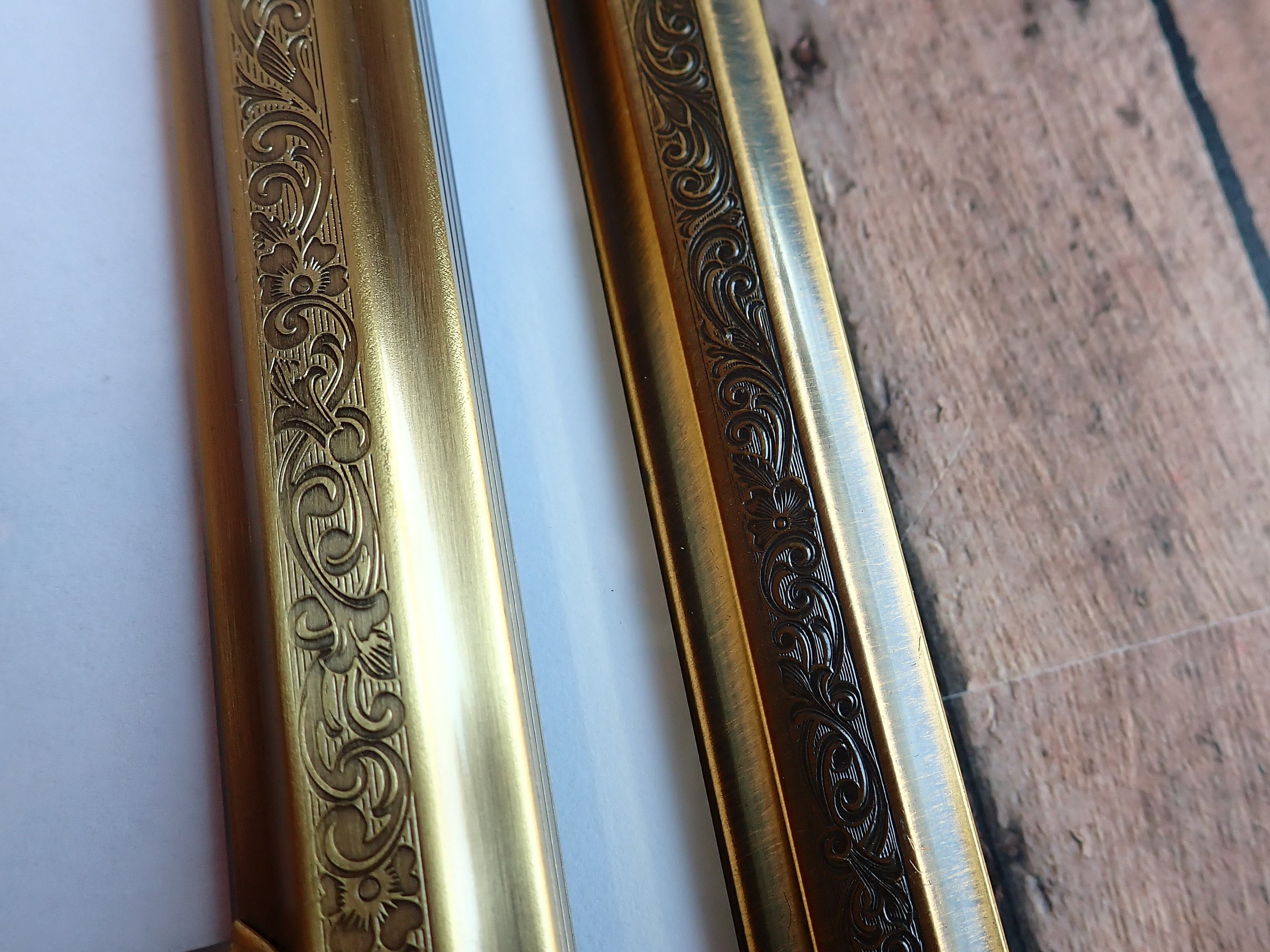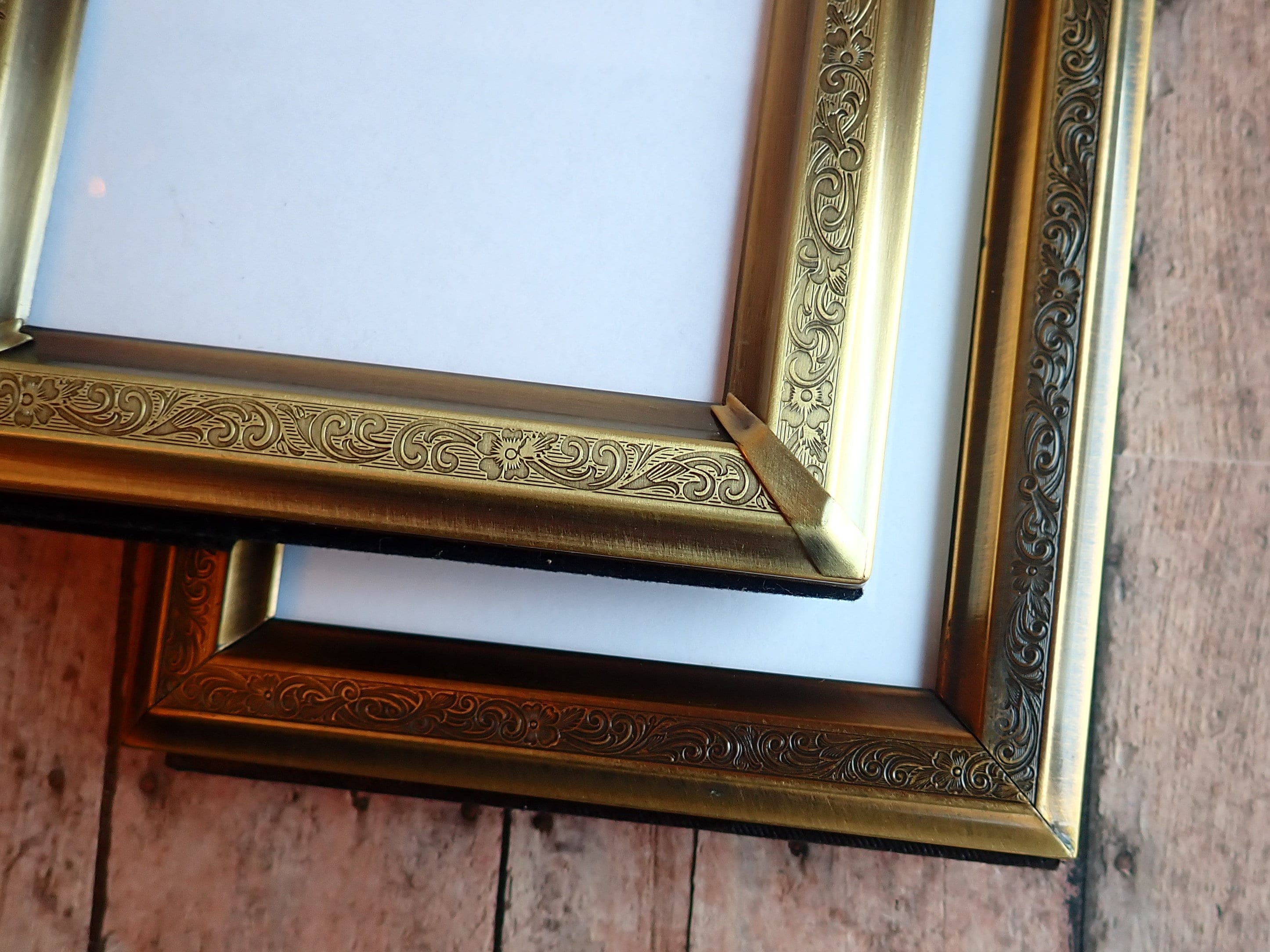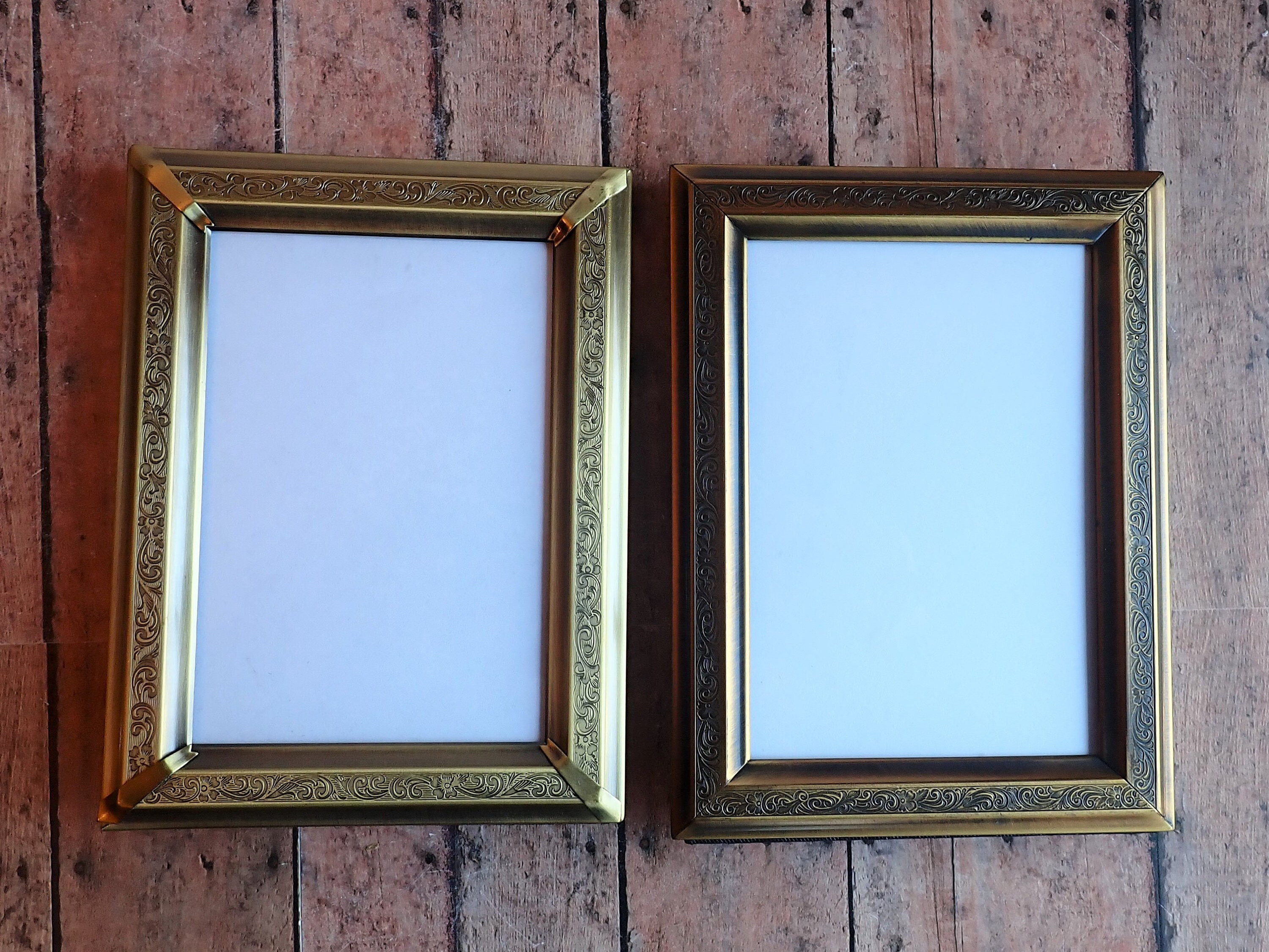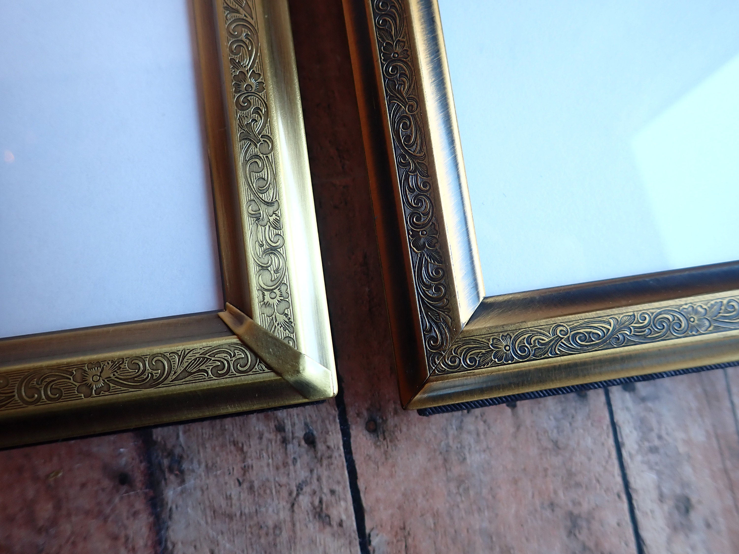 This set of frames includes 2 coordinating bronze colored 3.5x5 frames. Both frames are 3.5" x 5" size, and have a piece of clear glass over the photo opening and a cardboard backing piece with a photo stand. The frames can hold a 4x6 photo but only 3.5x5 of the photo will show through the opening. The frames have a nicely etched scroll and leaf design around the frames. One frame is slightly darker than the other. The photos can stand either vertically or horizontally.