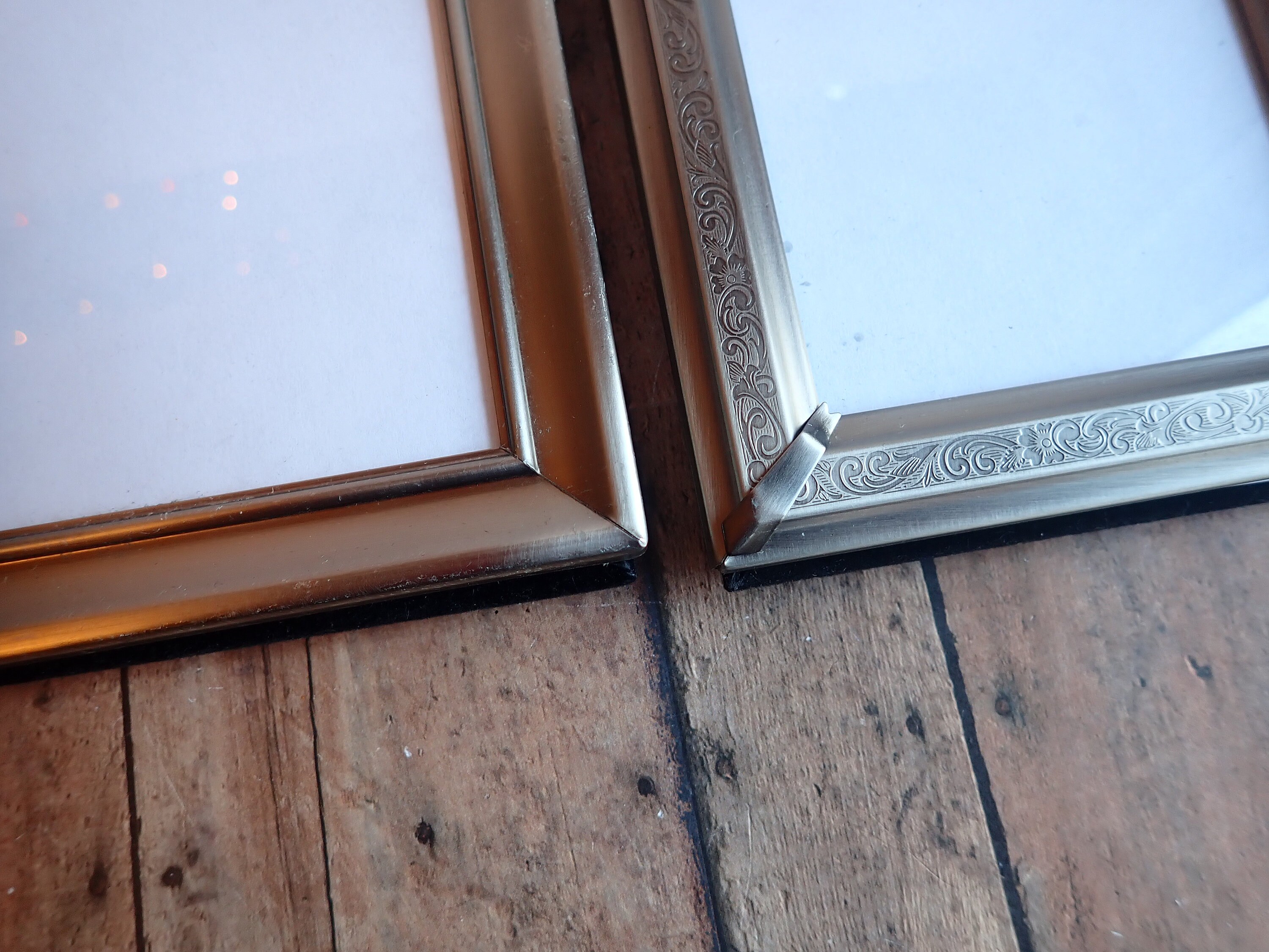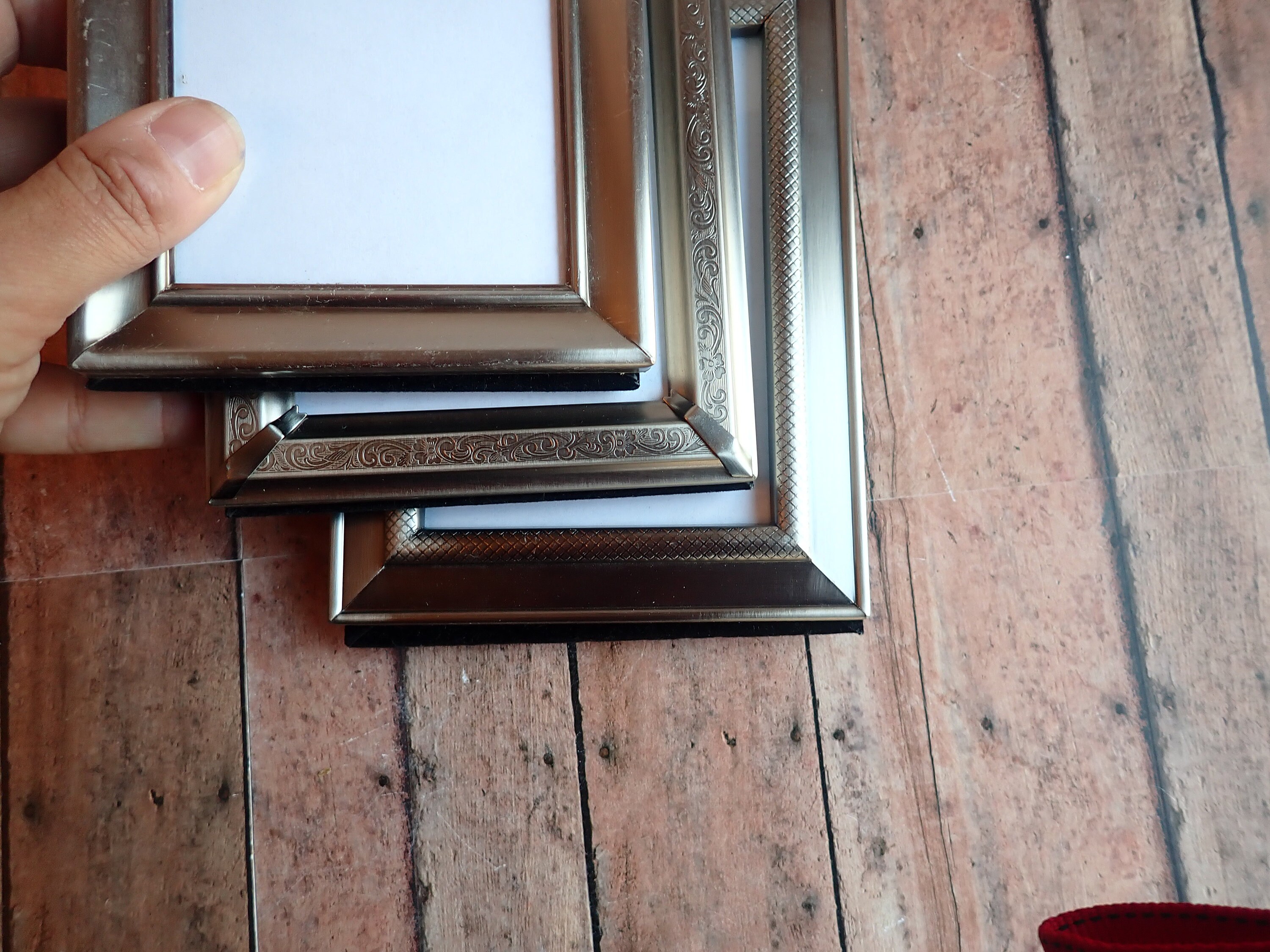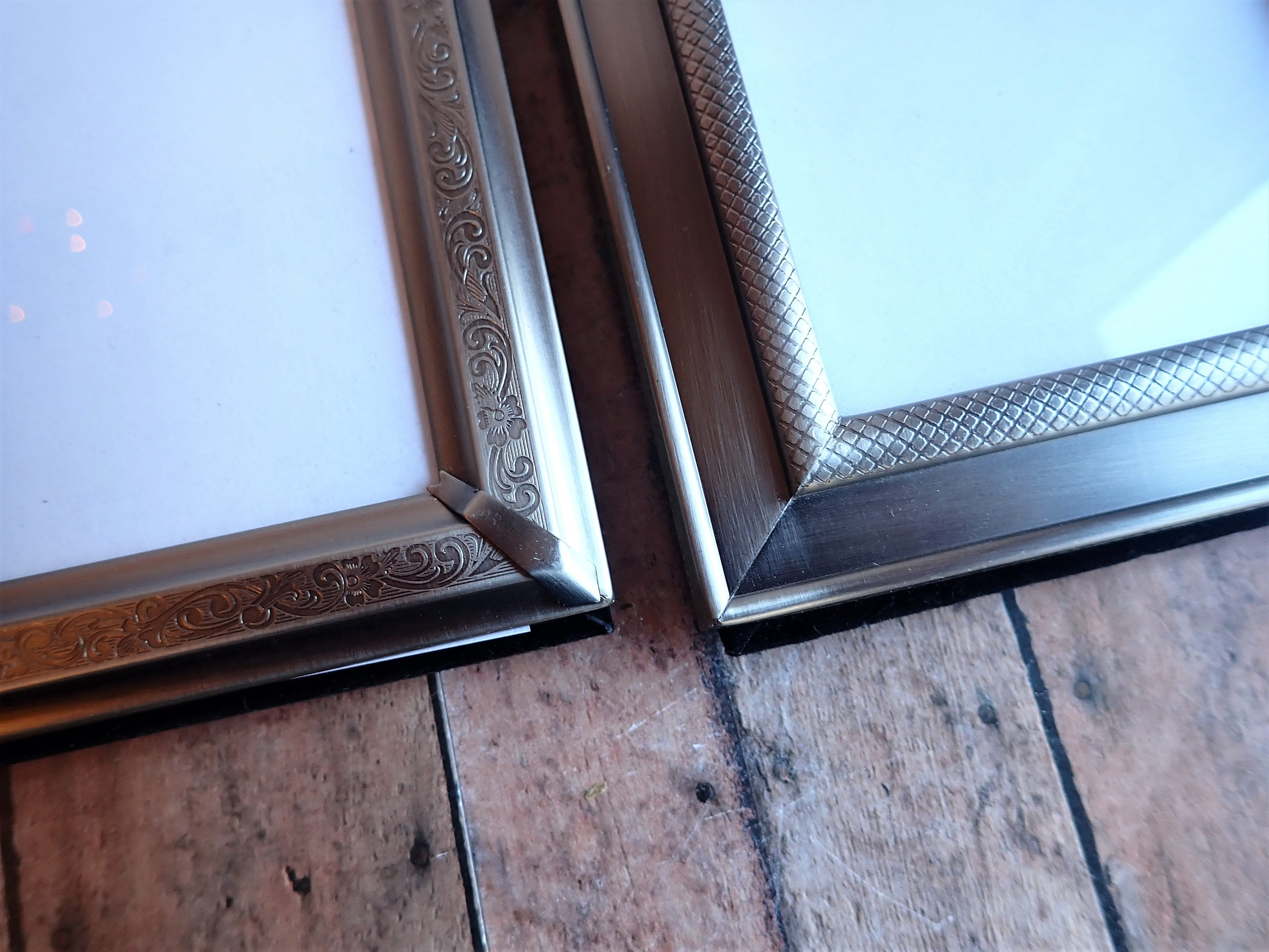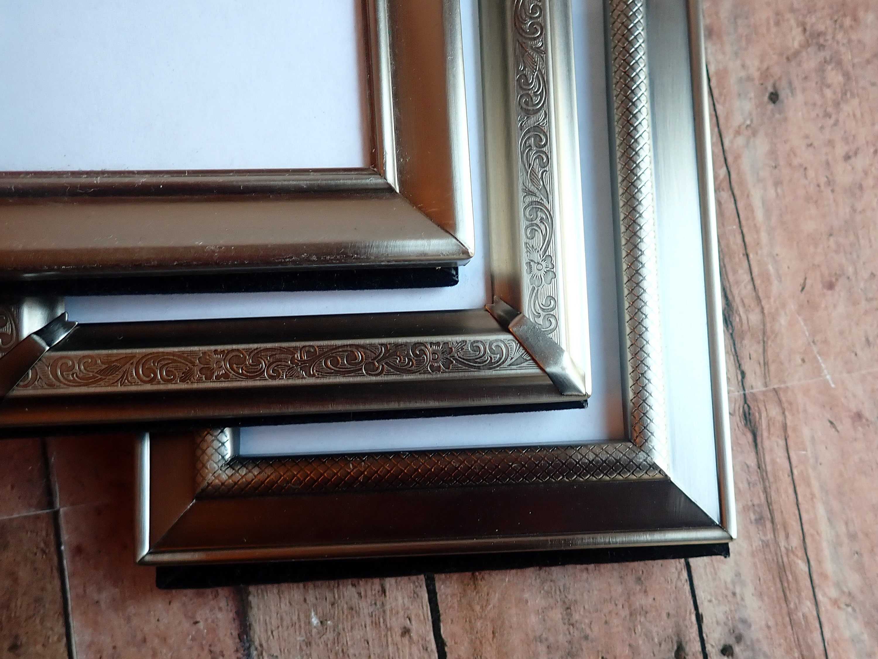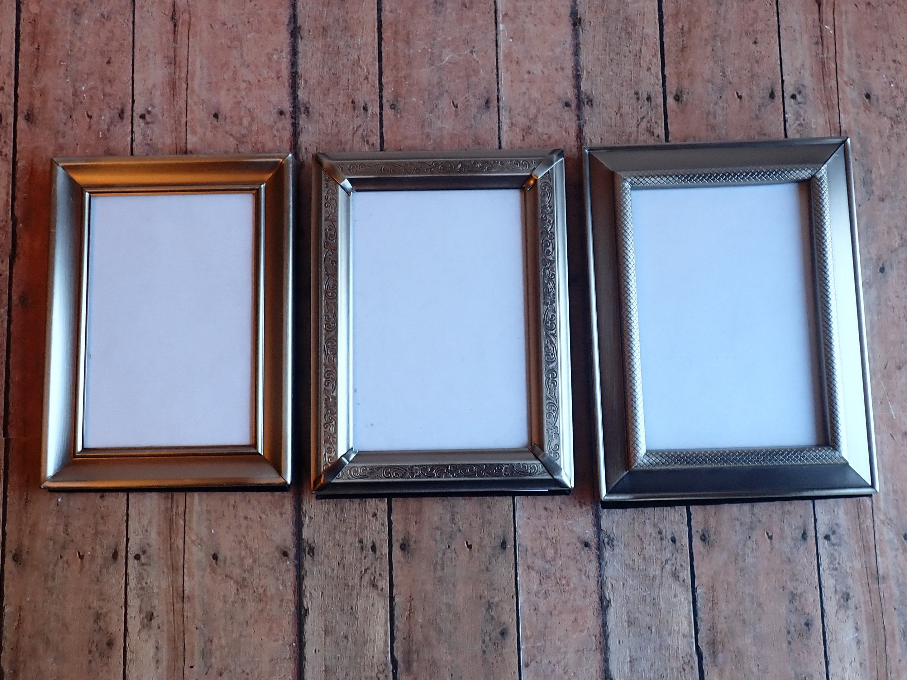 This set of frames includes 3 silver 3.5x5 frames. All 3 frames are 3.5" x 5" size, and have a piece of clear glass over the photo opening and a cardboard backing piece with a photo stand. Two of the frames have a smooth finish, and one has a etched scroll and leaf design. The photos can stand either vertically or horizontally.