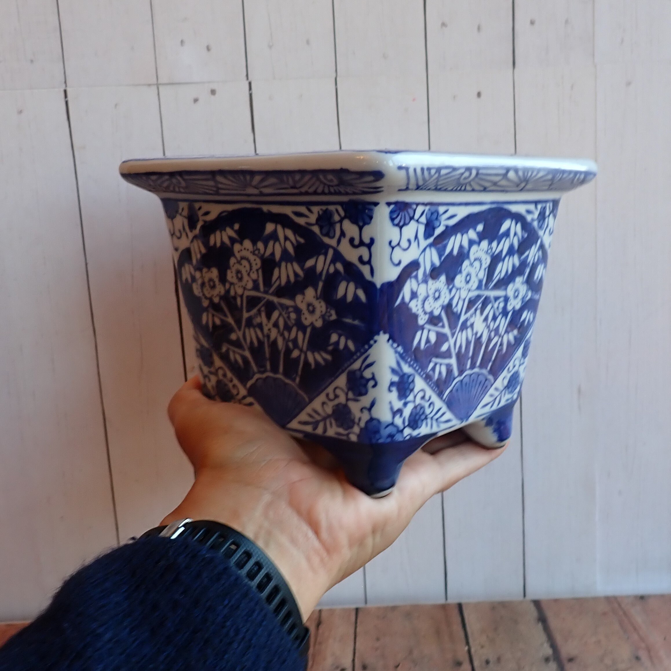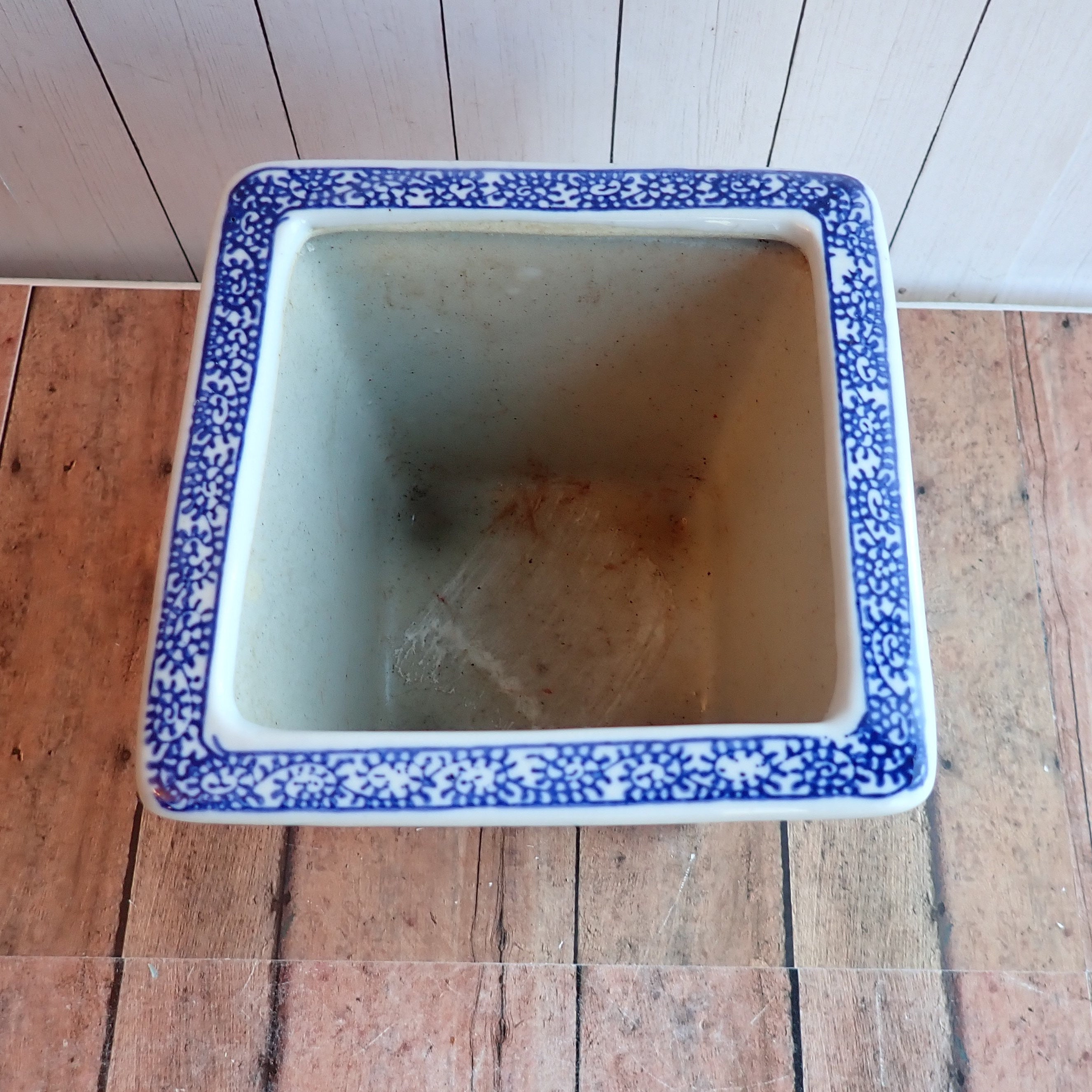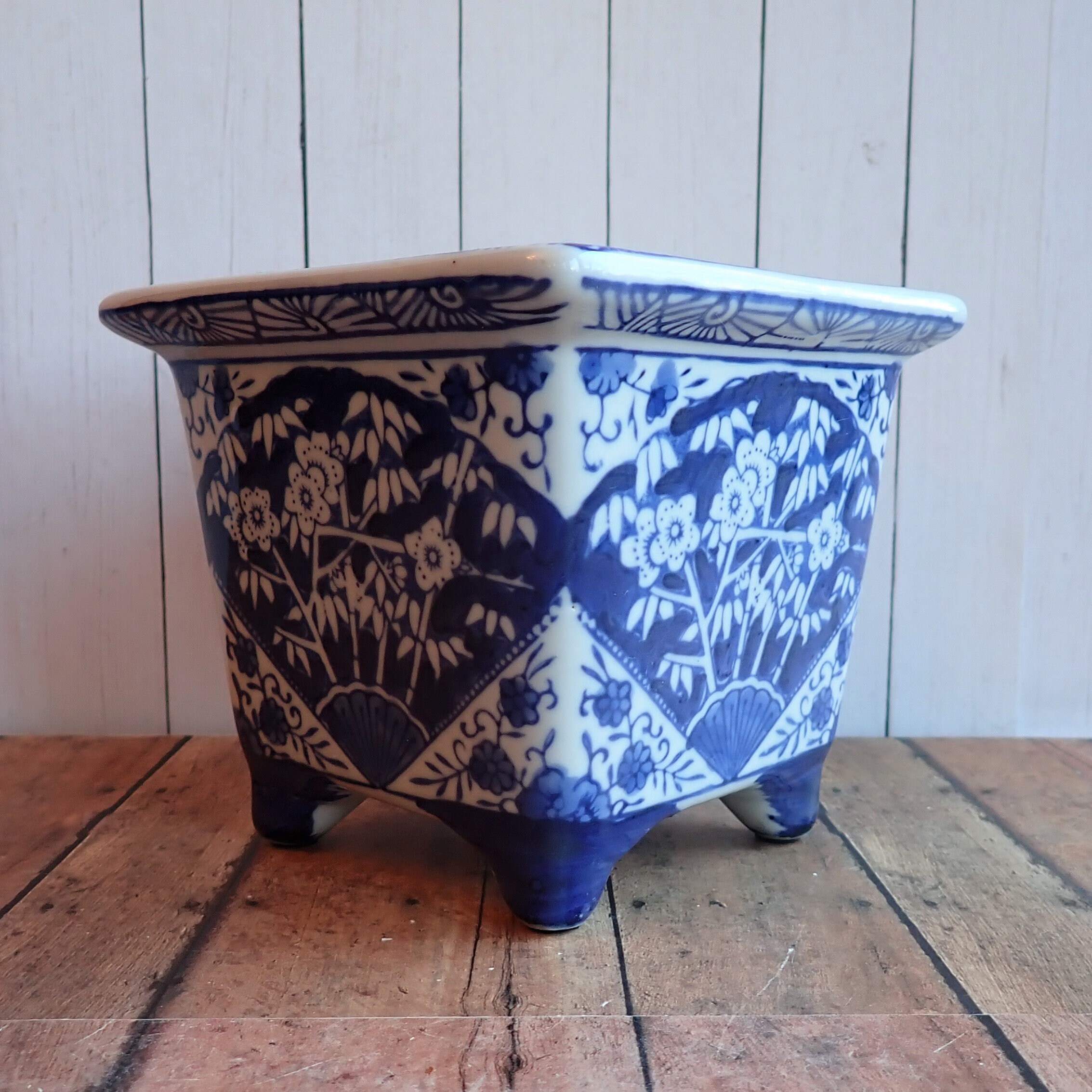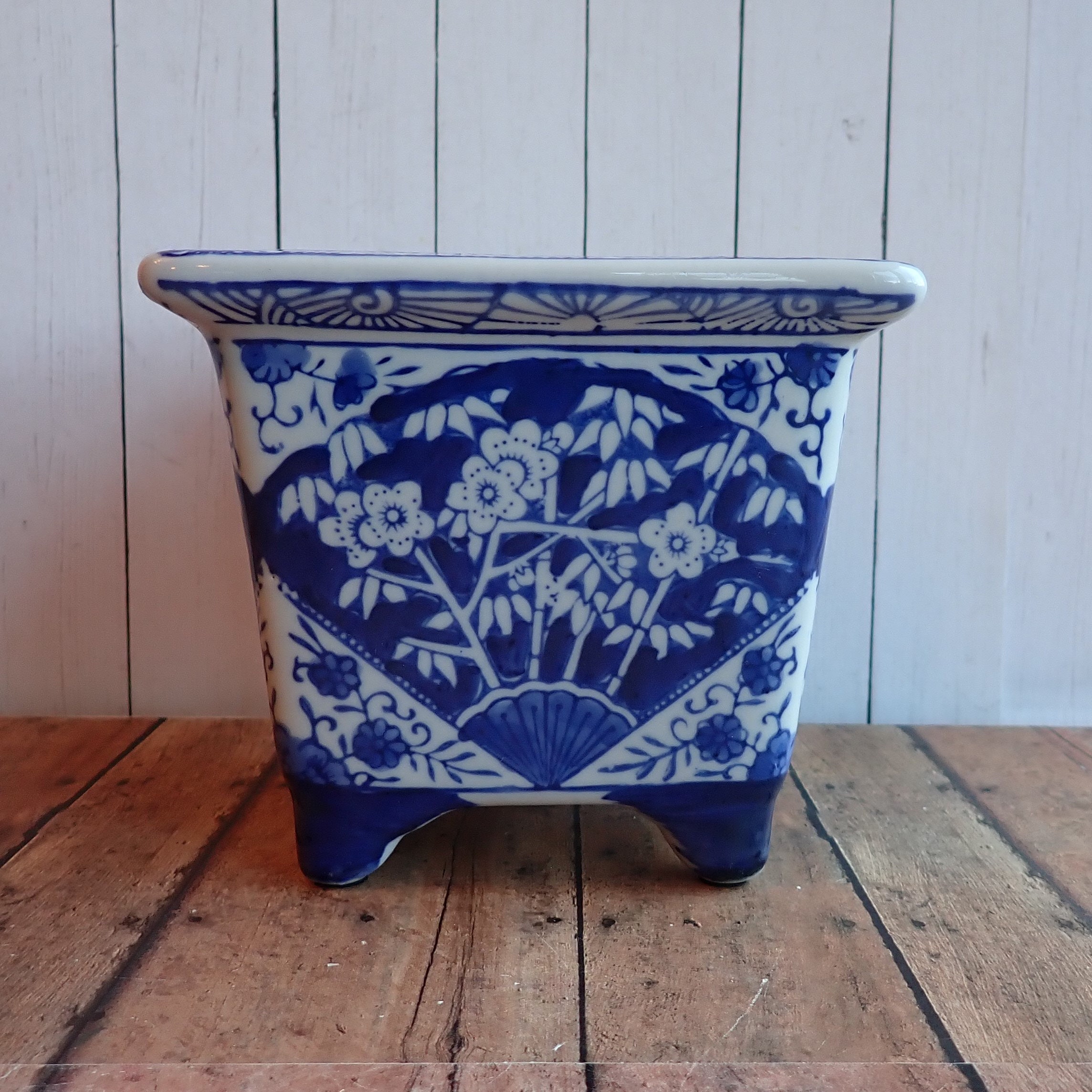 This ceramic planter is square shaped and is 4.75" tall and 5.5" wide and deep. It is a white ceramic piece and has a blue flower and leaf design on all 4 sides of the planter. The base has 4 small feet. There is no drainage hole in this piece.