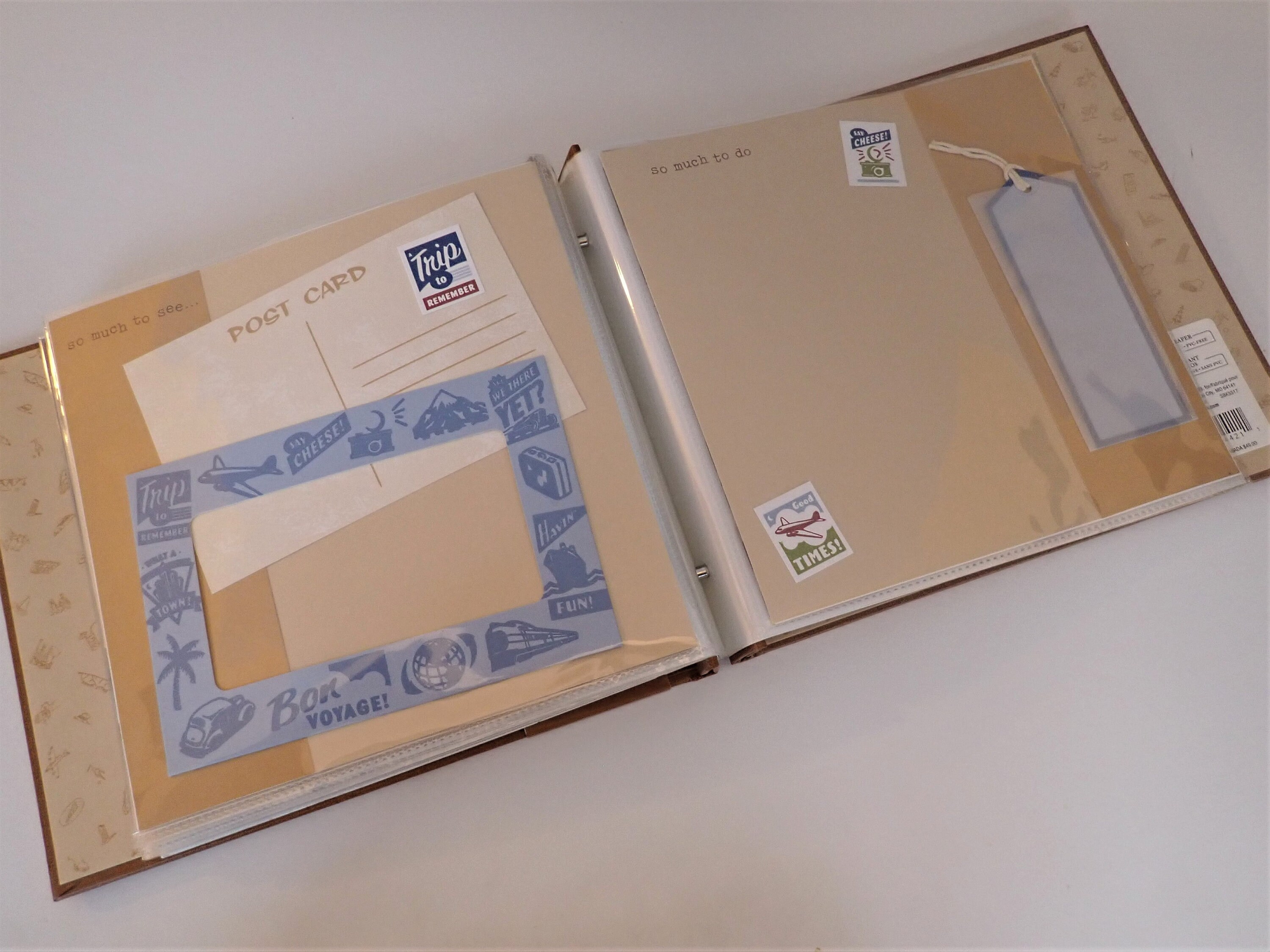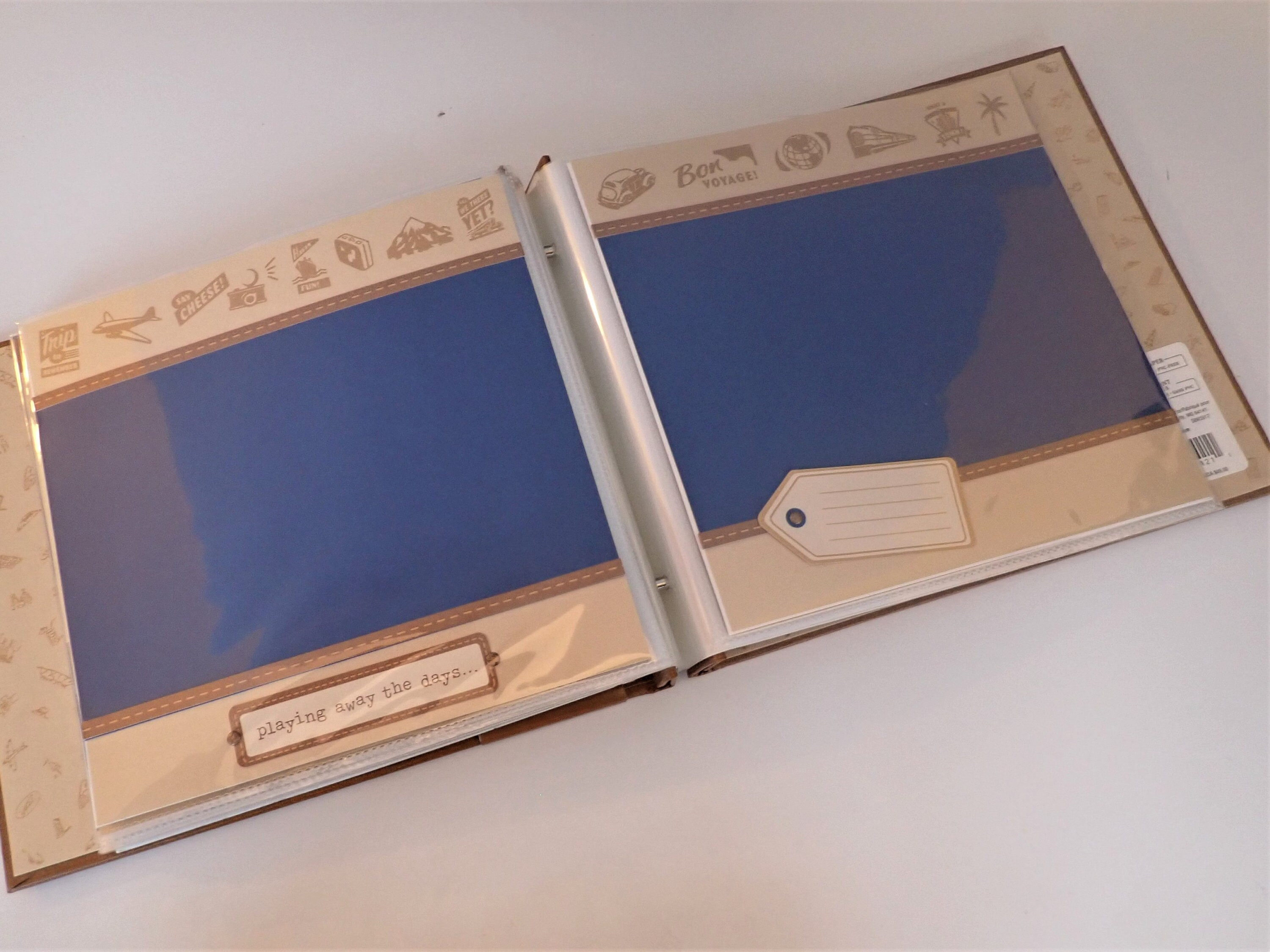 This 8x8 scrapbook album by Hallmark is their Instant Scrapbook - Vacation Days album and includes the album and 20 designed and embellished pages in page protectors (10 page protectors - 20 pages front and back). There is also an additional sheet of stickers for you to add to the pages. The album and pages are in brown, beige, and blue colors, with green, red and cream accents here and there and have a travel theme with postcards and frames.