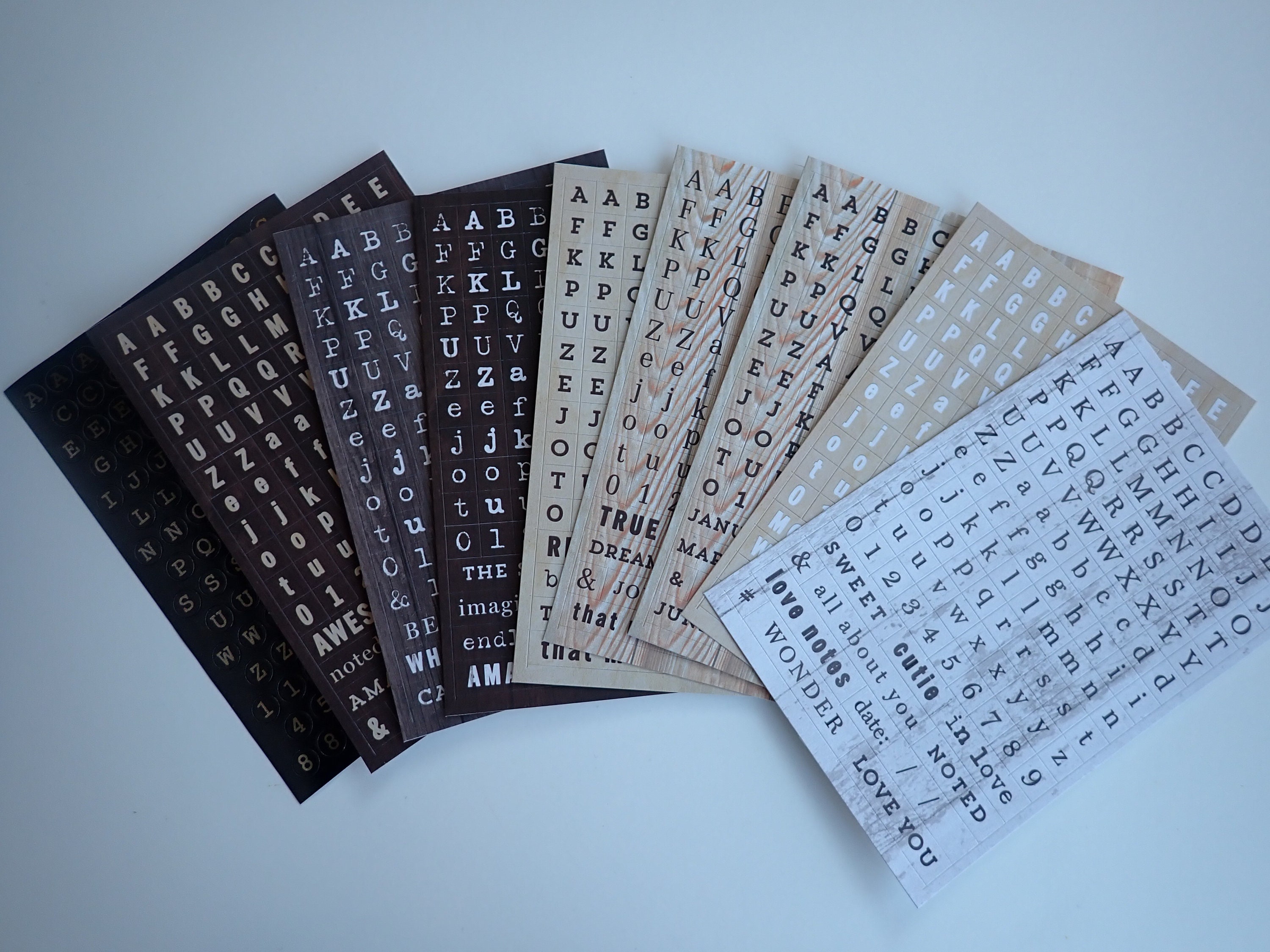This set of stickers includes 20 new sheets of alpha stickers in coordinating vintage typeface fonts. They are all different patterns, and many have a wood grain design. The sticker are all relatively small - the larger circle stickers are 1/2" each in diameter, and the smaller square stickers are about 1/4" wide and tall. Two of the sheets are rub-on and not stickers - these are the 2 Architexure Packages.
