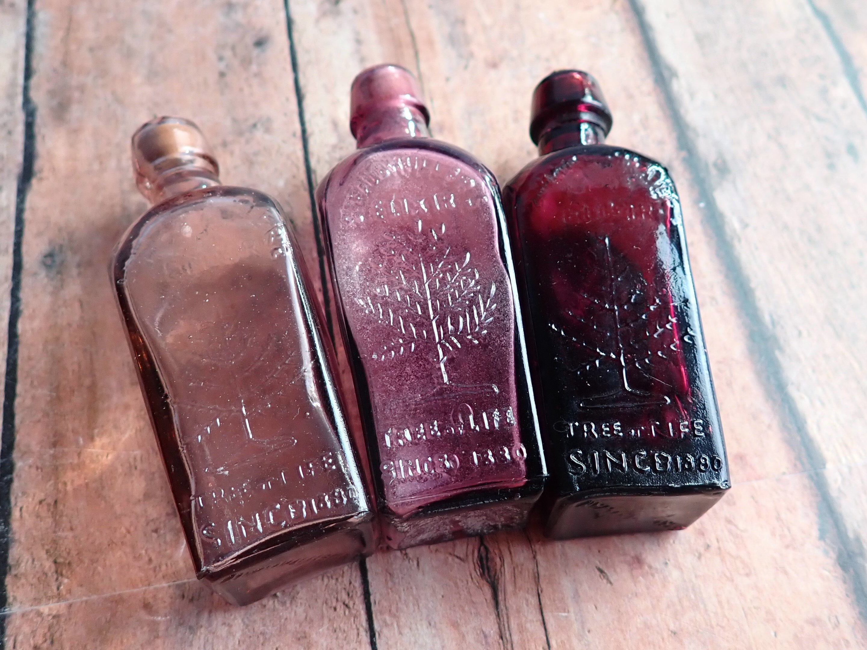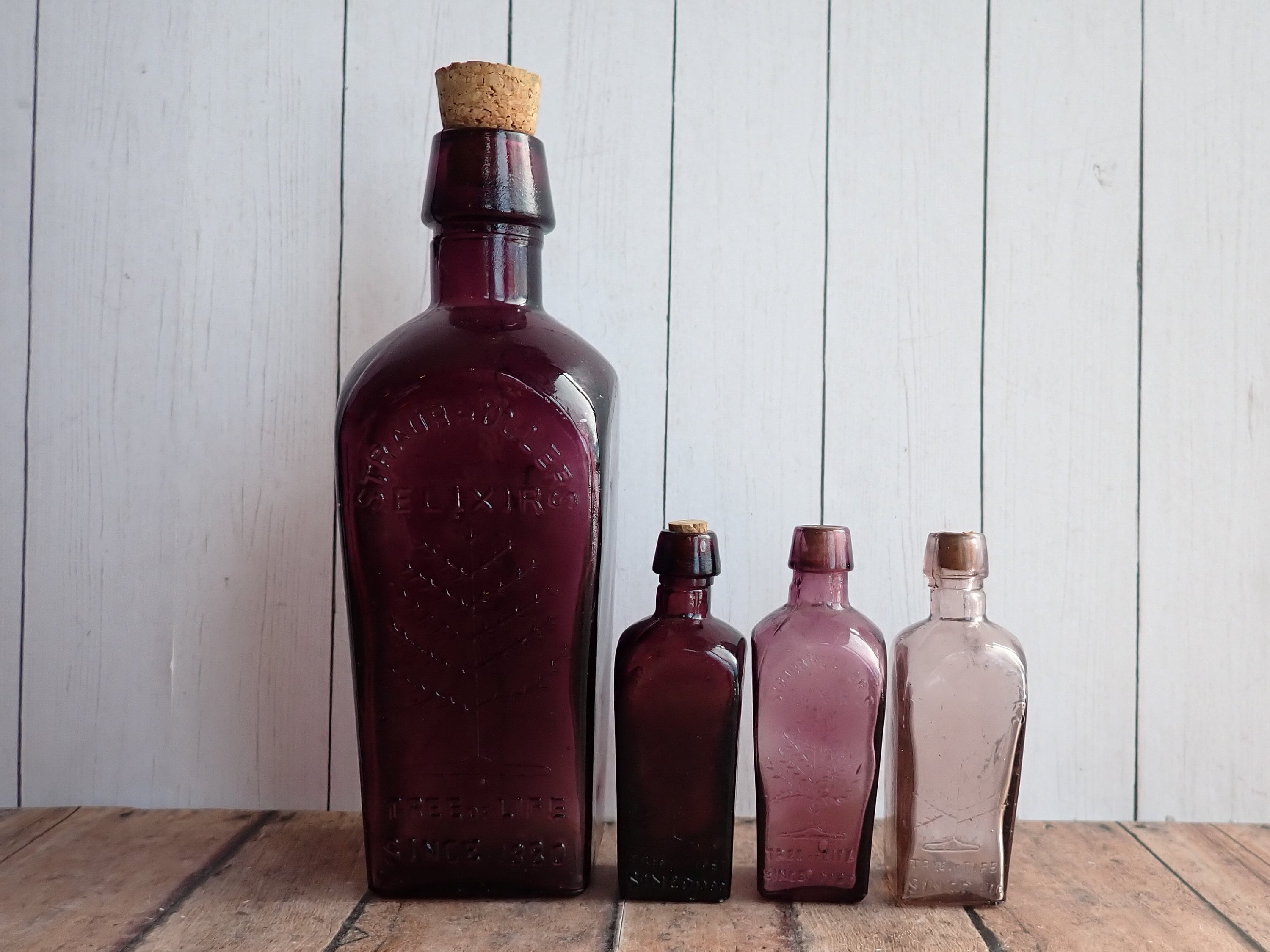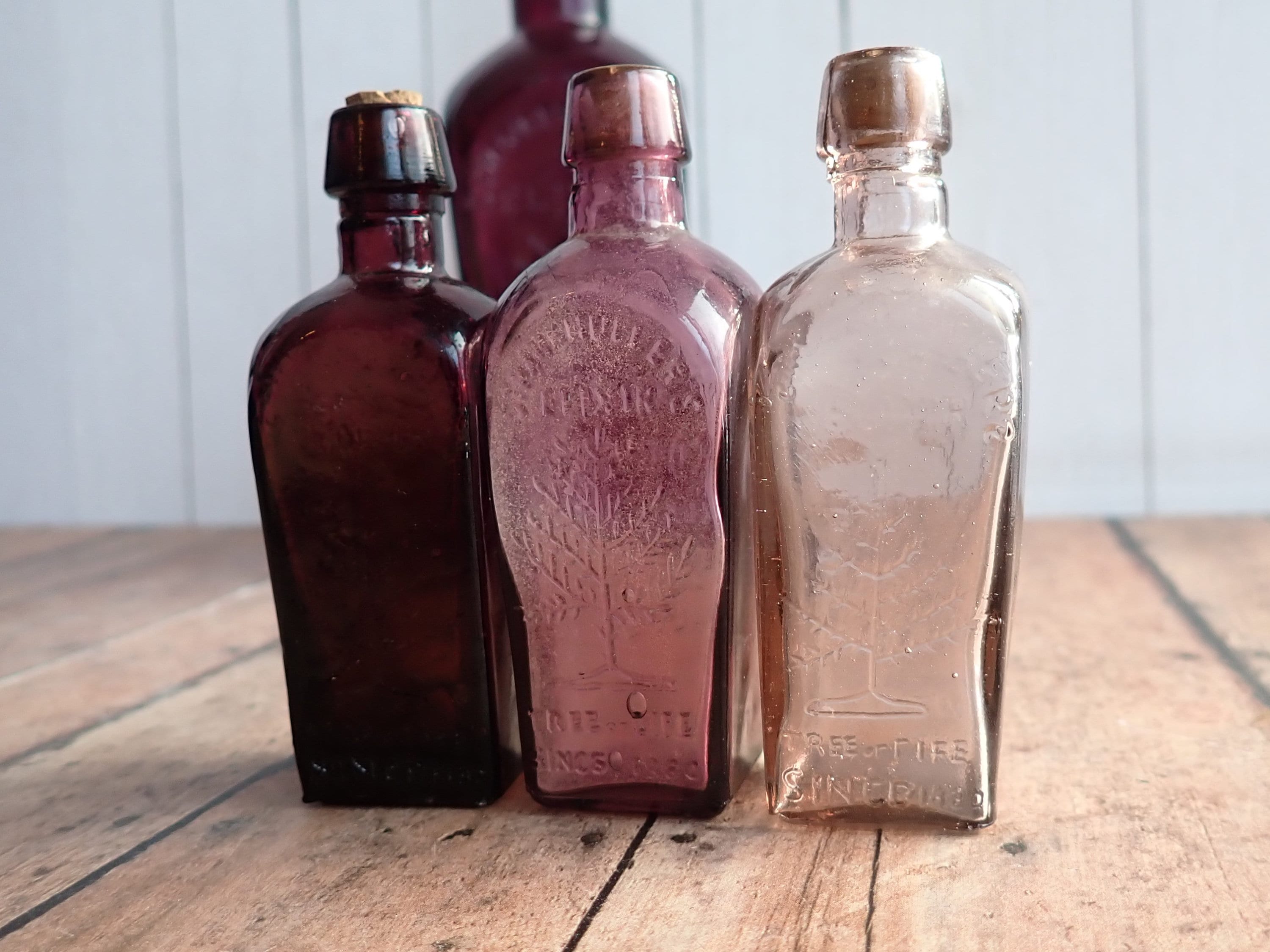 This set of 4 purple Wheaton bottles includes one large bottle and 3 small bottles in the same style in various shades of purple. The large bottle is 6.75" tall and 2" wide, and the small bottles are all 3.25" tall and 1" wide. They all have a tree design and read: Straub Hullers Elixer / Tree of Life / Since 1880.
