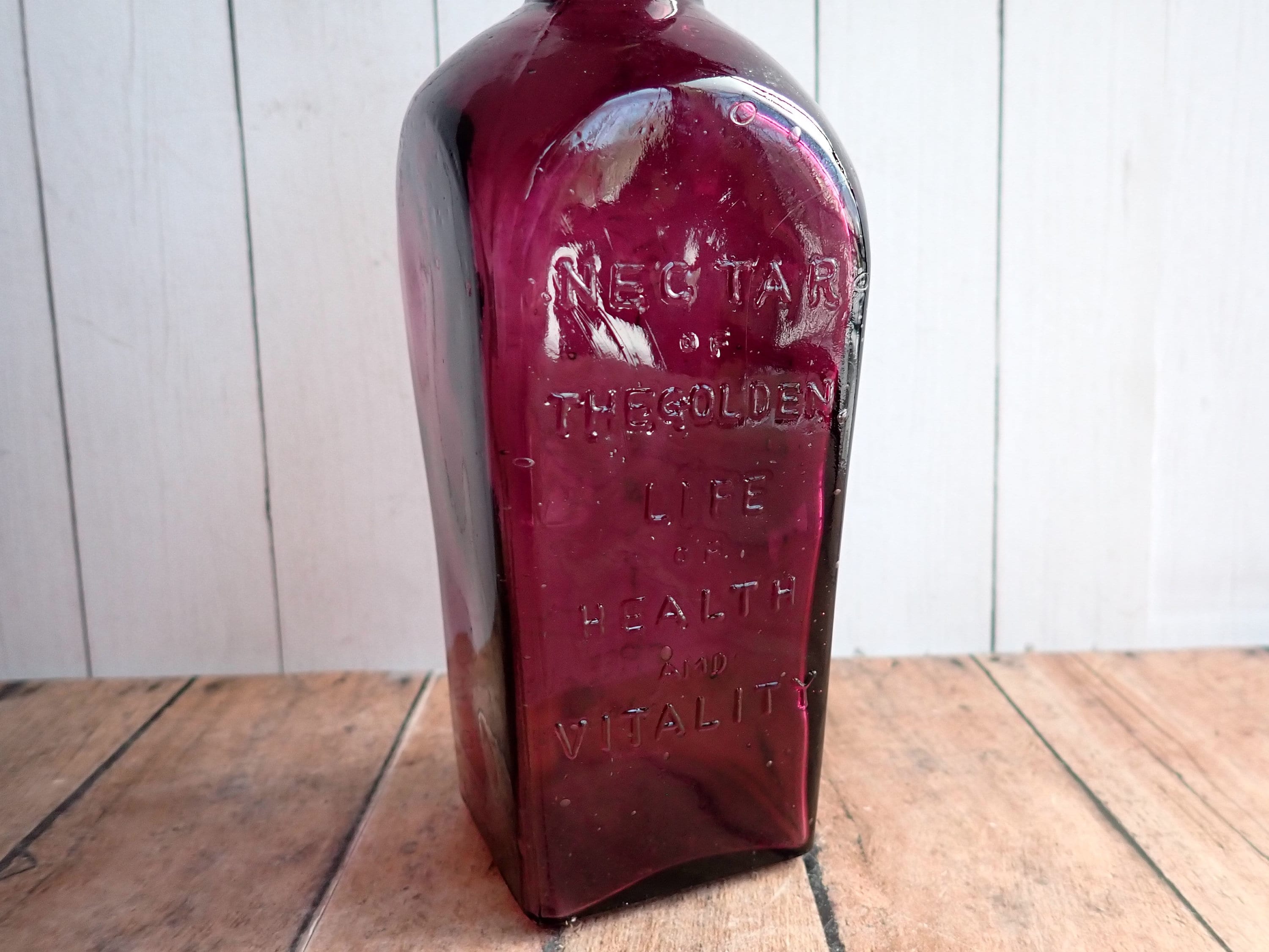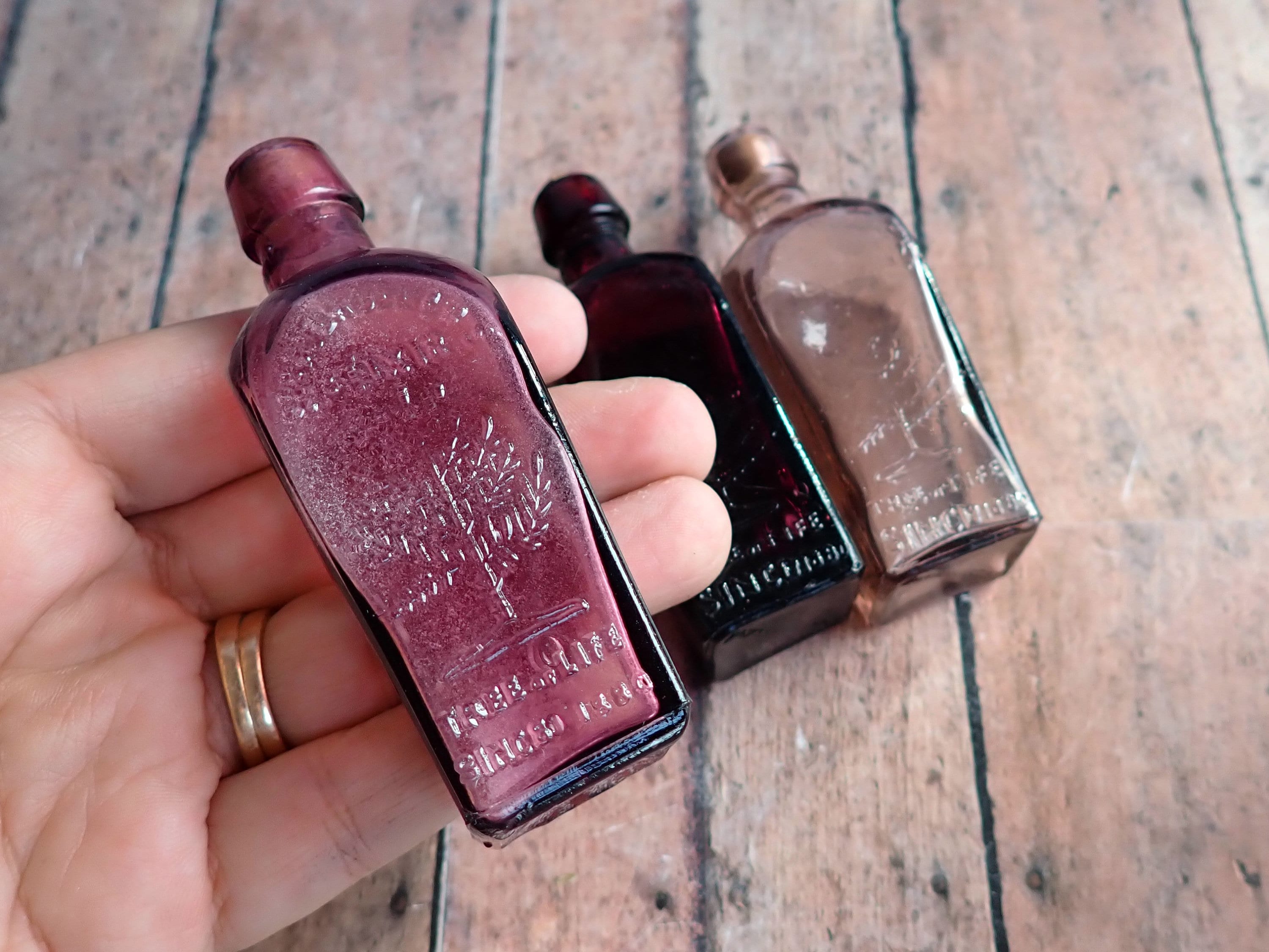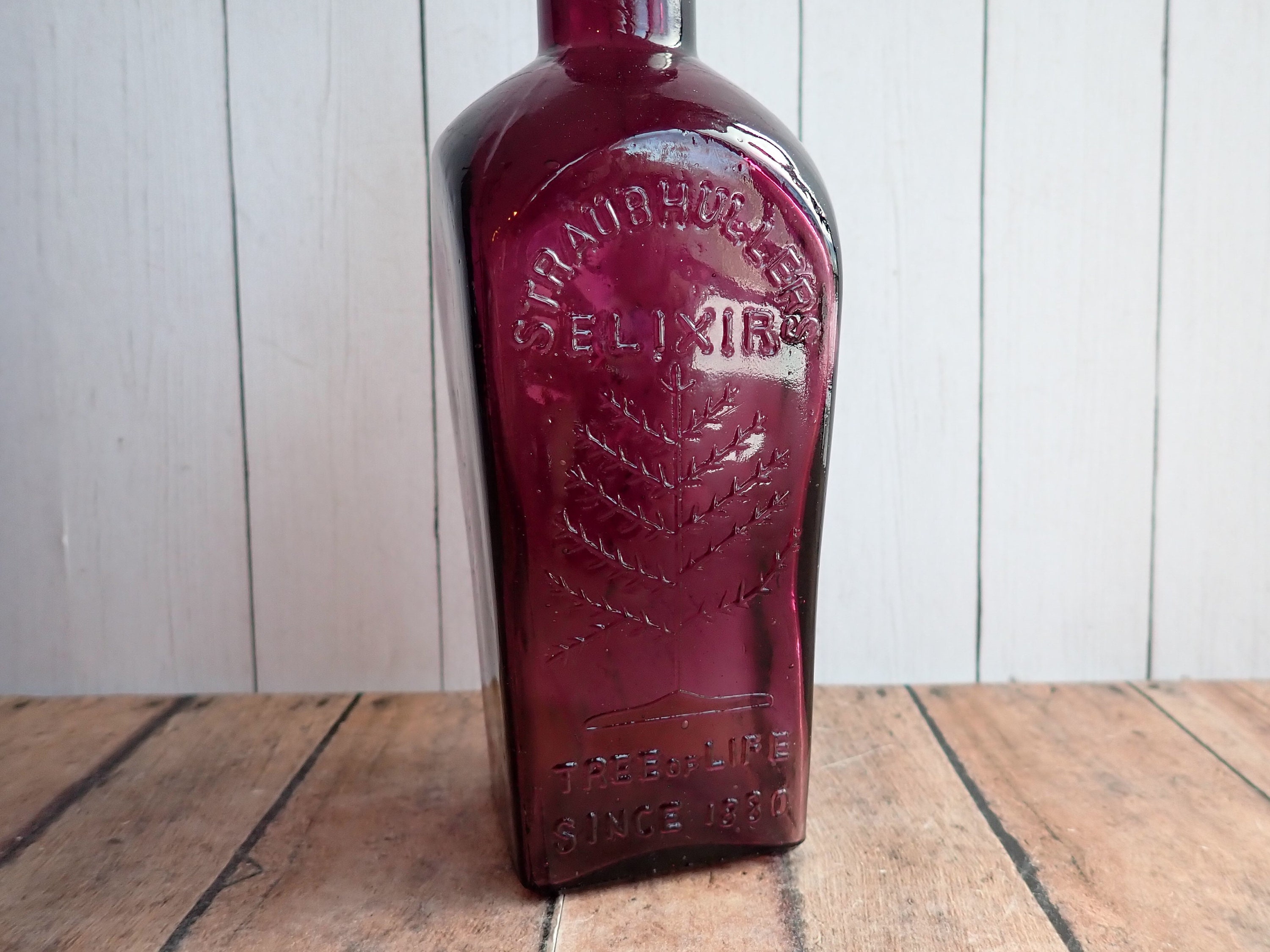 This set of 4 purple Wheaton bottles includes one large bottle and 3 small bottles in the same style in various shades of purple. The large bottle is 6.75" tall and 2" wide, and the small bottles are all 3.25" tall and 1" wide. They all have a tree design and read: Straub Hullers Elixer / Tree of Life / Since 1880.