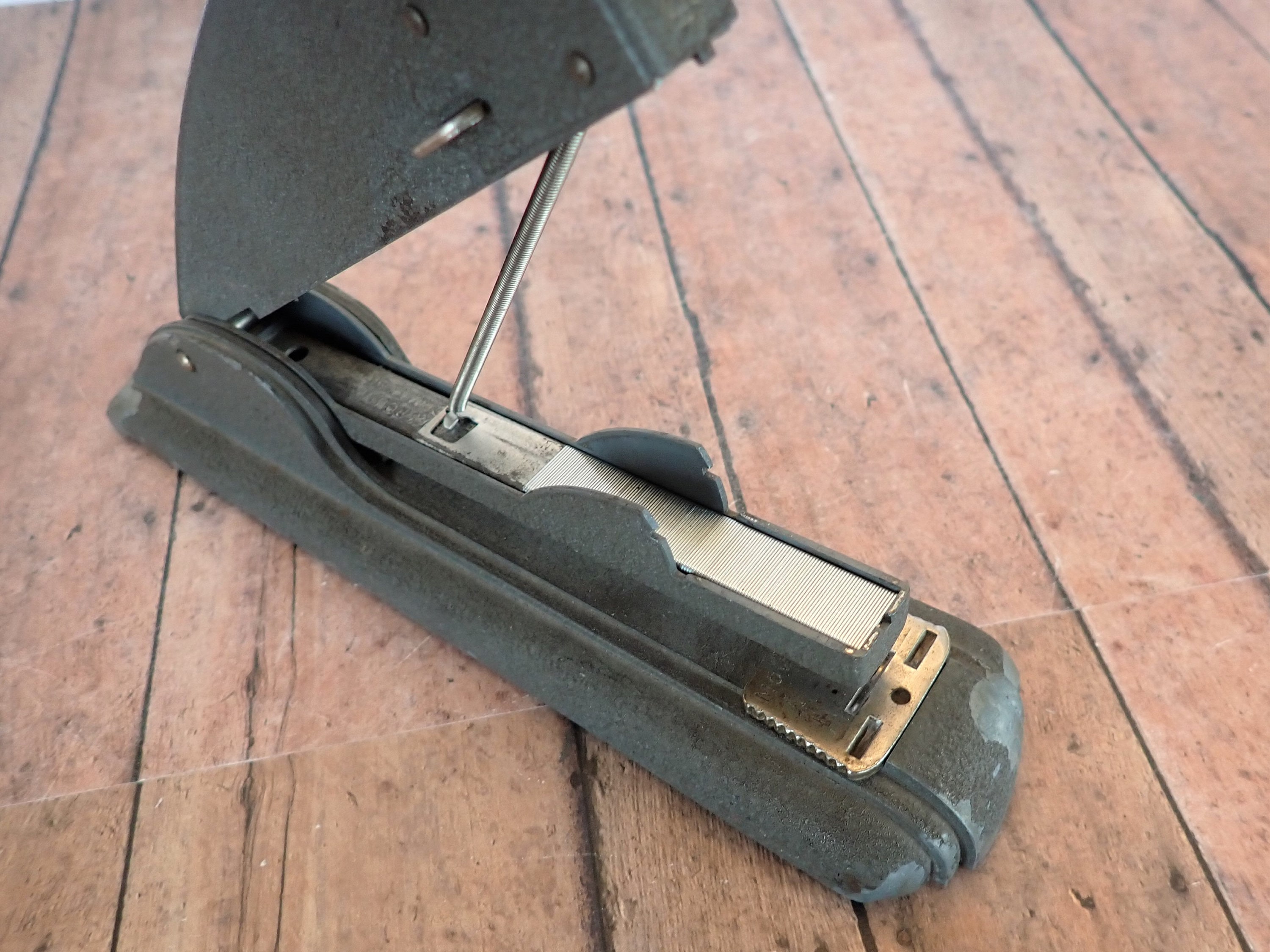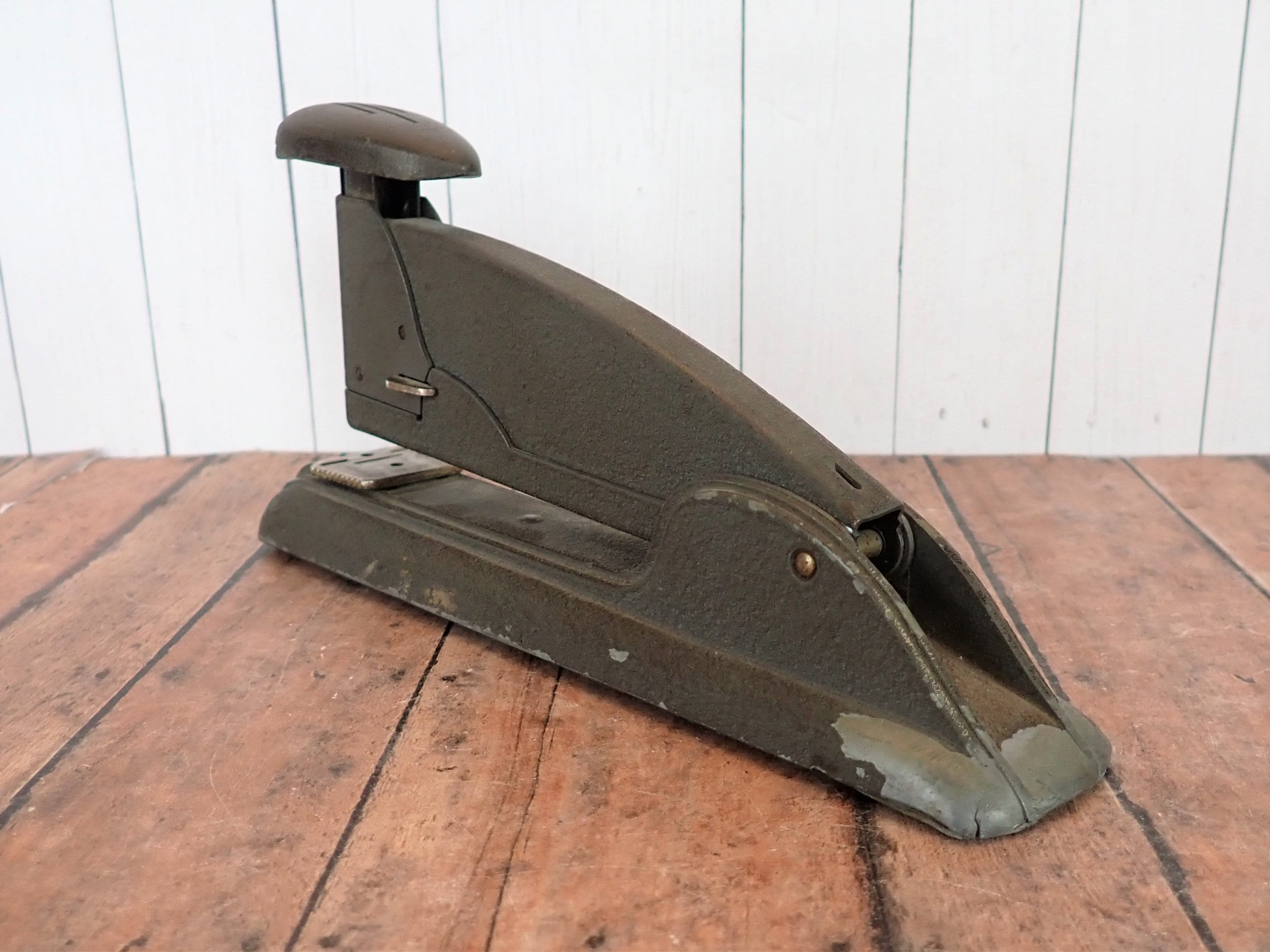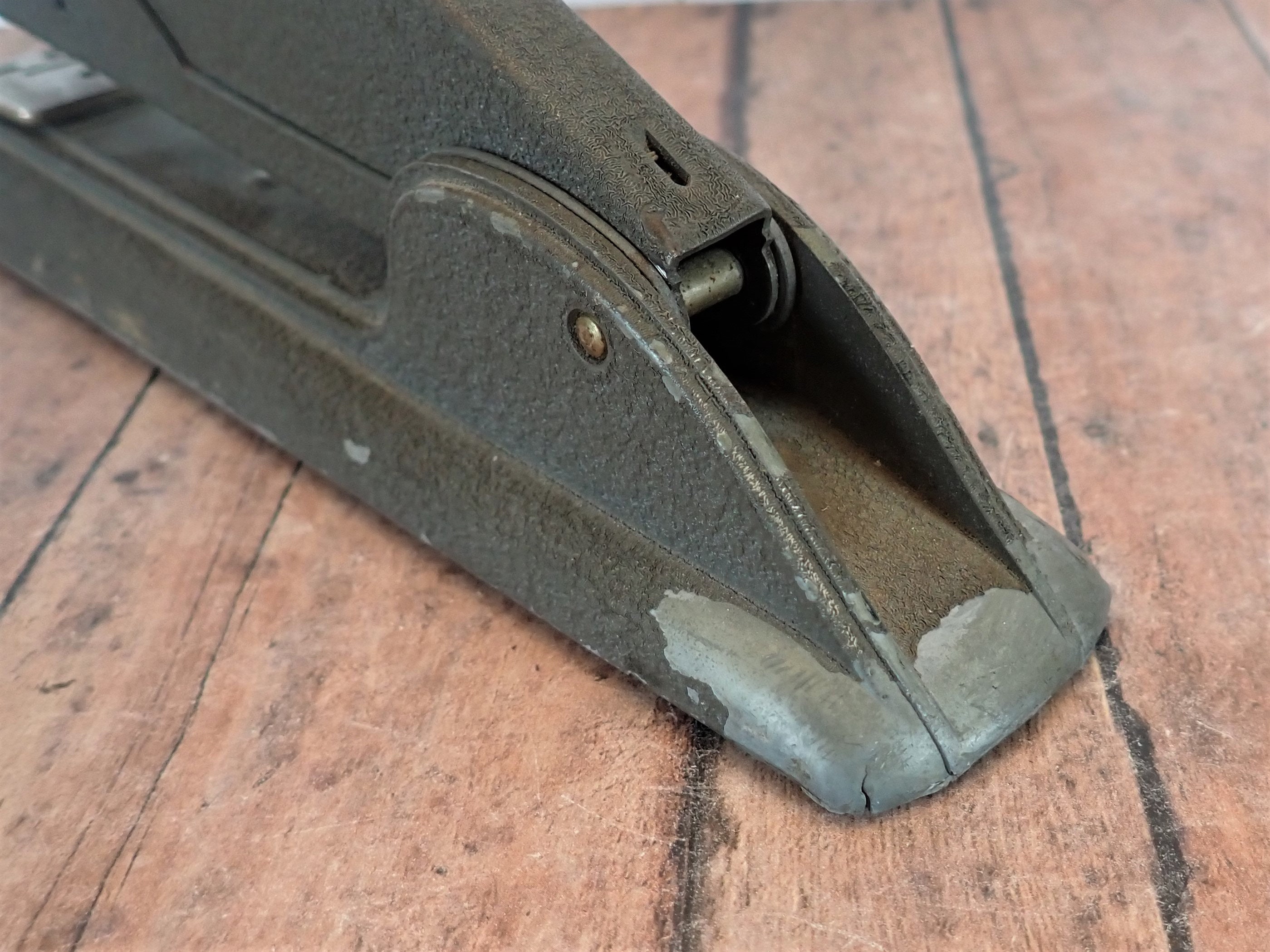 The stapler is in good condition but does show some wear and age - the stapler has a lightly textured coating over the metal which is worn off in areas - most noticeable on the back and front of the stapler (as shown in the last 2 photos.) The stapler holds standard staples and functions perfectly.