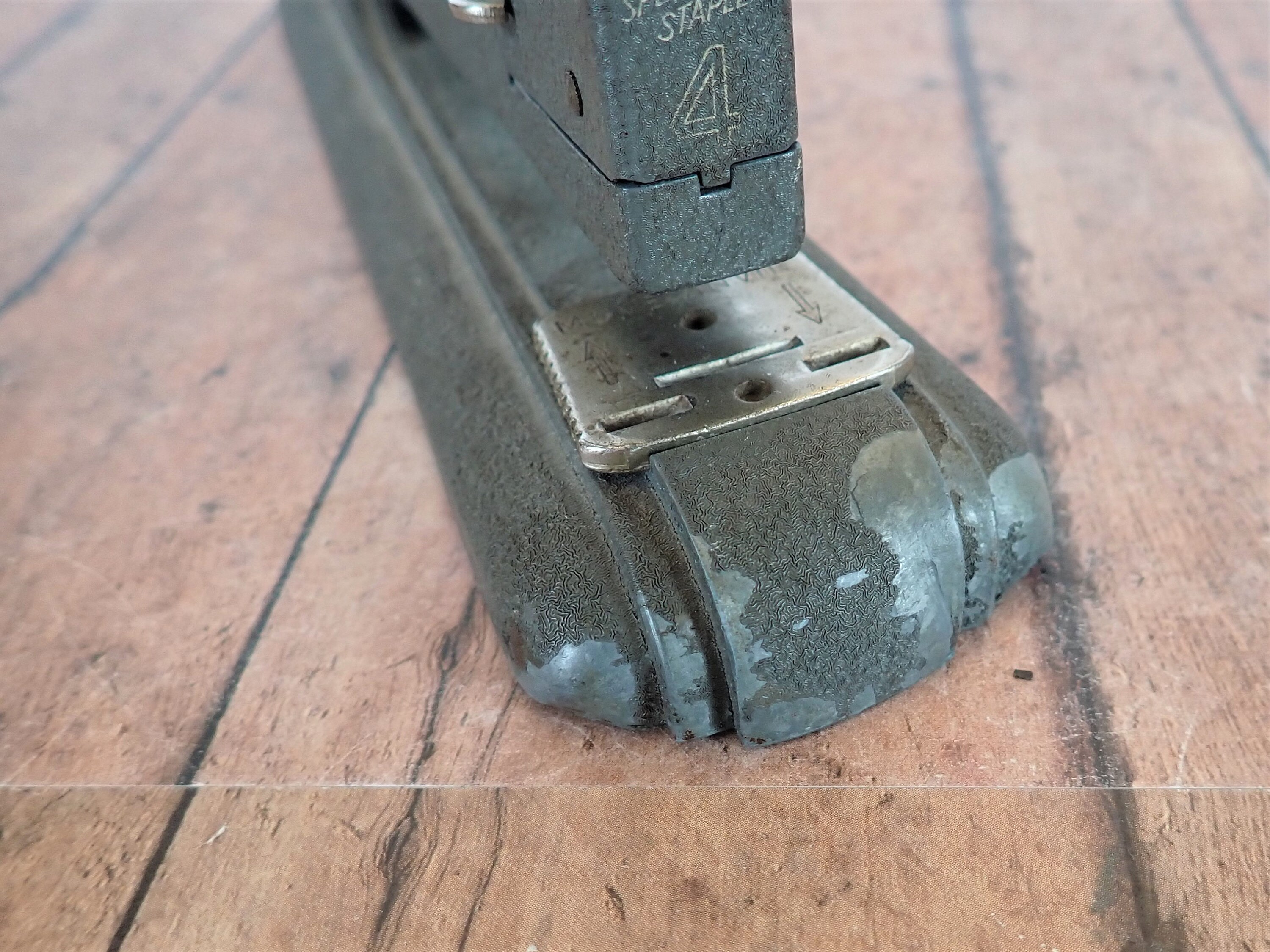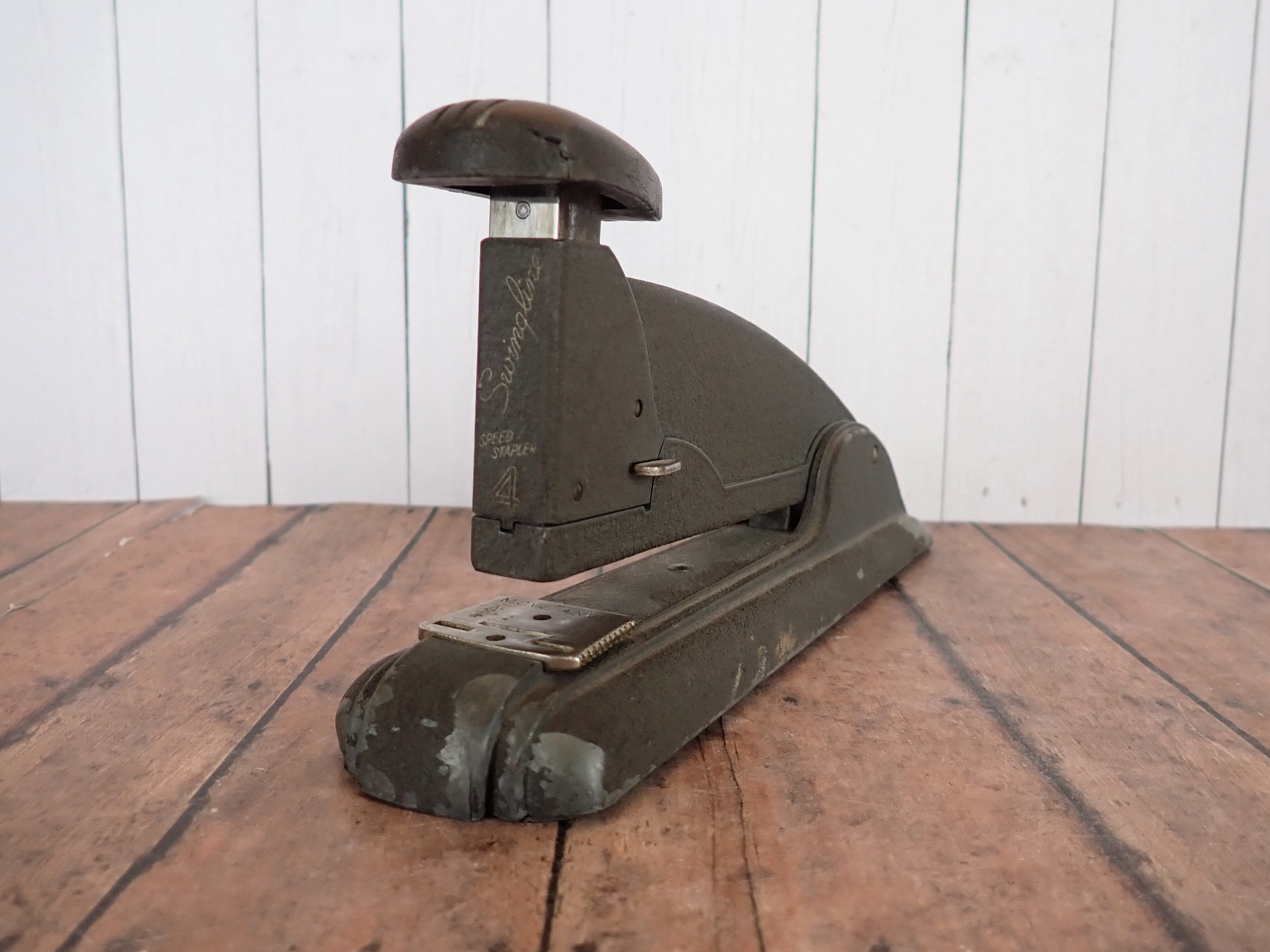 This vintage Swingline Stapler is a larger size stapler, and is 8" long, 2" wide, and 4" high. It is a gray metal piece, and is marked: Swingline / Speed Stapler 4 on the front.