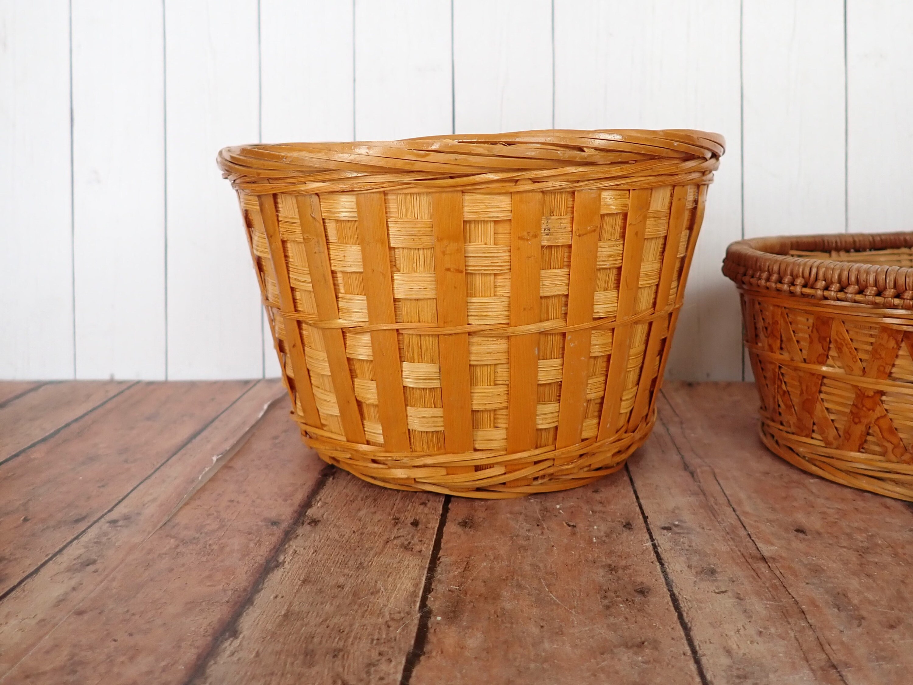 All 4 baskets are in very nice condition with no breaks in the wicker or weaving. There is some light wear here and there. The large basket does have a crack in the band around the rim, which causes it to point outward a bit where the crack is and there is a small area of discoloration along the rim. These 2 issues are shown in detail in the last 2 photos.
