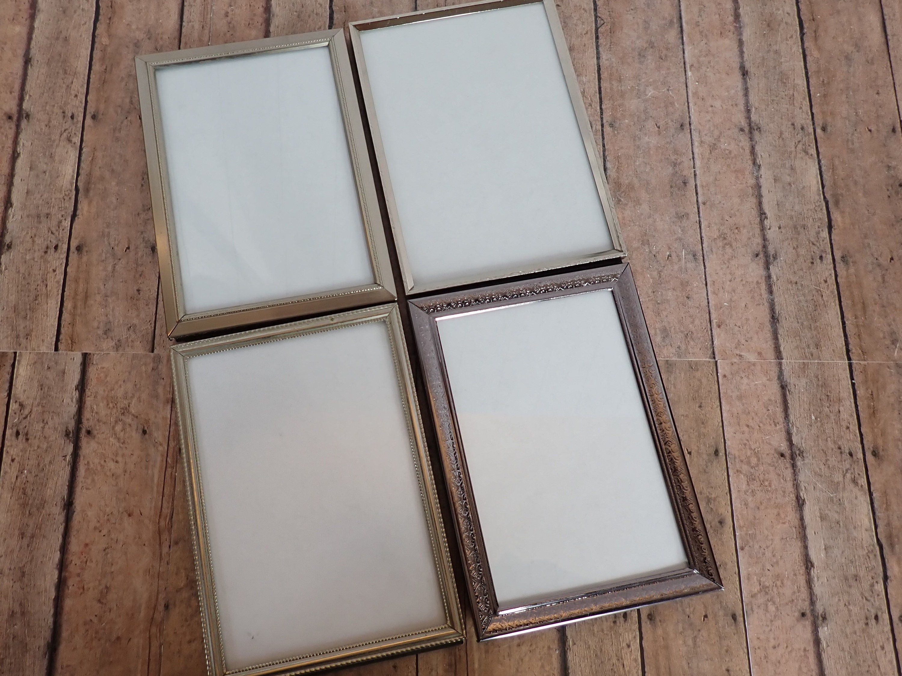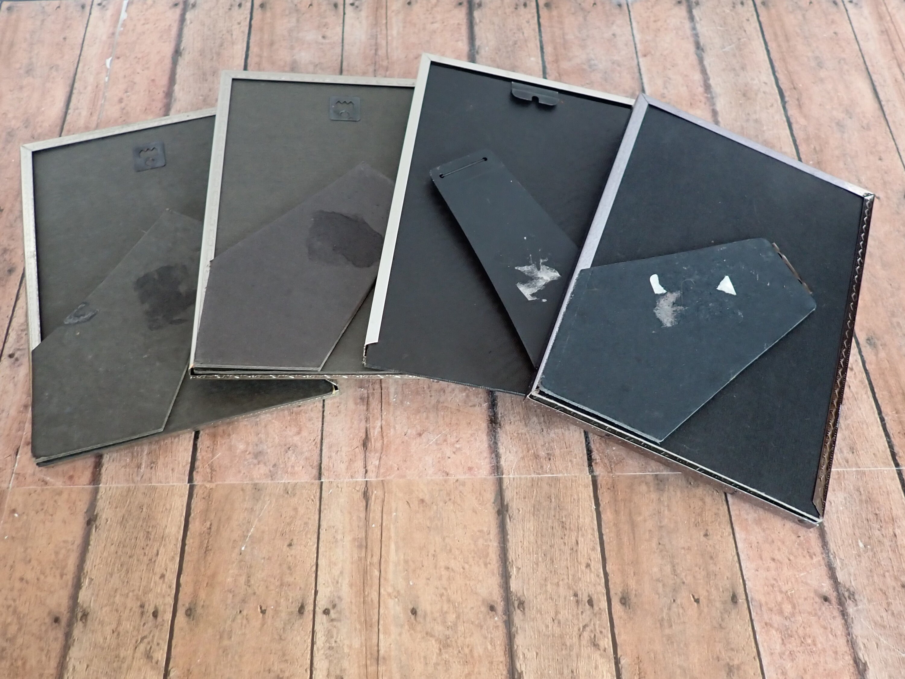 All 4 frames are in very nice condition, and have a piece of clear glass over the photo opening and a cardboard backing piece with a photo stand. The frames can stand either vertically or horizontally.