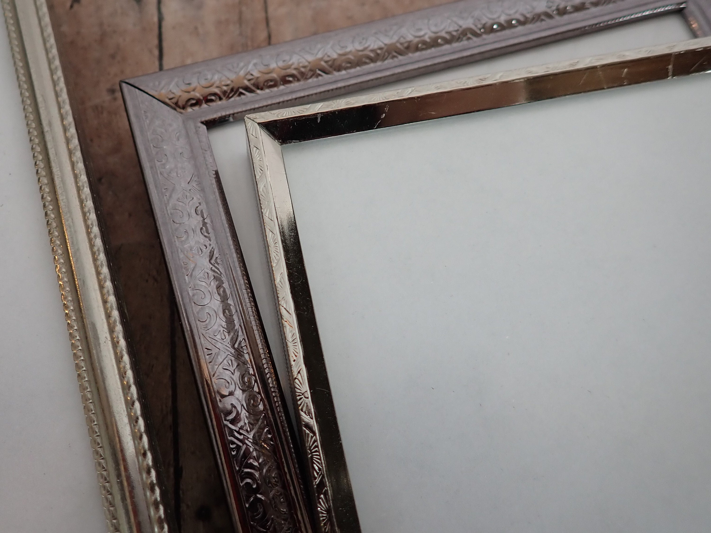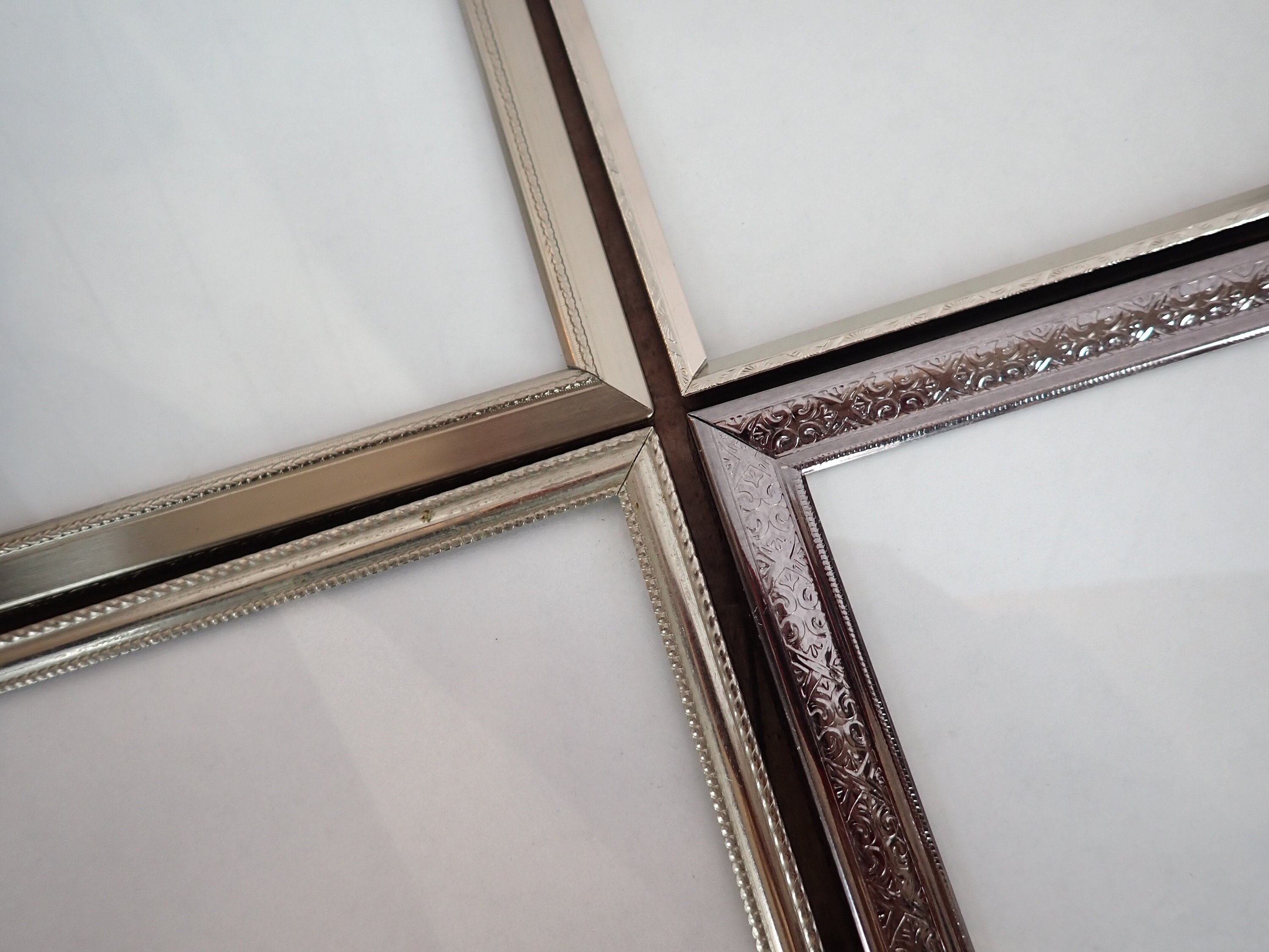 This set of frames includes 4 coordinating silver colored frames. All 4 frames are 5x7 size and have a nicely detailed traditional design around the frames. The photos can stand either vertically or horizontally. Two of the frames are a shiny silver, and two are more matte or brushed silver.