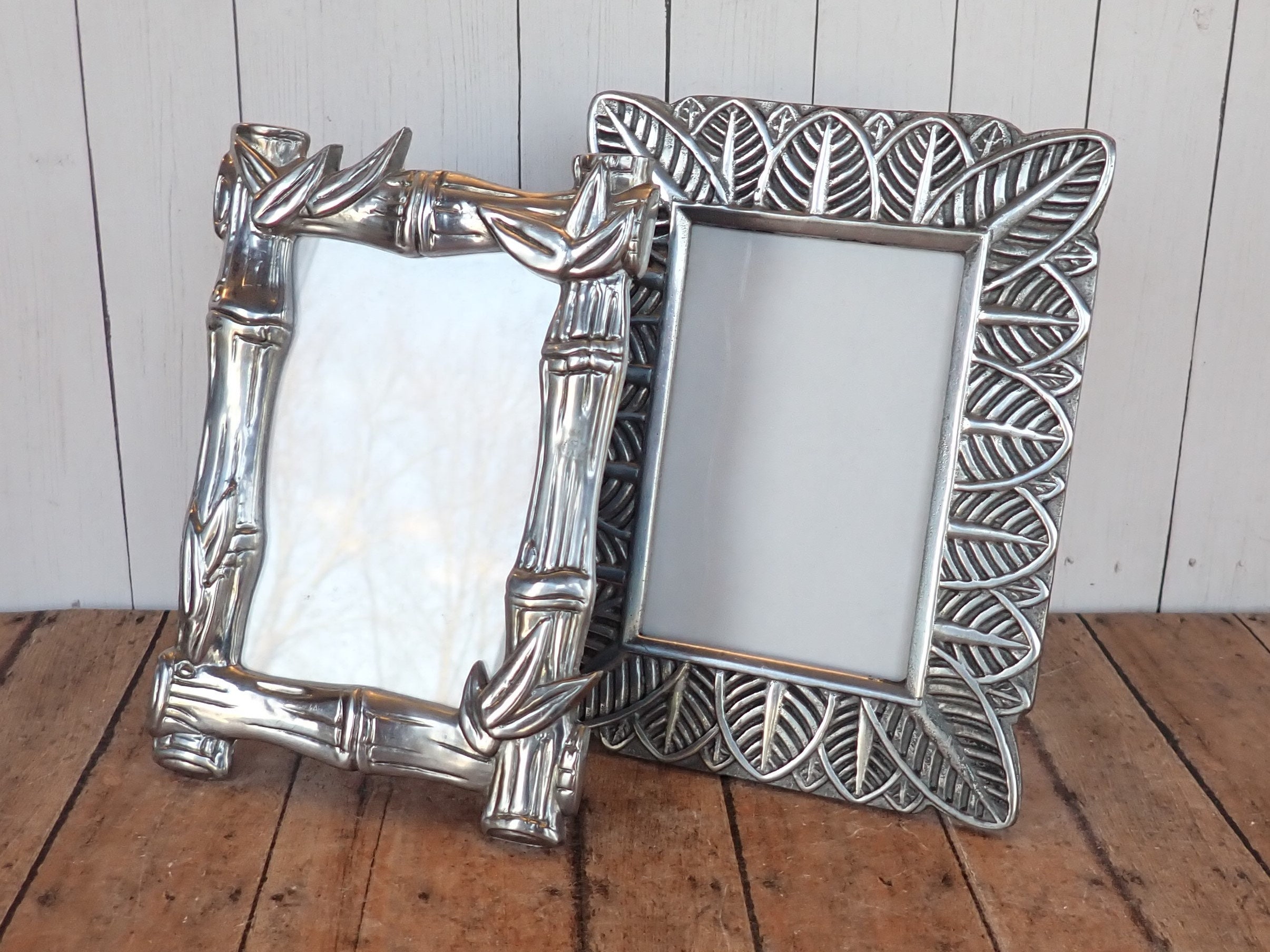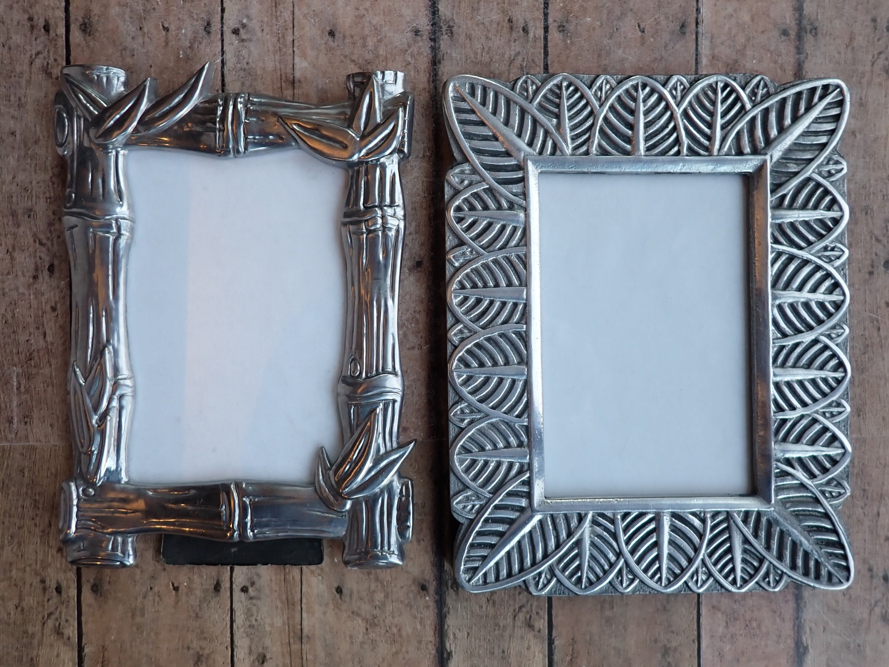 This set of 2 metal photo frames includes two 3 1/2" x 5" frames with tropical design. One frame has a leaf design and the other has a bamboo design. Both frames are silver metal and can hold one 3.5" x 5" photo.