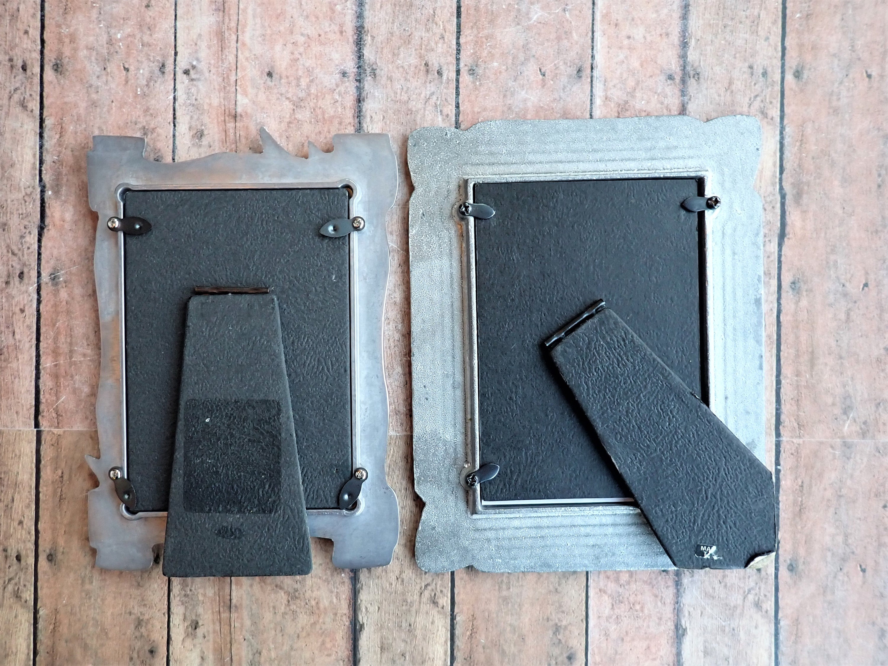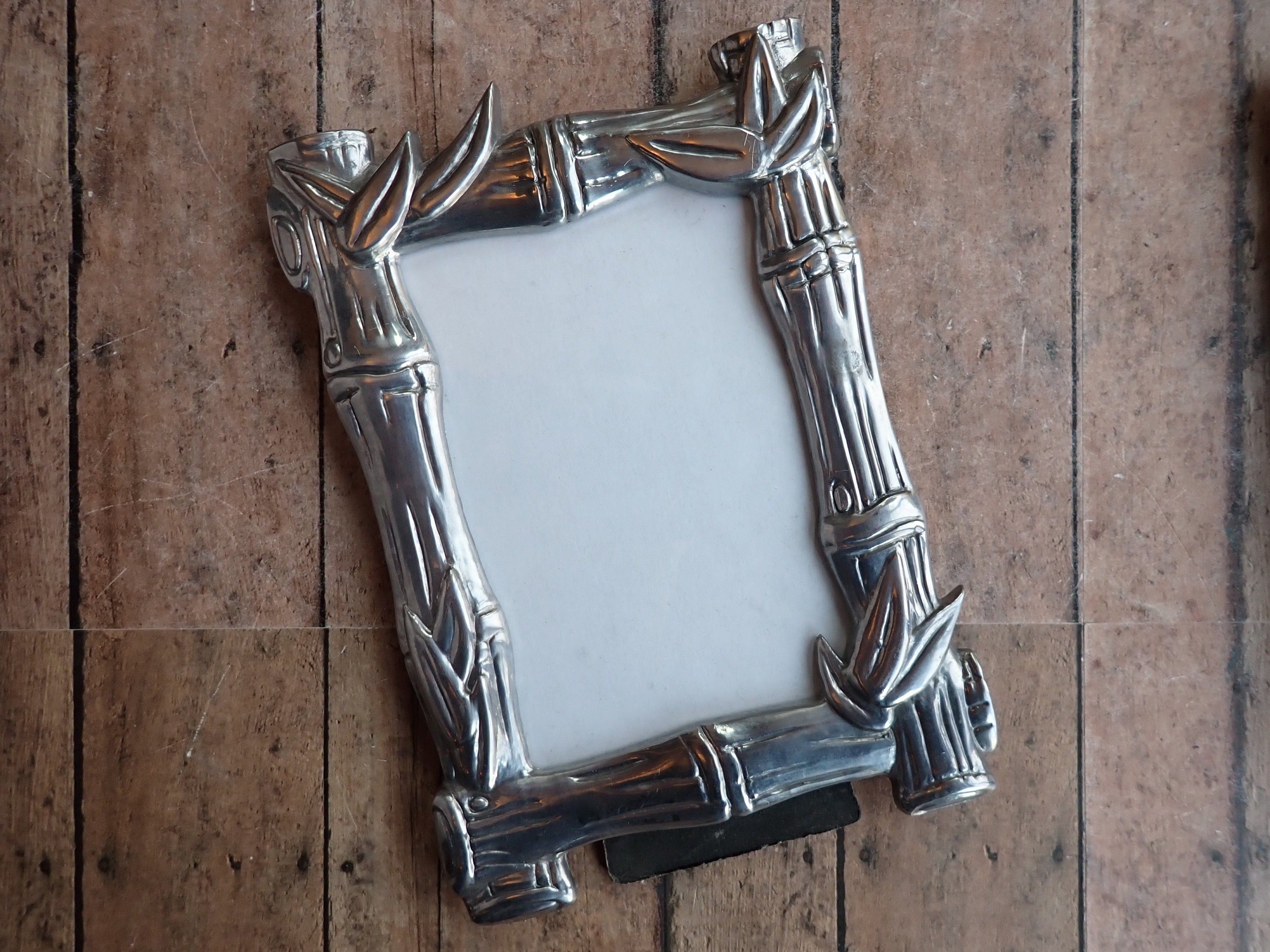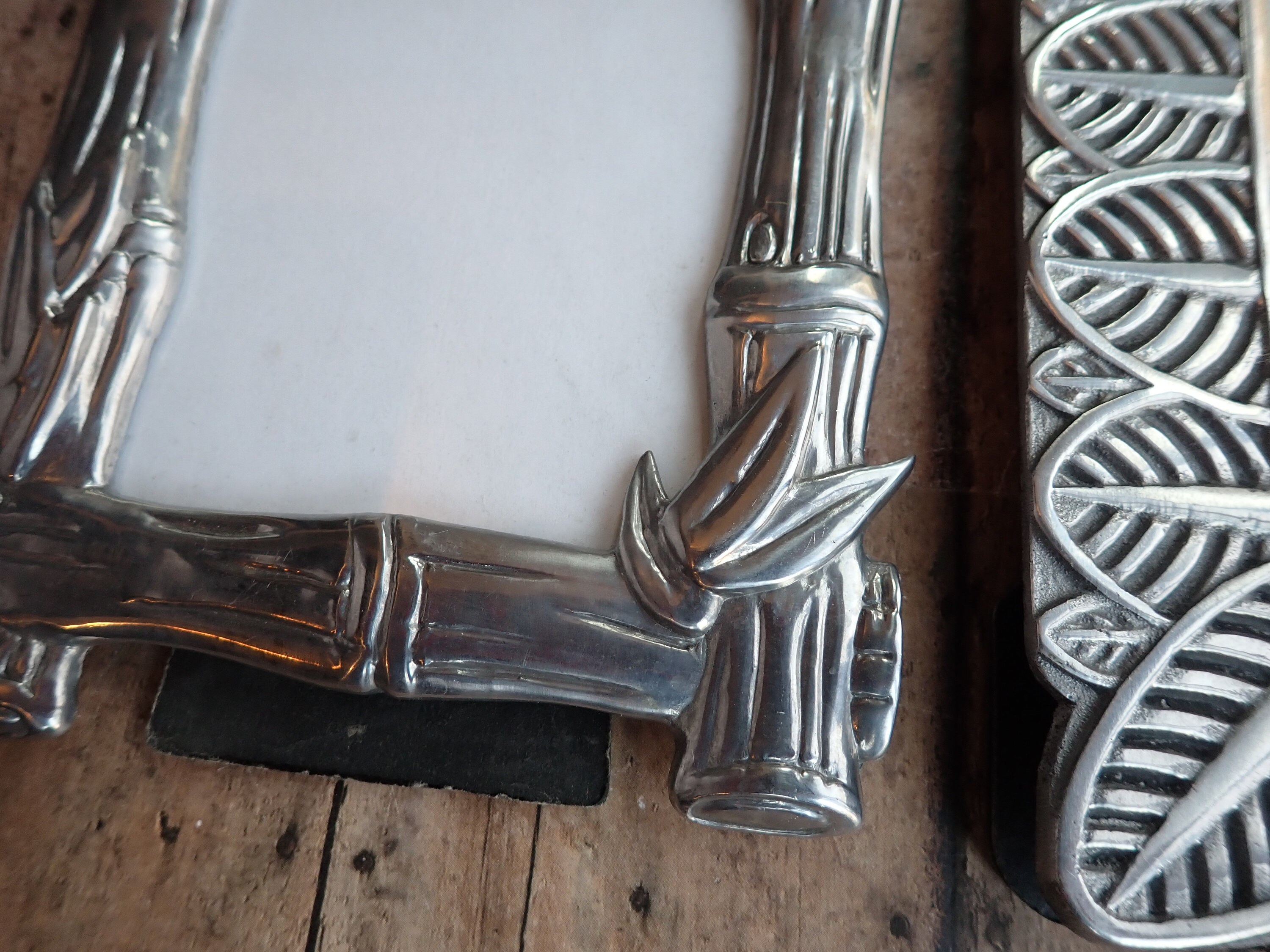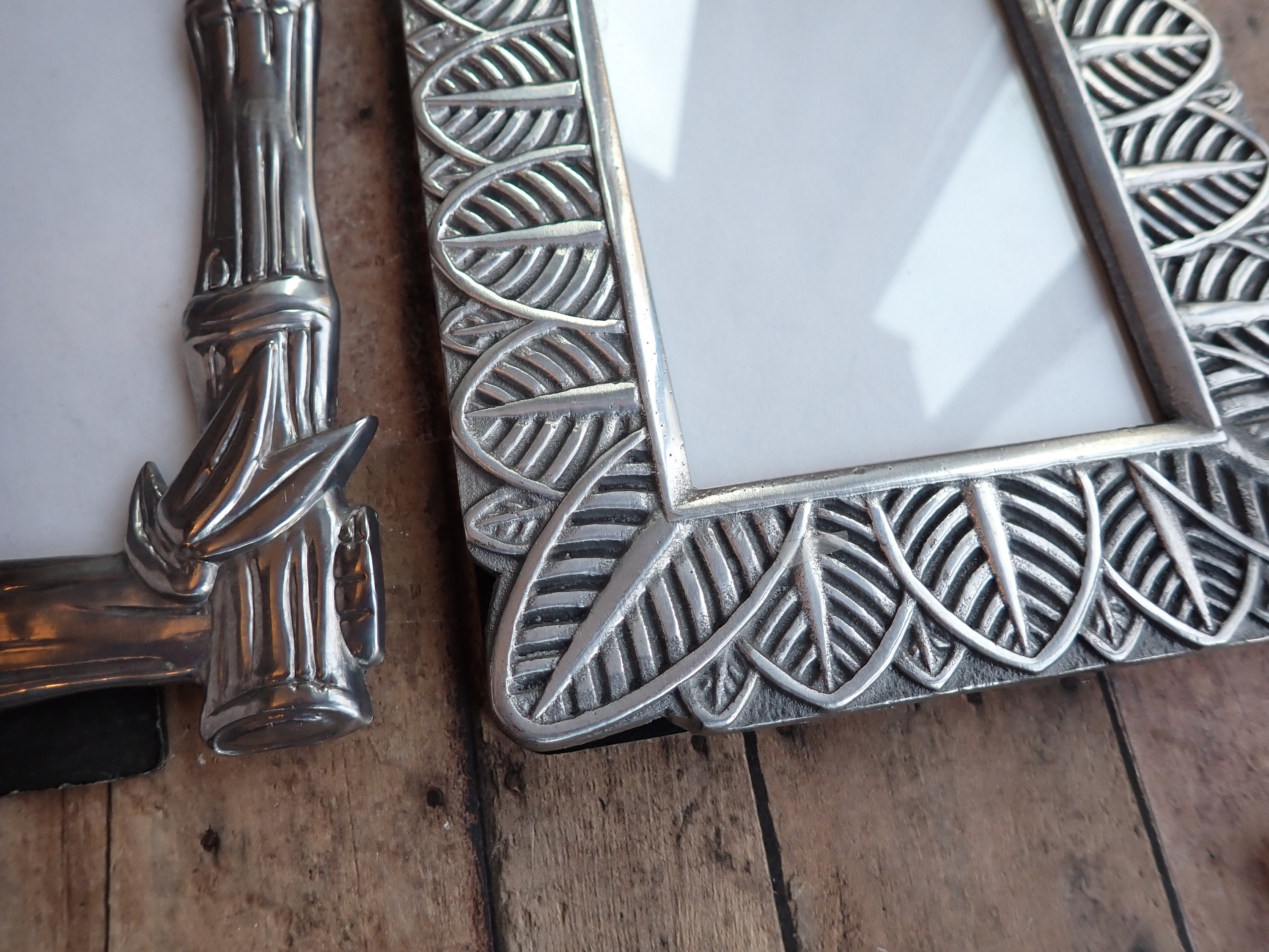 Both frames are in very good condition and both have a clear glass covering over the photo opening and a black cardboard backing piece with a fold-out stand. The leaf frame can stand either vertically or horizontally, but the bamboo frame can only stand vertically.
