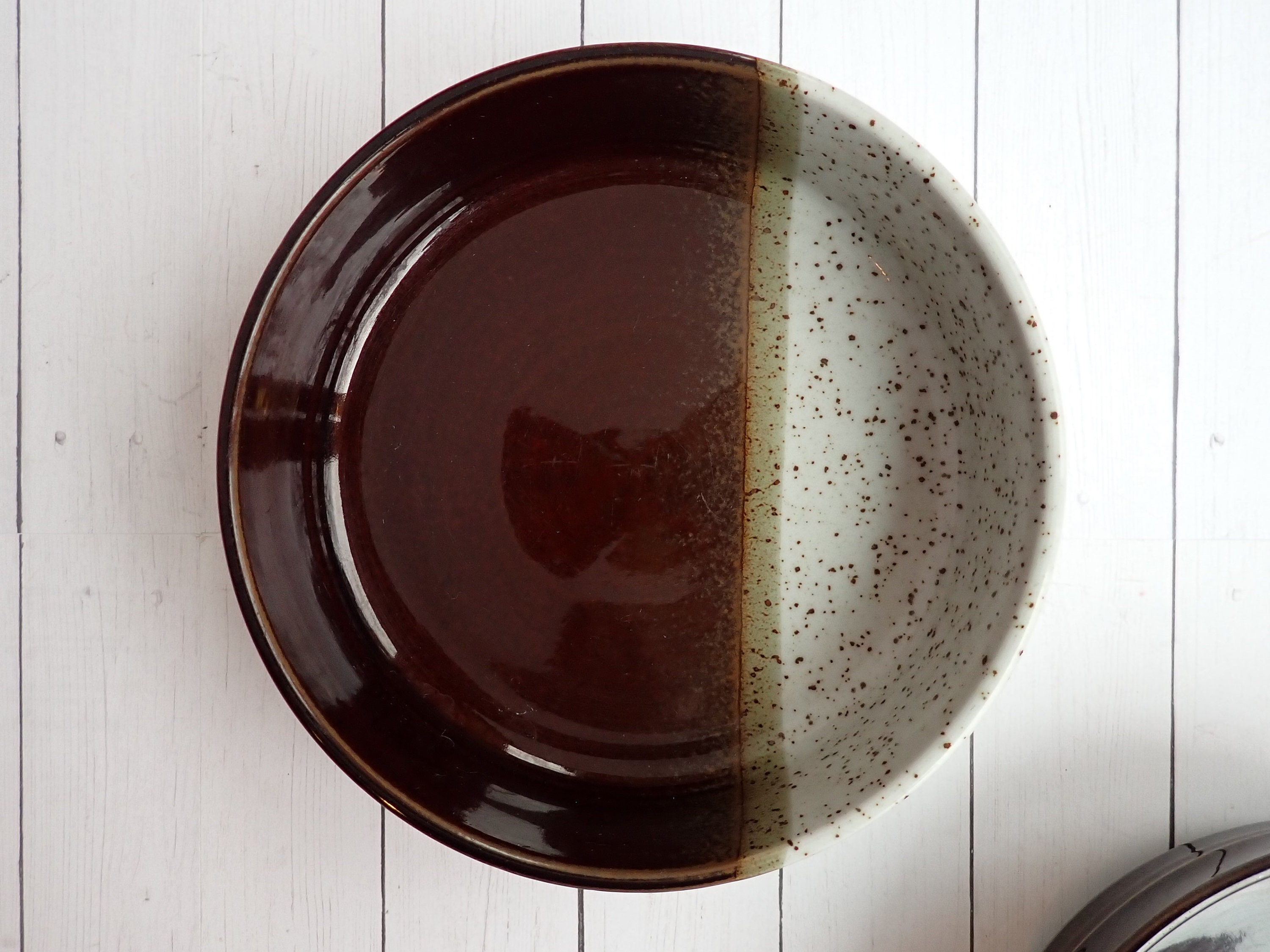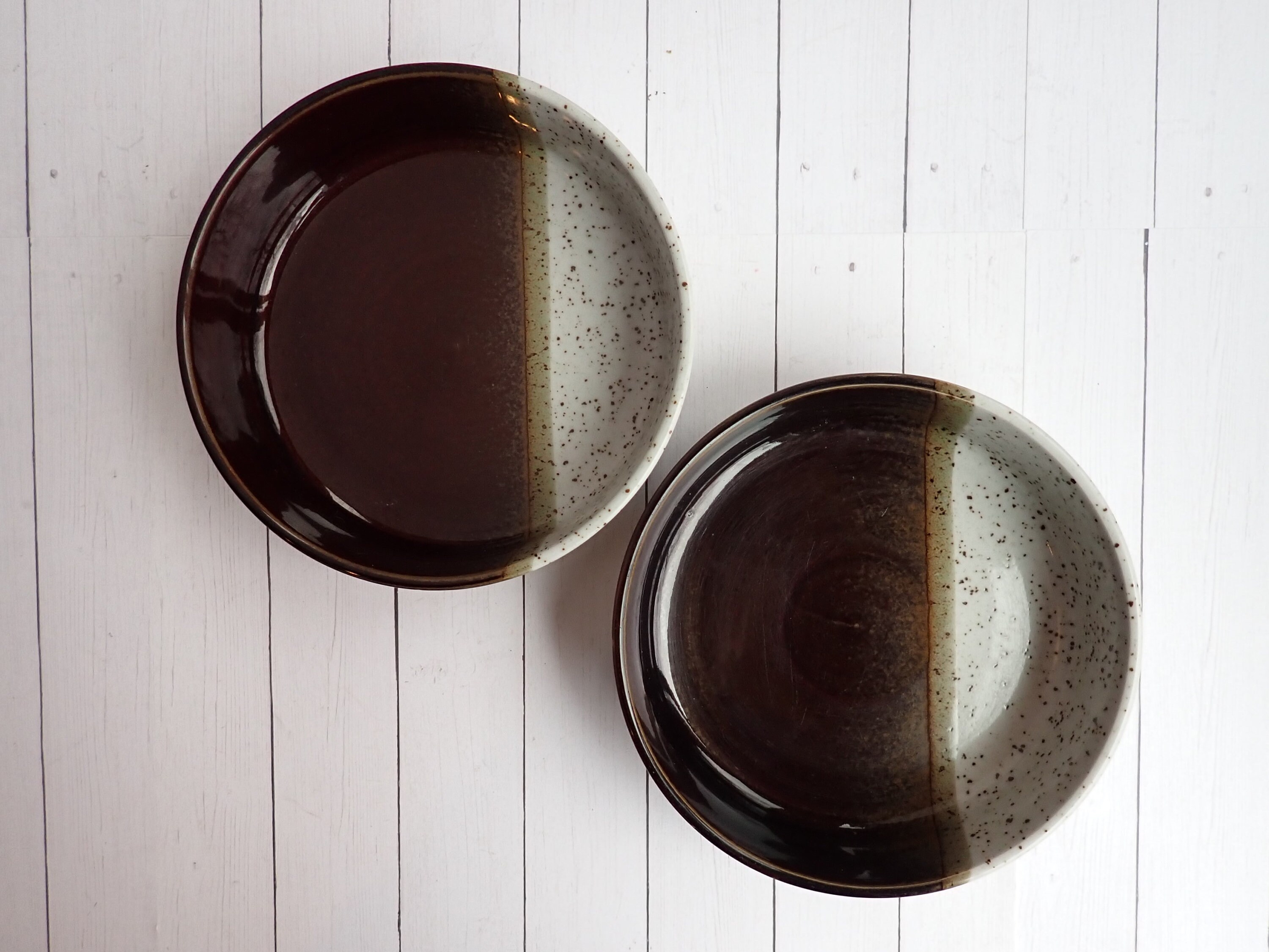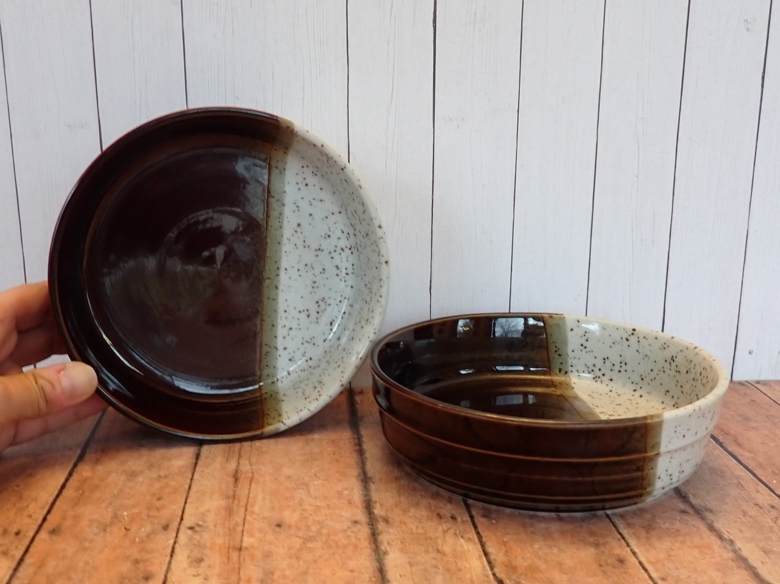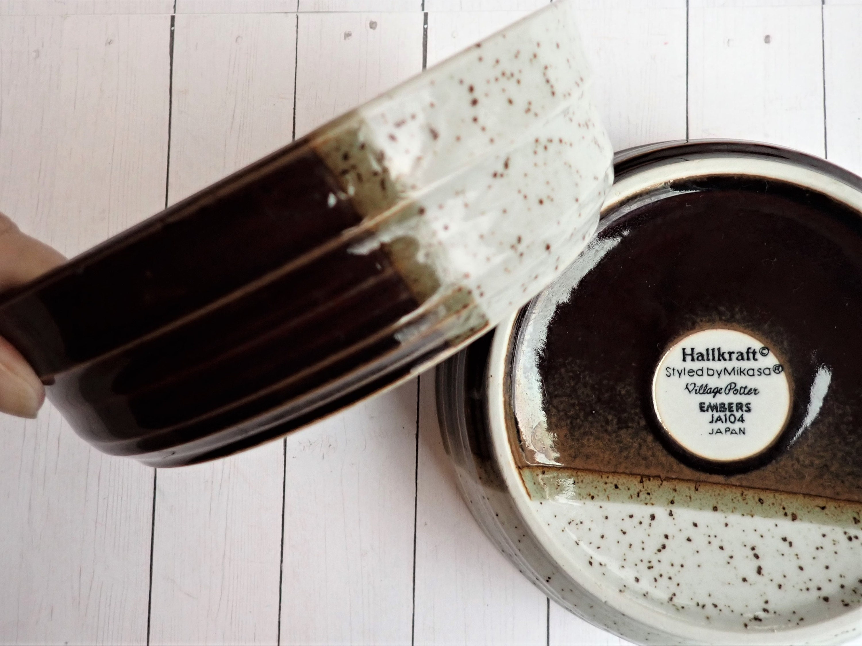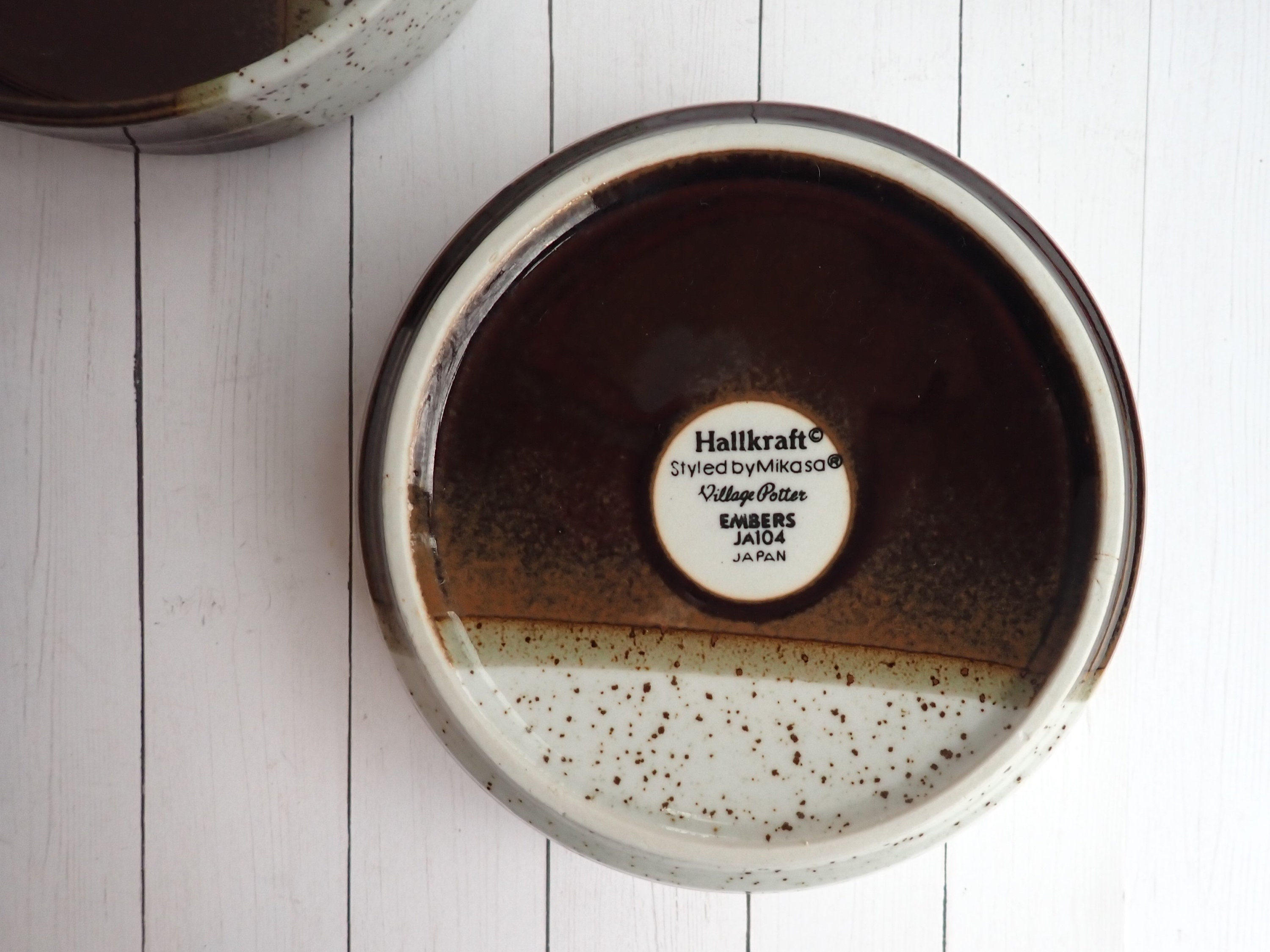 This set of 2 Mikasa bowls are the cereal bowls in the Hallkraft Village Potter line and are the Embers pattern. Each bowl is 6.25" in diameter and 2" high at the rim. They are a brown and white stoneware with 2/3 of the bowl in brown, and 1/3 of the bowl in white. The bottoms are marked: Hallkraft / Syled By Mikasa / Village Potter / Embers / JA104 / JAPAN.