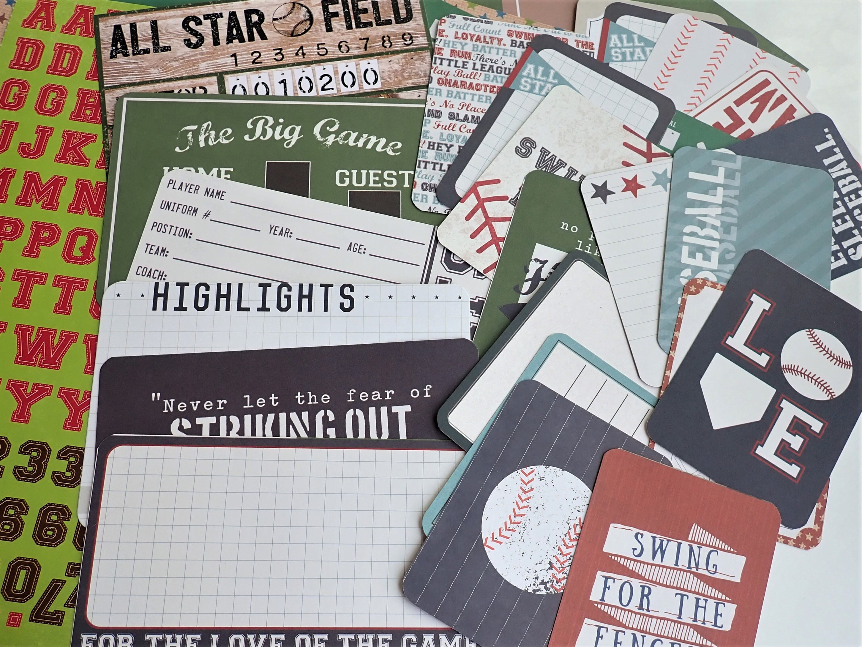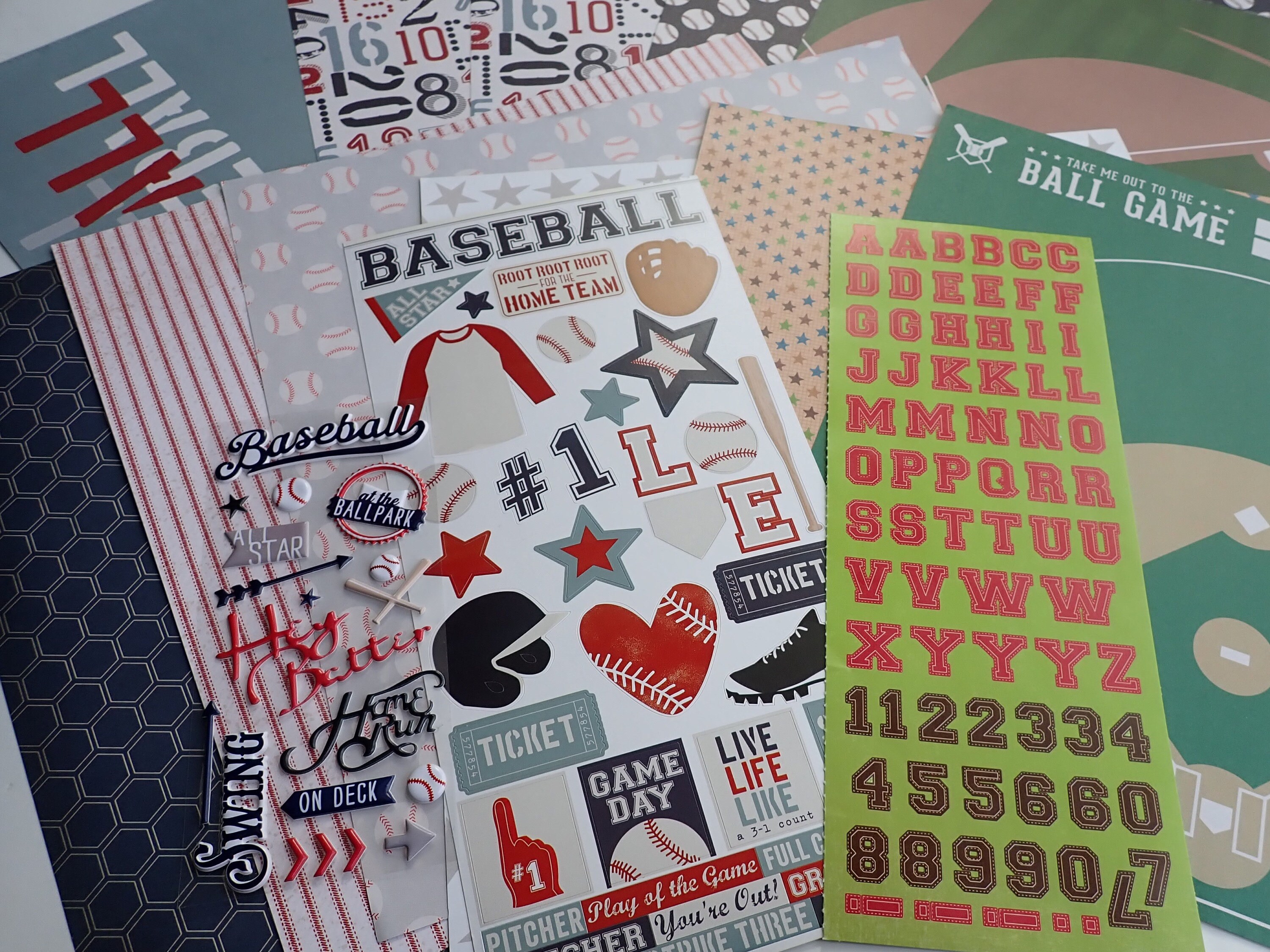 This baseball scrapbook kit is a mix and match set (some Echo Park) and includes: