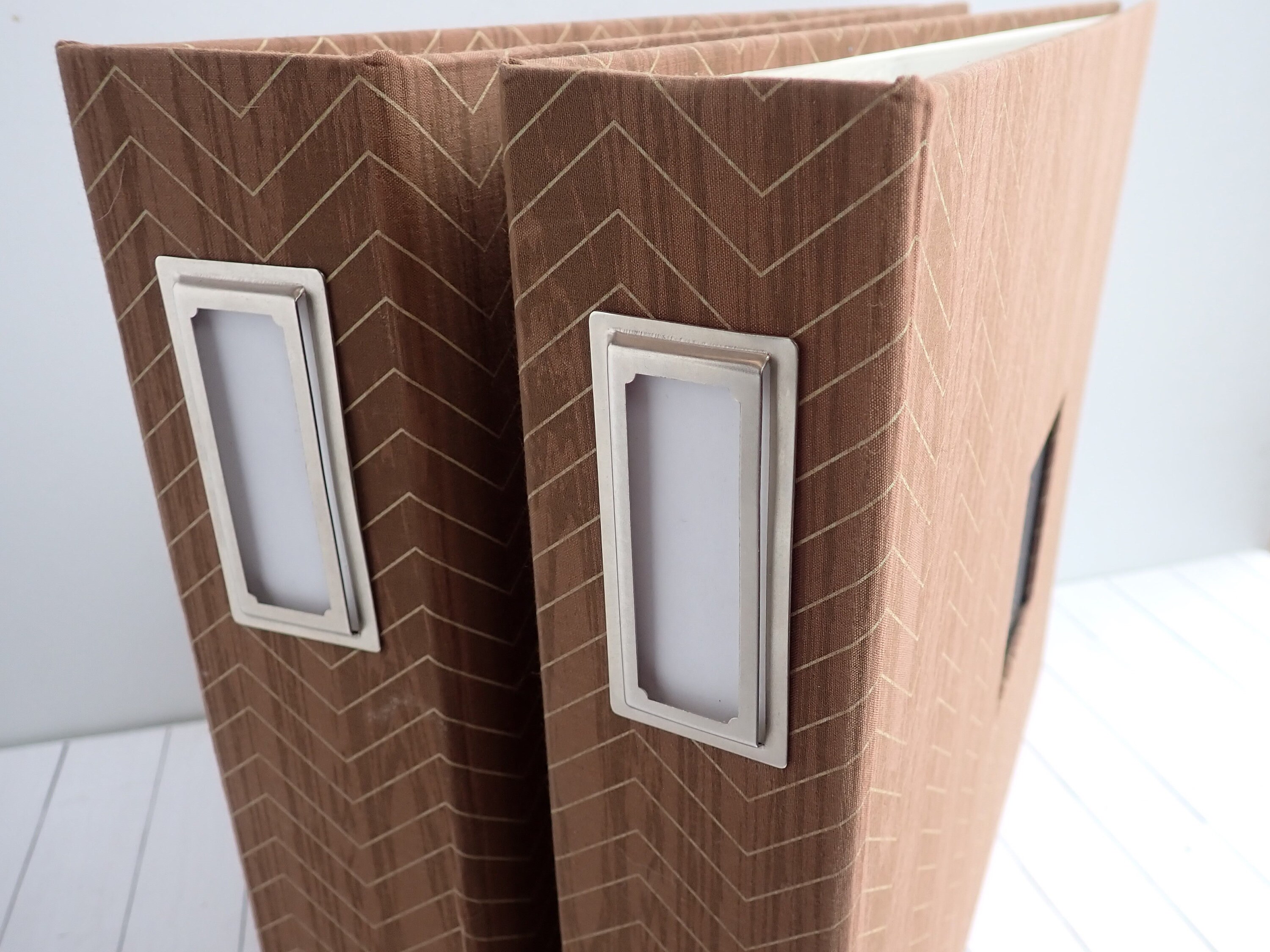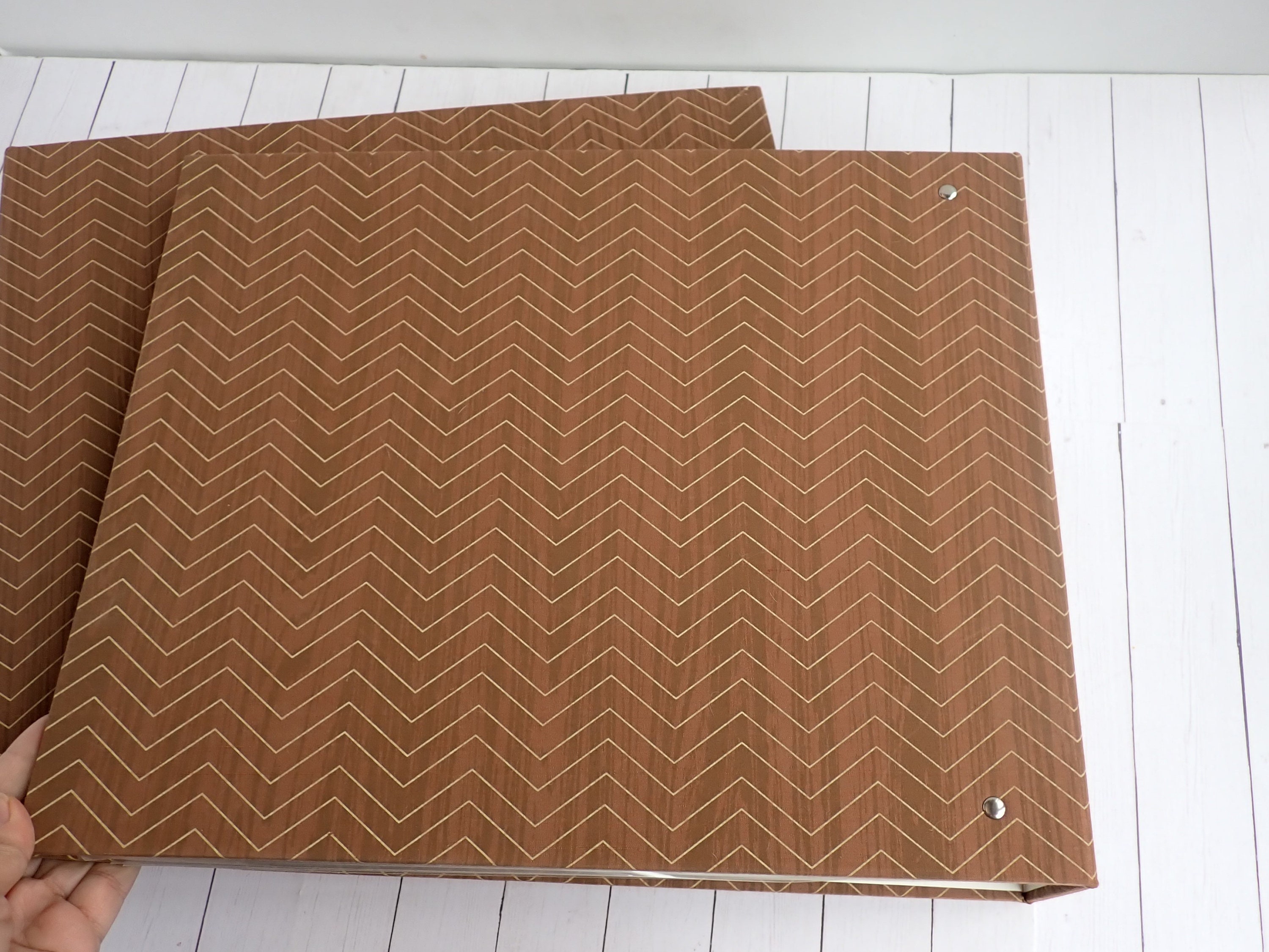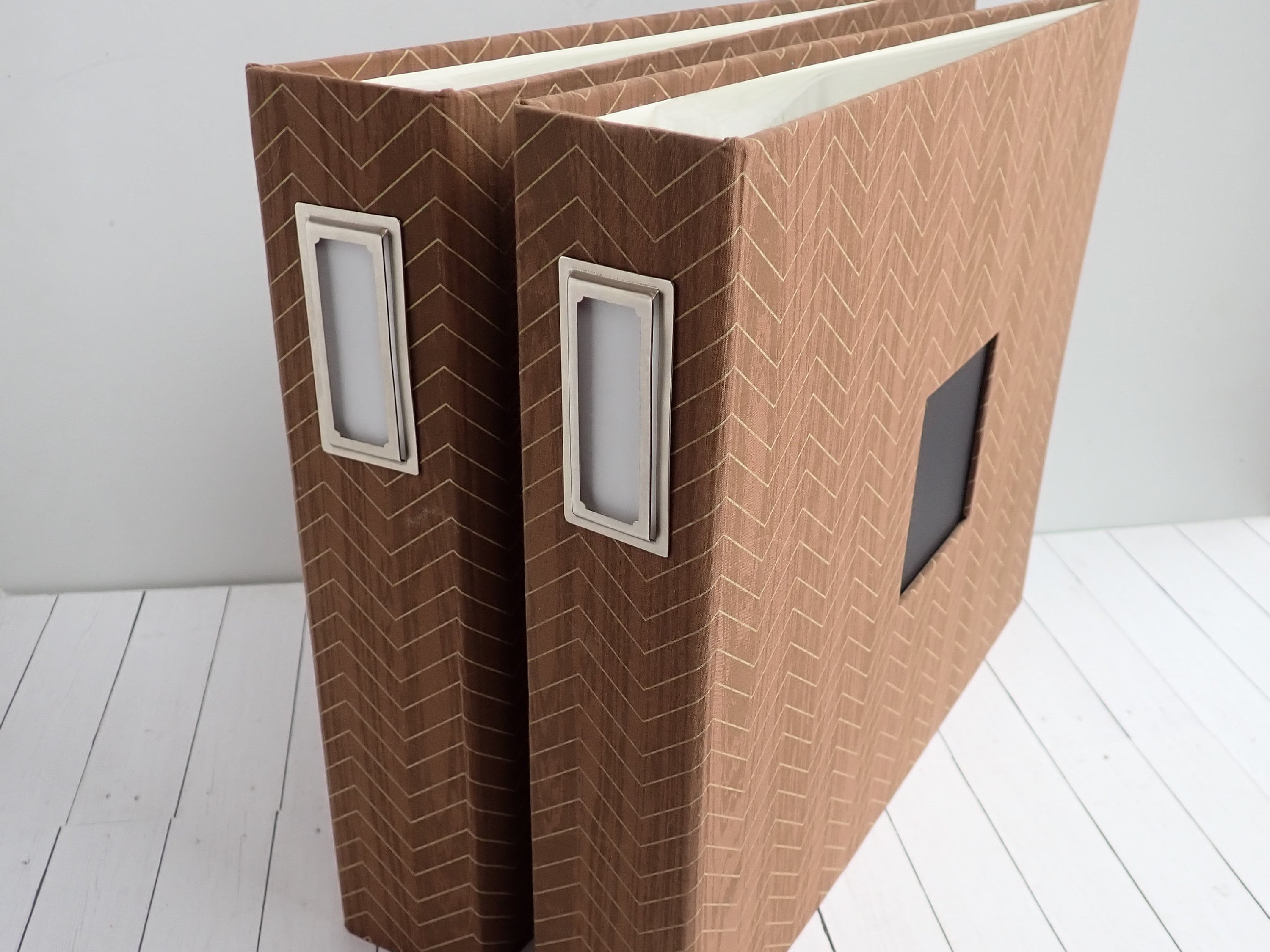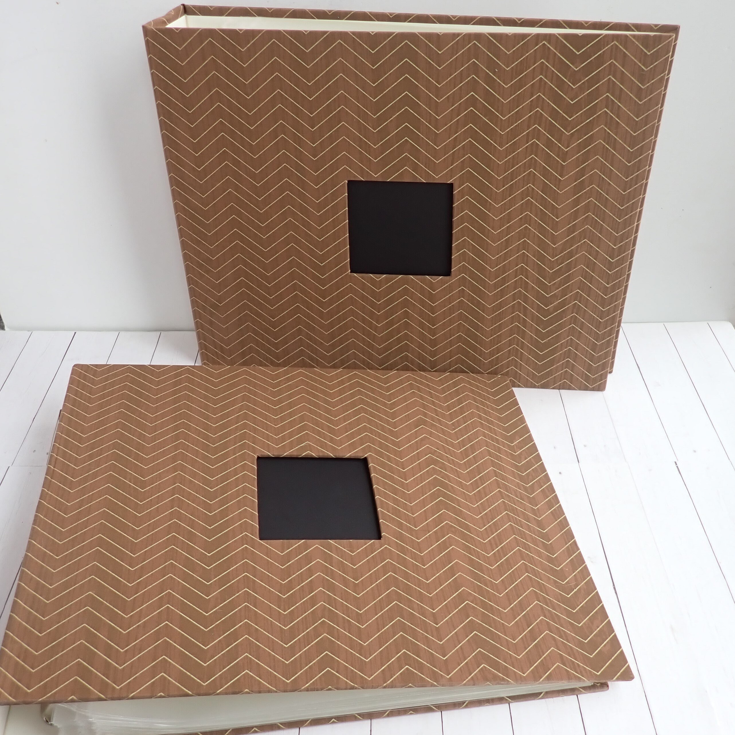 This set of 12x12 scrapbook albums includes 2 matching albums in the same design. These albums are by American Crafts, and are 12x12 D-ring style albums. The overall size of the albums is 15" long, 13" tall, and 2.75" deep. The albums are cloth covered with a brown and tan material that have a wood grain pattern with a chevron design. They have a 3" x 3" window opening on the front of each album. There are 30 Paper Studios page protectors included in each album.