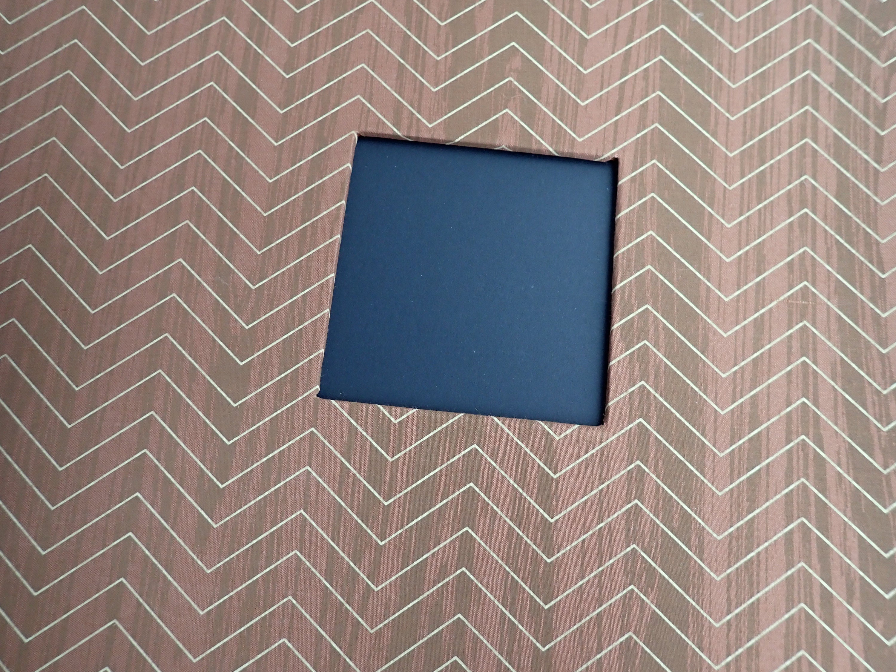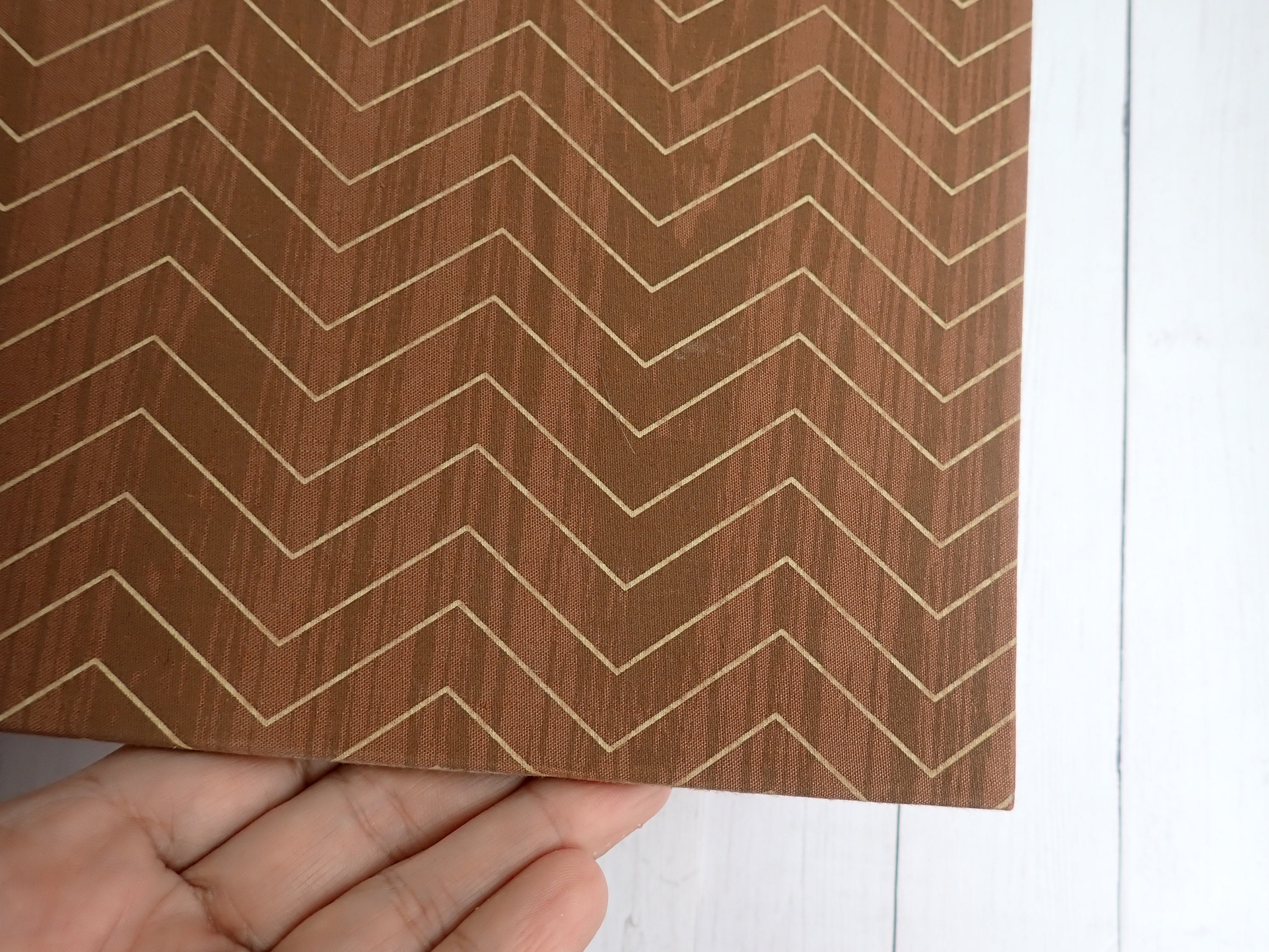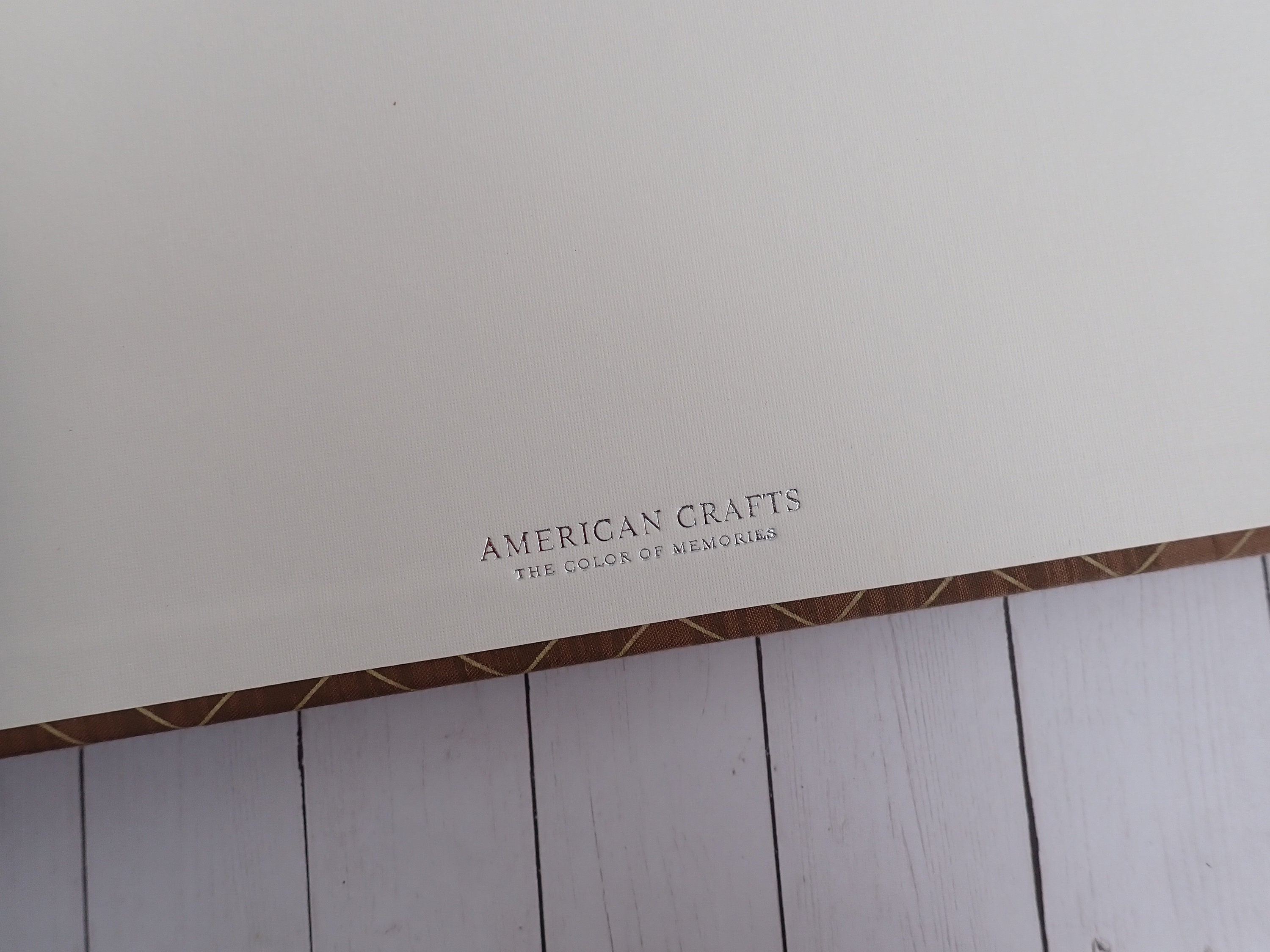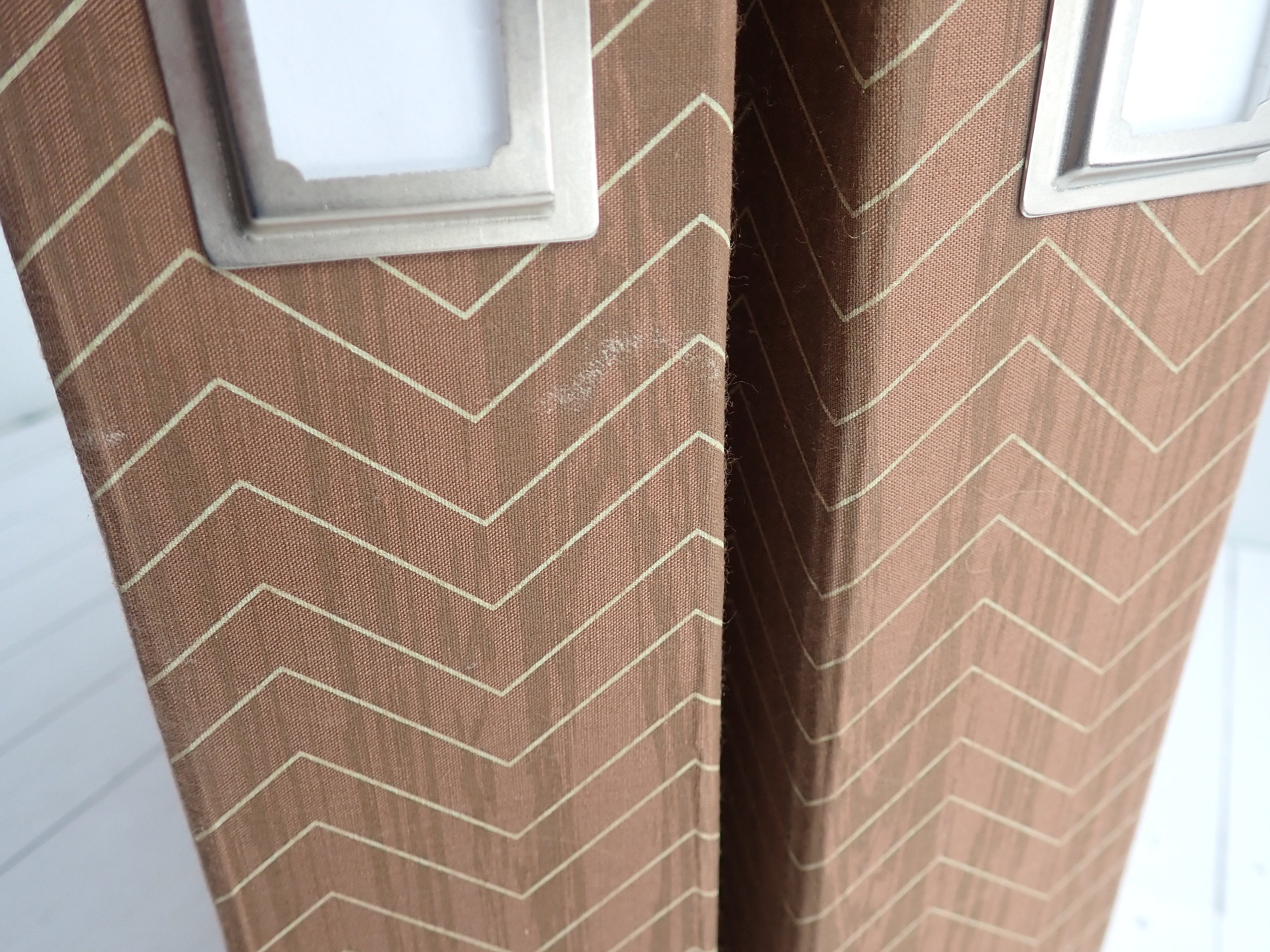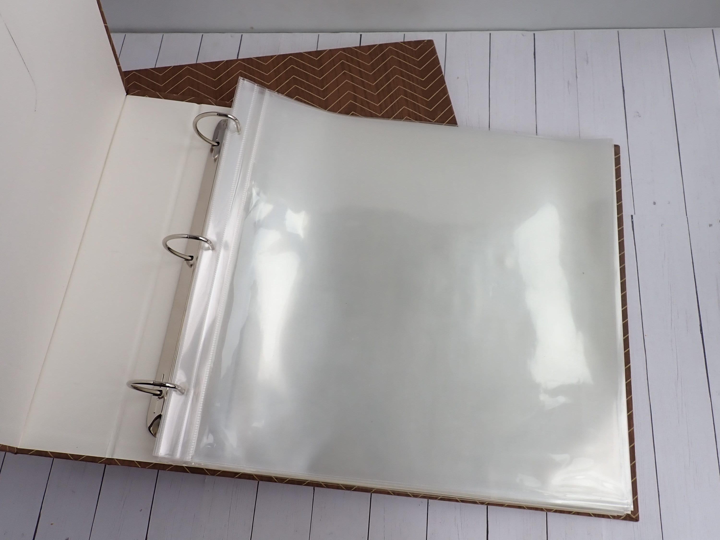 This set of 12x12 scrapbook albums includes 2 matching albums in the same design. These albums are by American Crafts, and are 12x12 D-ring style albums. The overall size of the albums is 15" long, 13" tall, and 2.75" deep. The albums are cloth covered with a brown and tan material that have a wood grain pattern with a chevron design. They have a 3" x 3" window opening on the front of each album. There are 30 Paper Studios page protectors included in each album.
