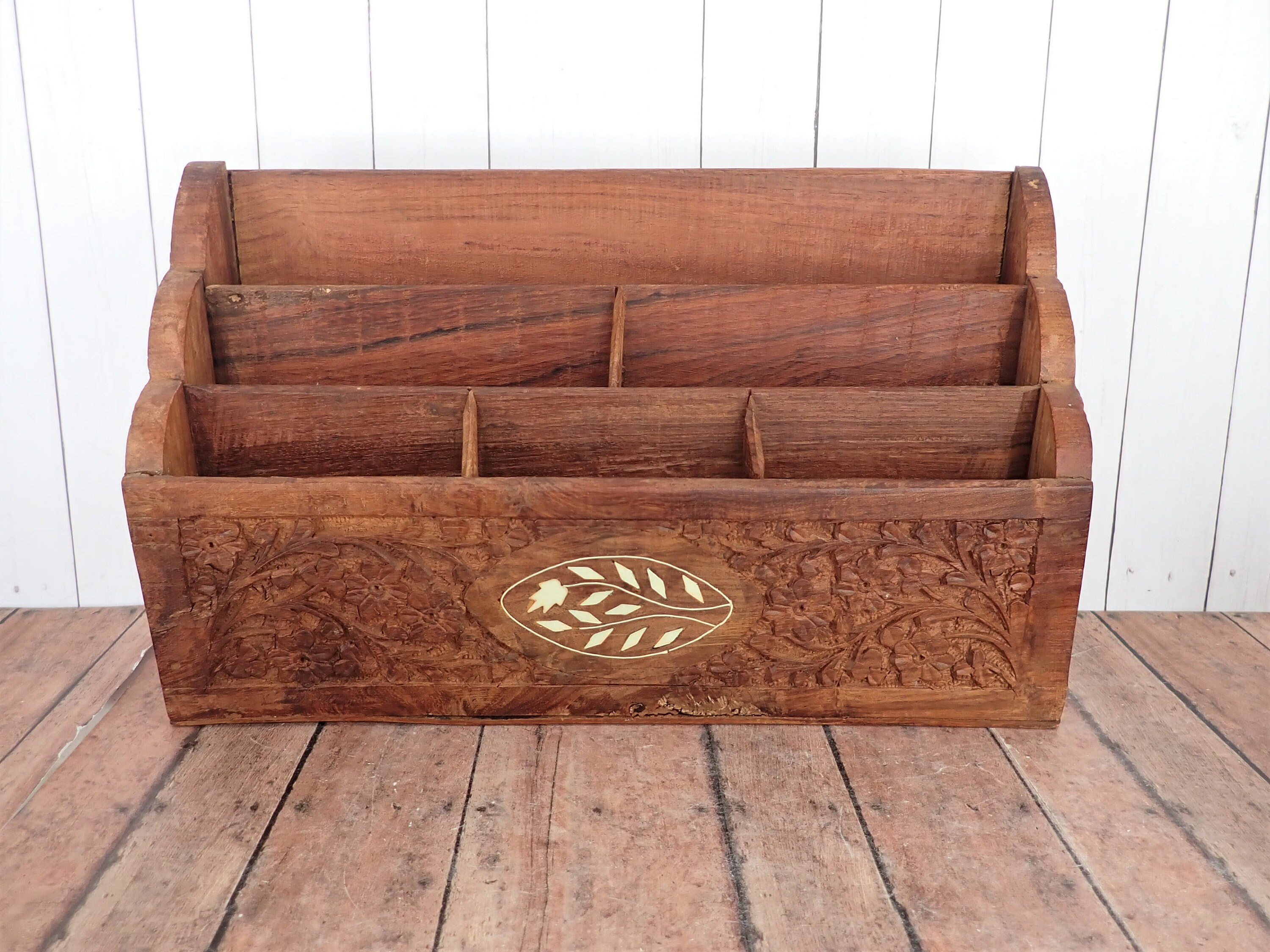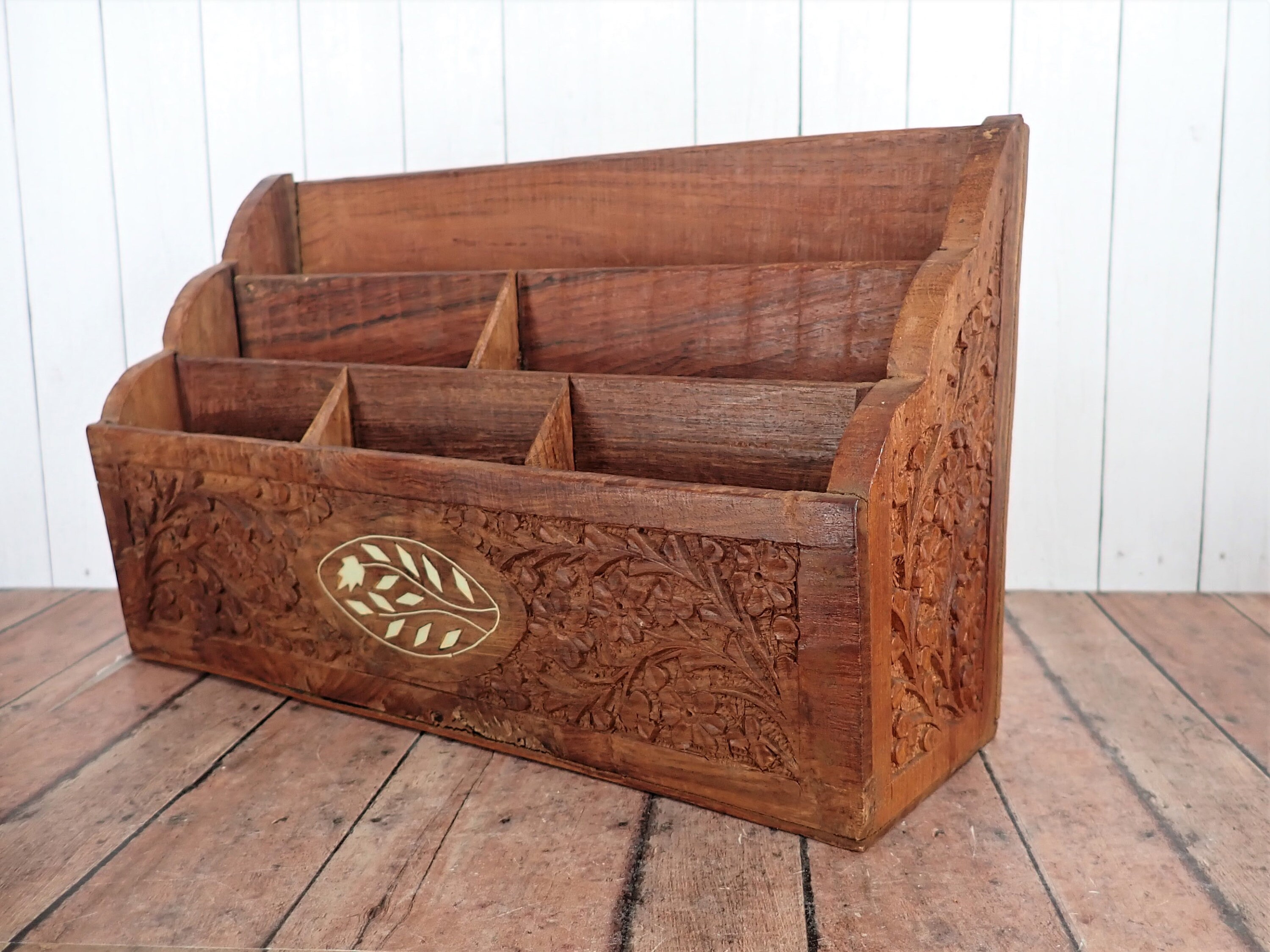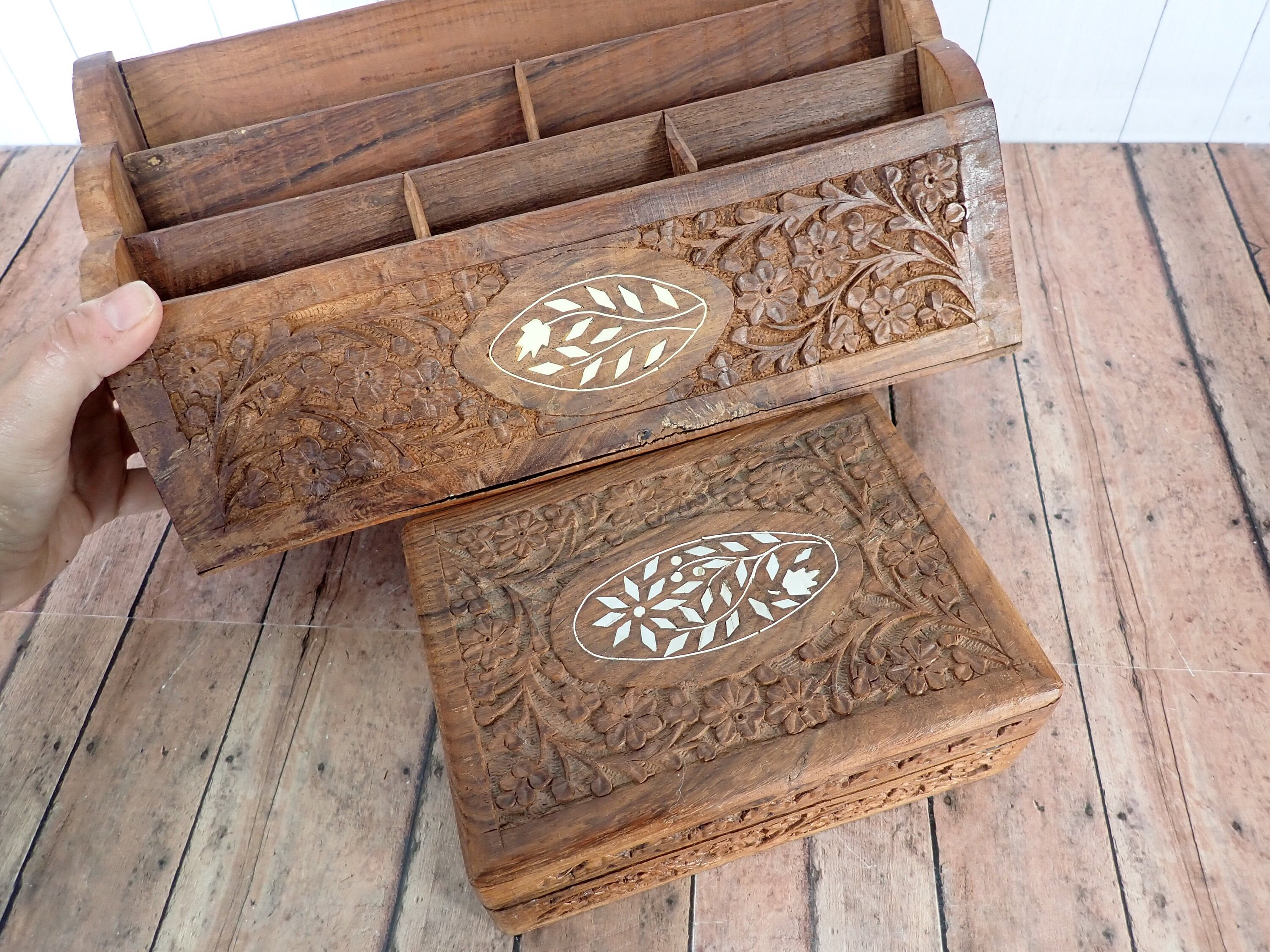 This great desk organizer and wooden box are solid wood pieces with a highly detailed carved floral design. The organizer is 12" long, 3.5" deep, and 7" tall. It has 6 vertical compartments, each 3/4" deep. The front, sides, and back of the organizer are highly detailed with a carved floral design. The front is accented with an inlay white floral design. The organizer is a rustic piece and does have rough edges and some rough cuts in the inner panels of the wood. The box is 7"long, 5" deep, and 2" tall. It has a hinged lid and is lined on the inside with a purple material.