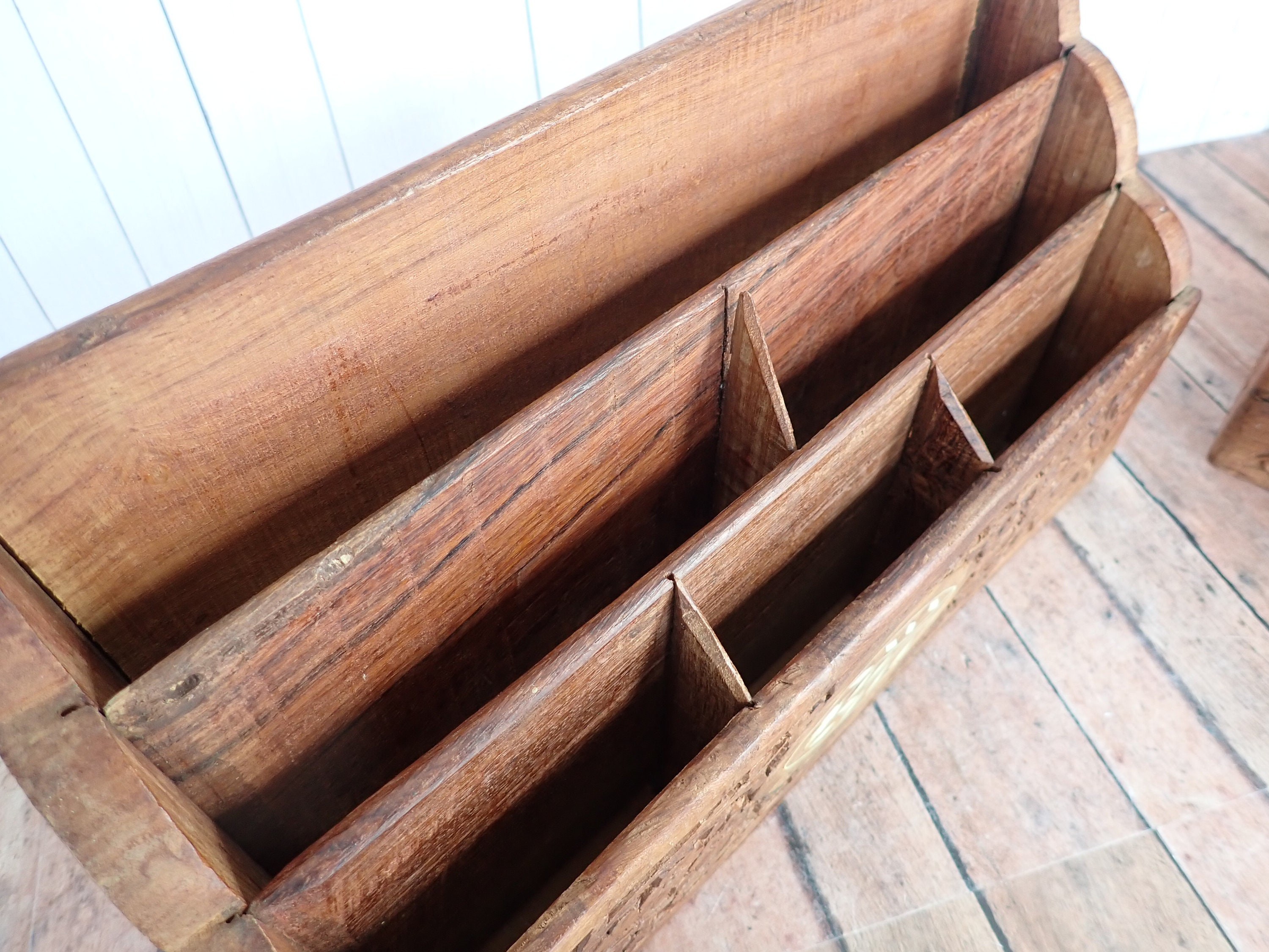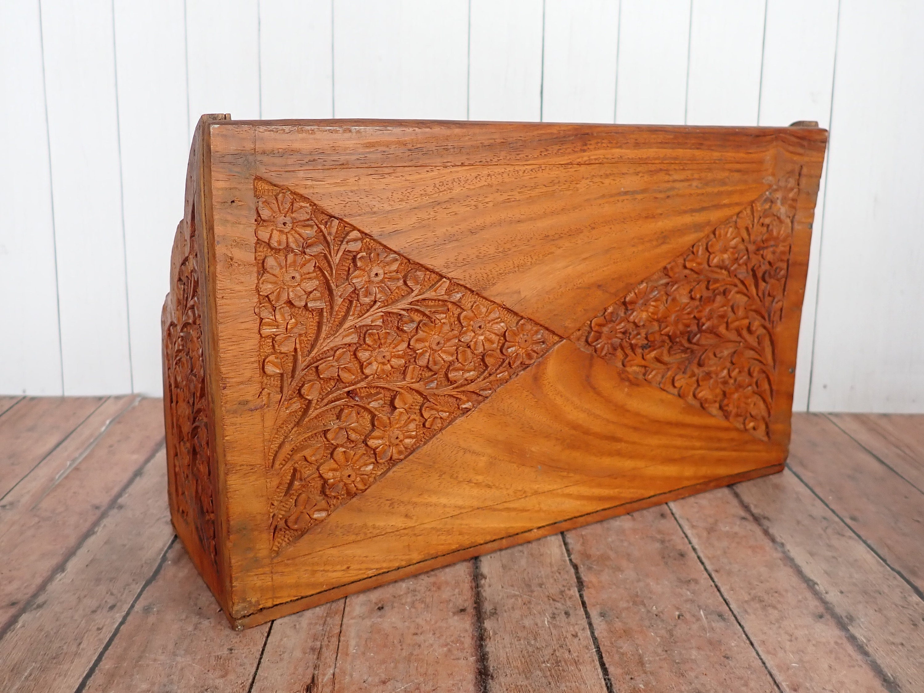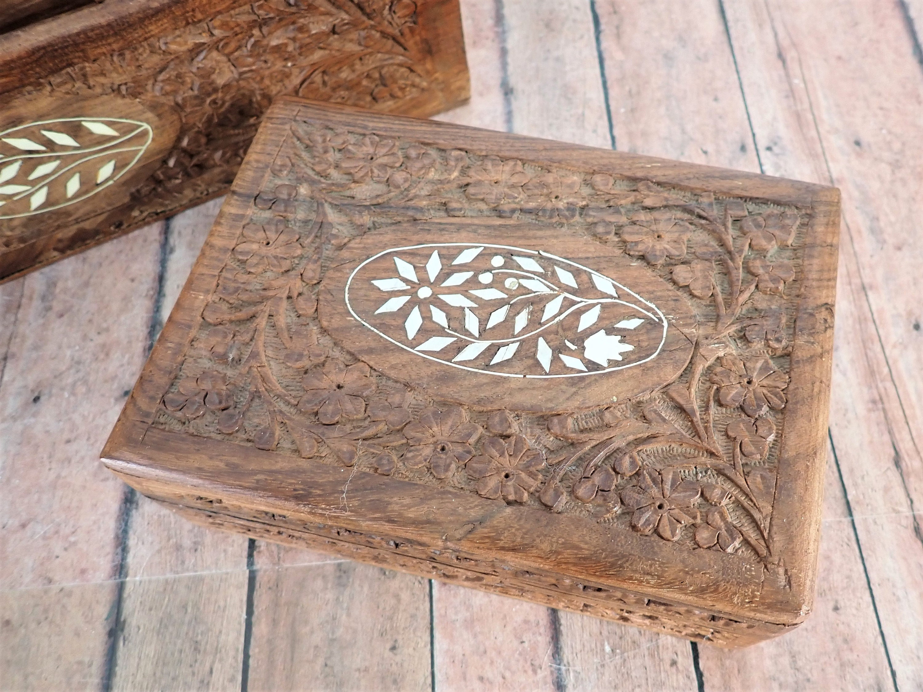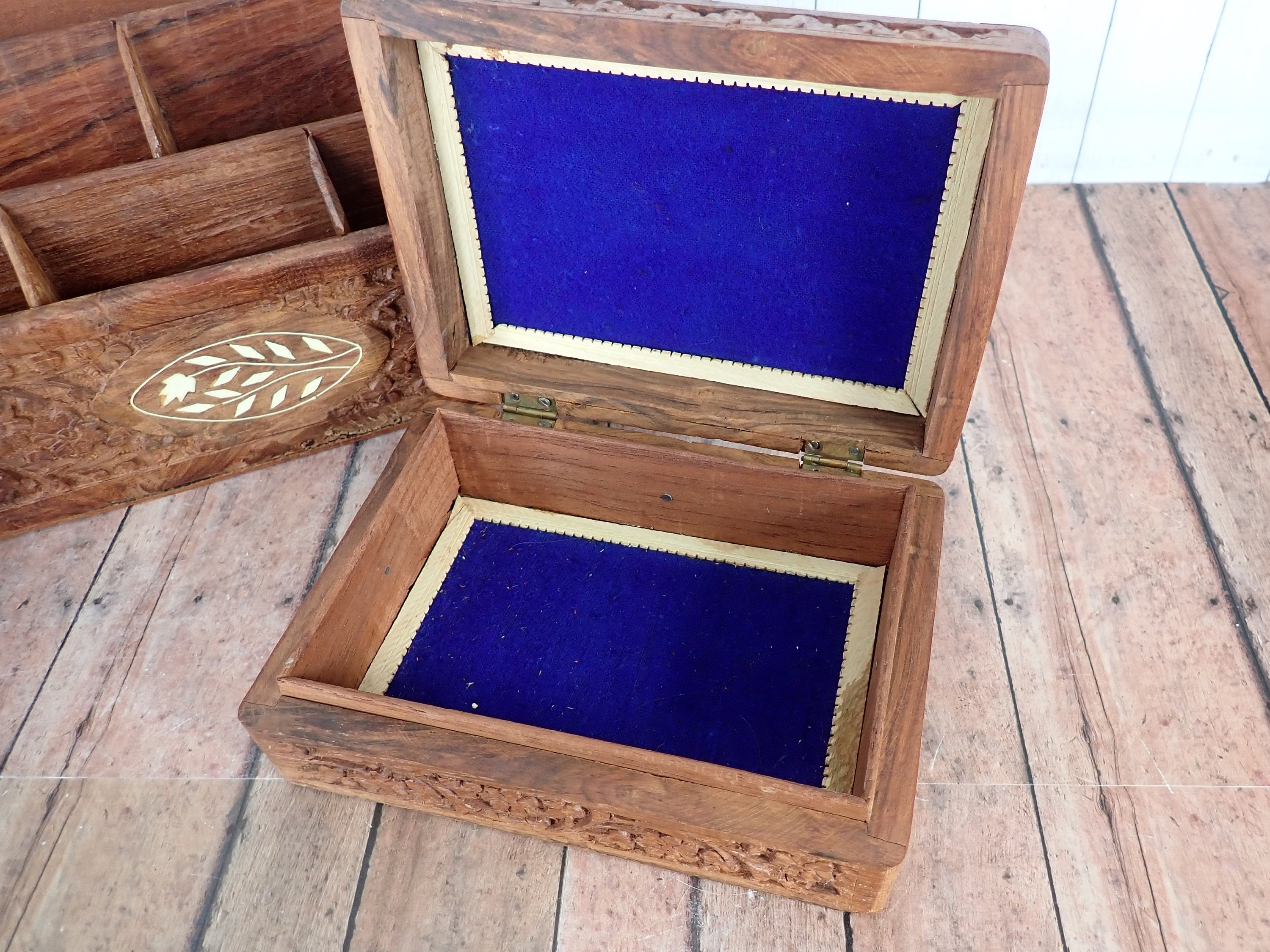 This great desk organizer and wooden box are solid wood pieces with a highly detailed carved floral design. The organizer is 12" long, 3.5" deep, and 7" tall. It has 6 vertical compartments, each 3/4" deep. The front, sides, and back of the organizer are highly detailed with a carved floral design. The front is accented with an inlay white floral design. The organizer is a rustic piece and does have rough edges and some rough cuts in the inner panels of the wood. The box is 7"long, 5" deep, and 2" tall. It has a hinged lid and is lined on the inside with a purple material.