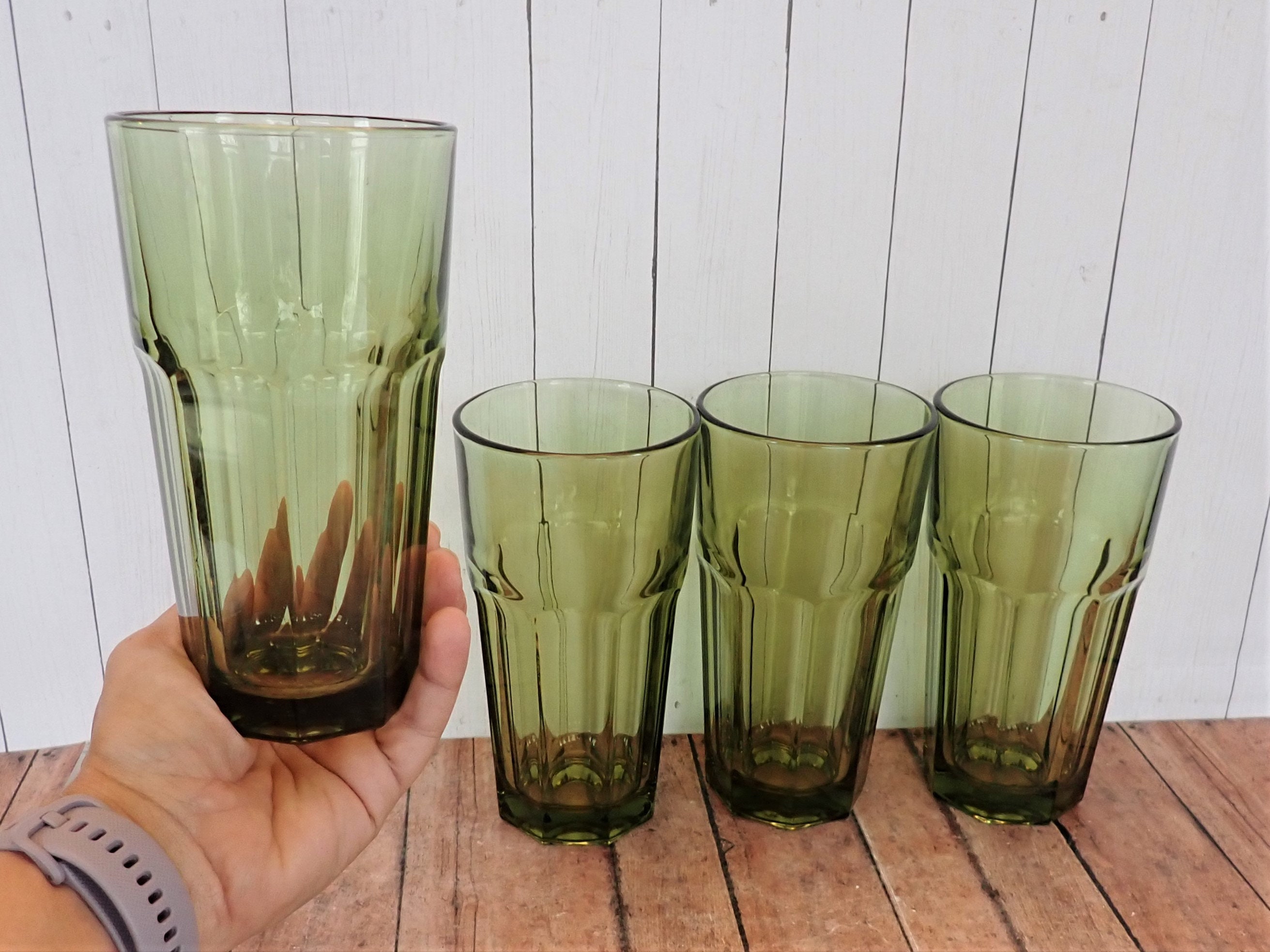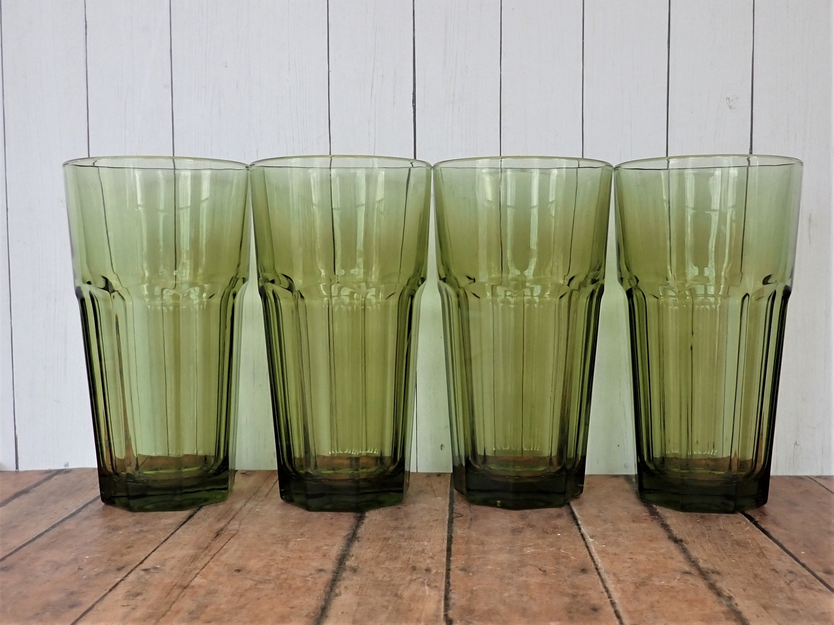 This set of 4 cooler glasses by Libbey Glass are in the Gibraltar pattern and are the 6" Cooler glasses. They are each 6.25" tall and 3.5" in diameter. They are a pretty olive green color and have a flat paneled design around the glass. The bottom is marked: DURAUTFF U.S.A. The glasses can hold 14 oz. These glasses are a thick, heavy glass and weigh over 1 pound each.