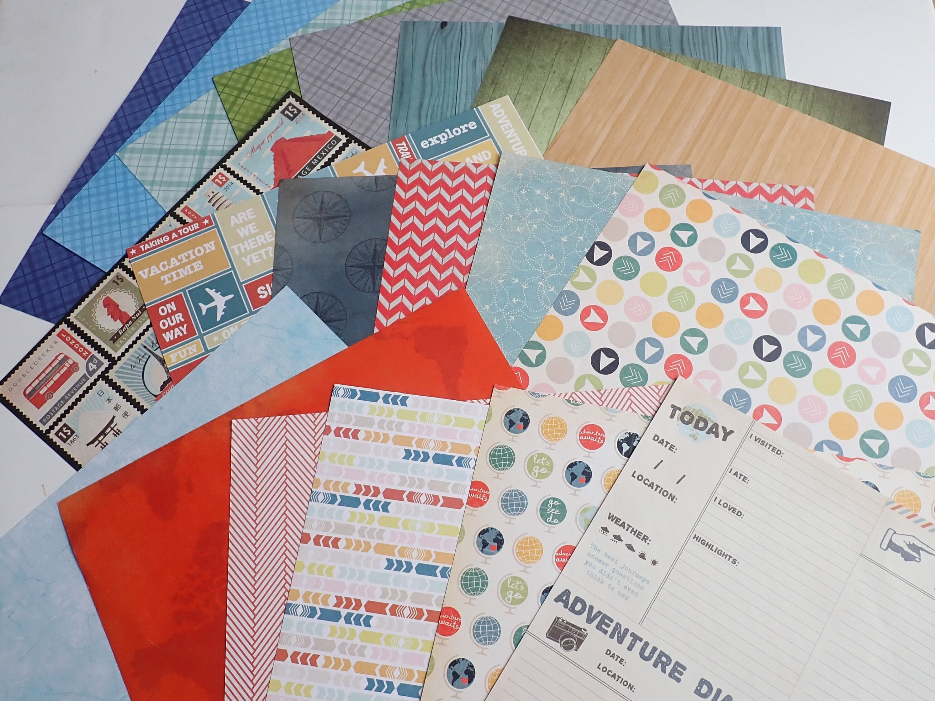 This scrapbook paper is a mix and match set of 20 sheets of travel themed paper and coordinating stickers, frames, and journal cards. The paper is 12x12 and includes patterns of maps, airplanes, cameras, arrows, and more! Included are: