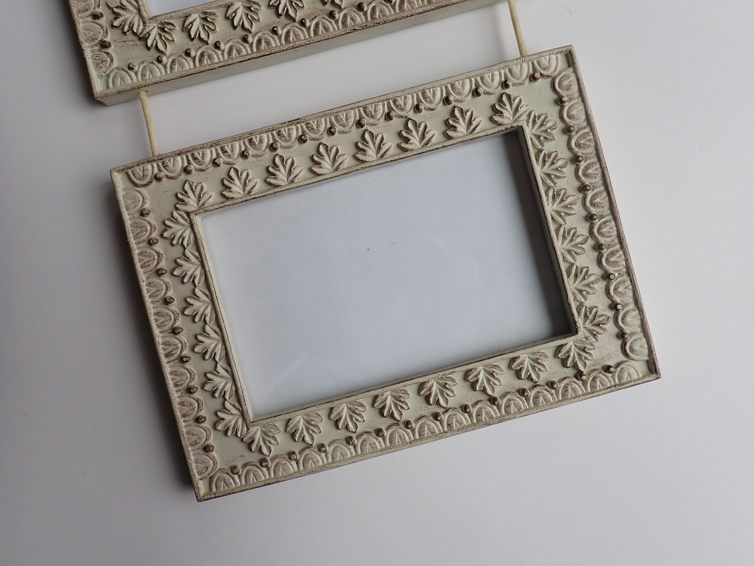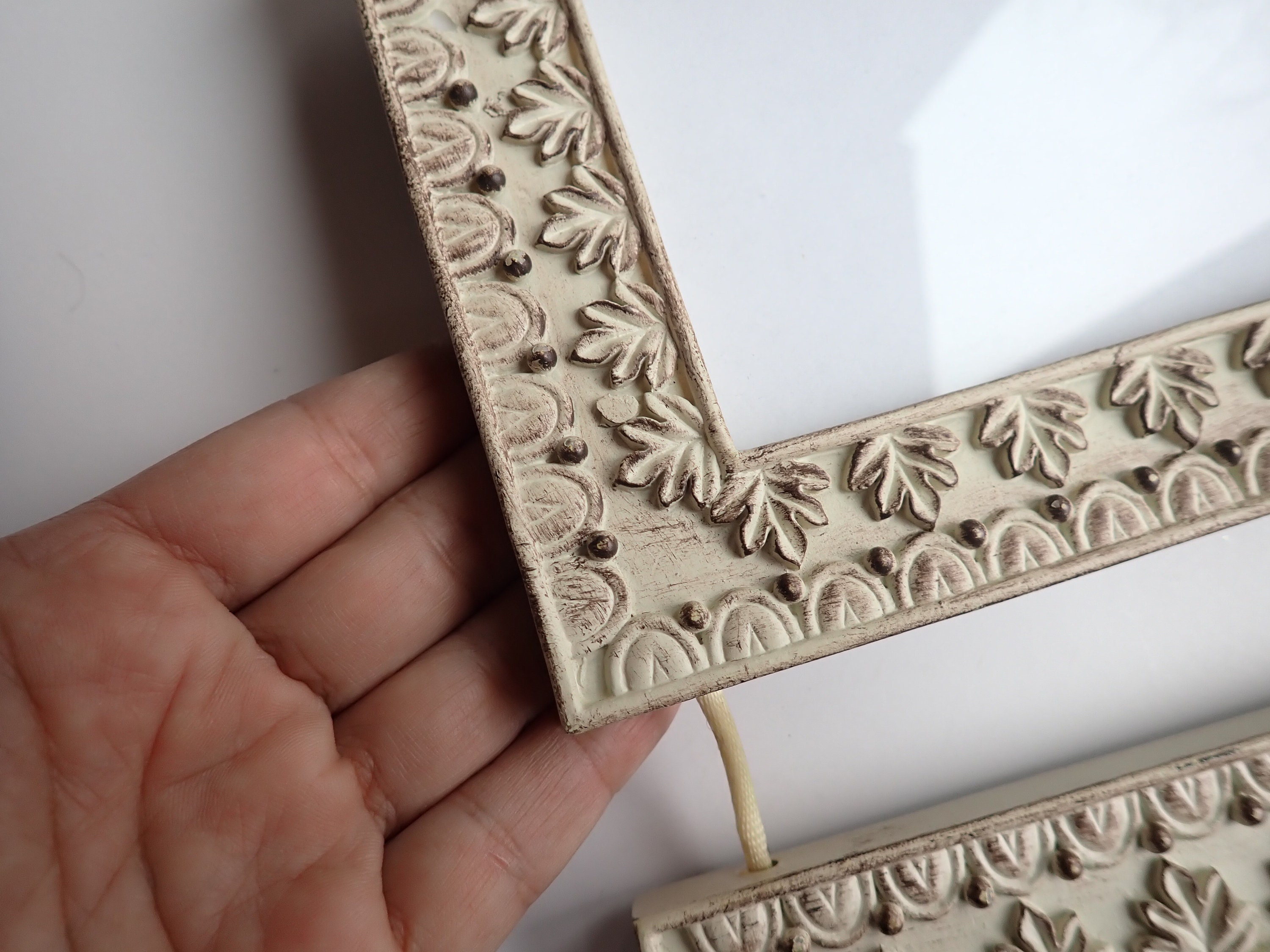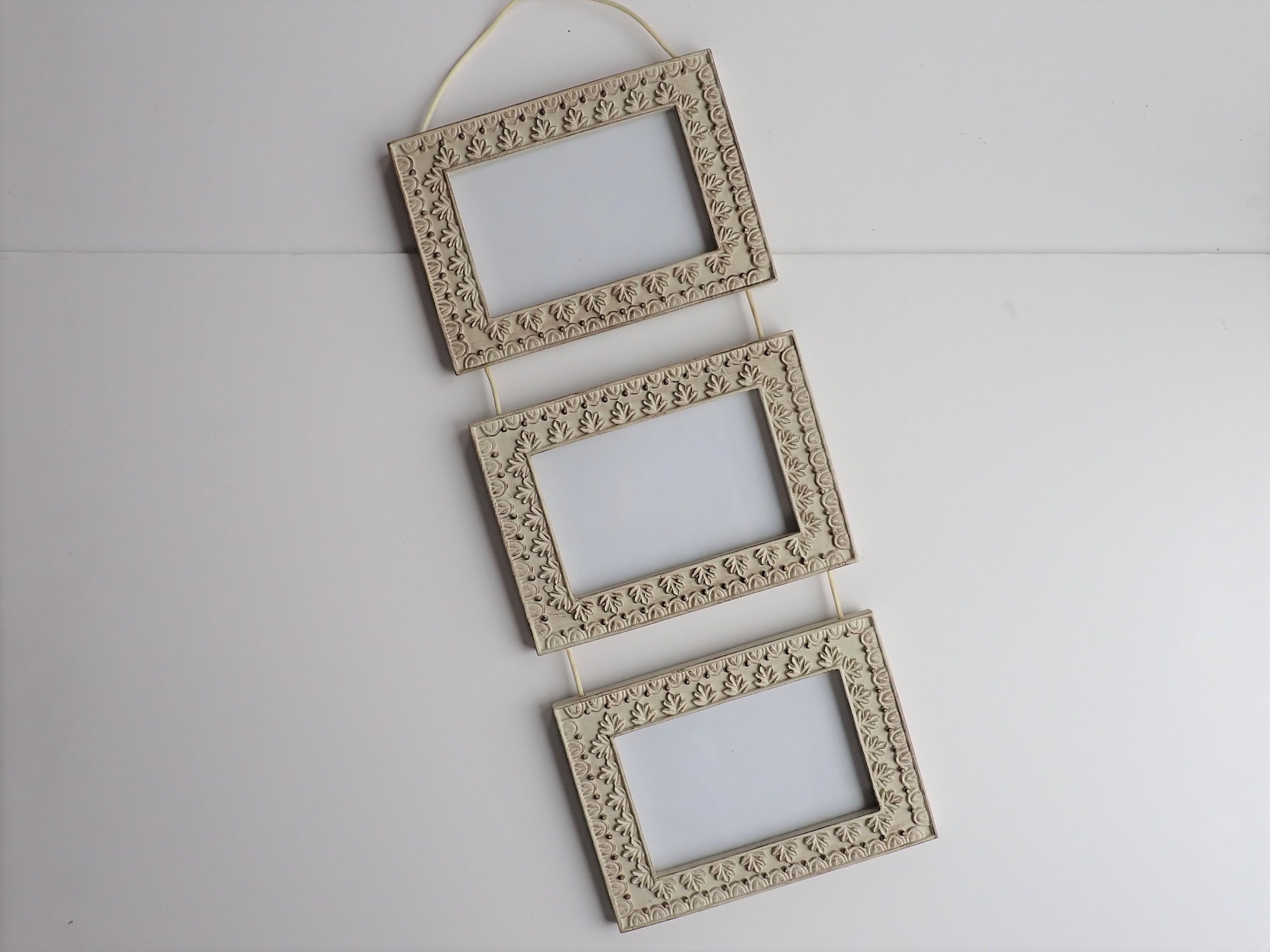 This hanging wall frame has 3 4x6 frames connected together with a cream-colored cord. Each frame is 5.5" x 7.5" and can hold one 4x6 photo. Overall the frame is 21" long when hung. The frames are decorated with a leaf design, and has a rustic finish with some brown showing through the cream colored paint. The frame is made of a resin-type material.