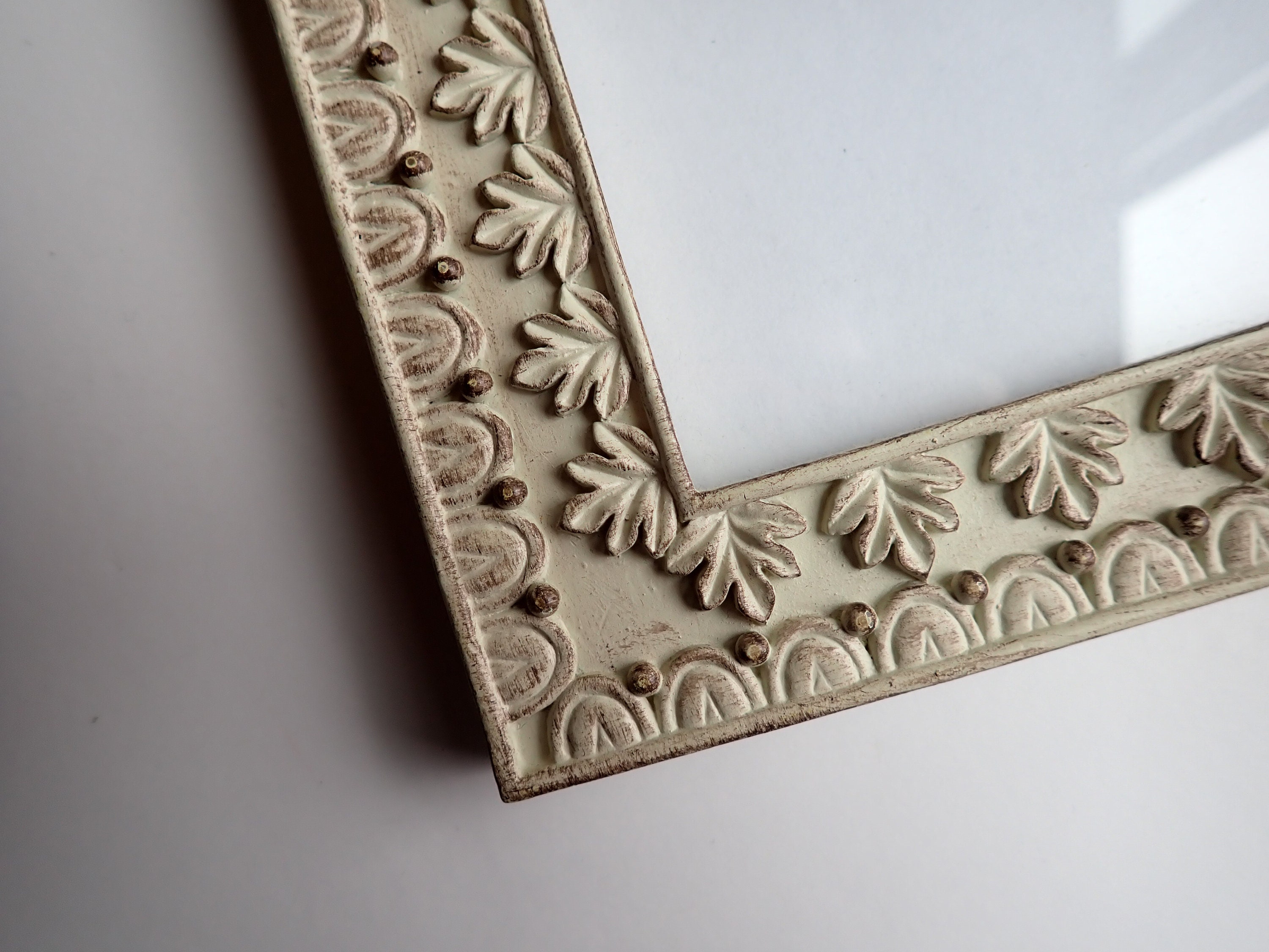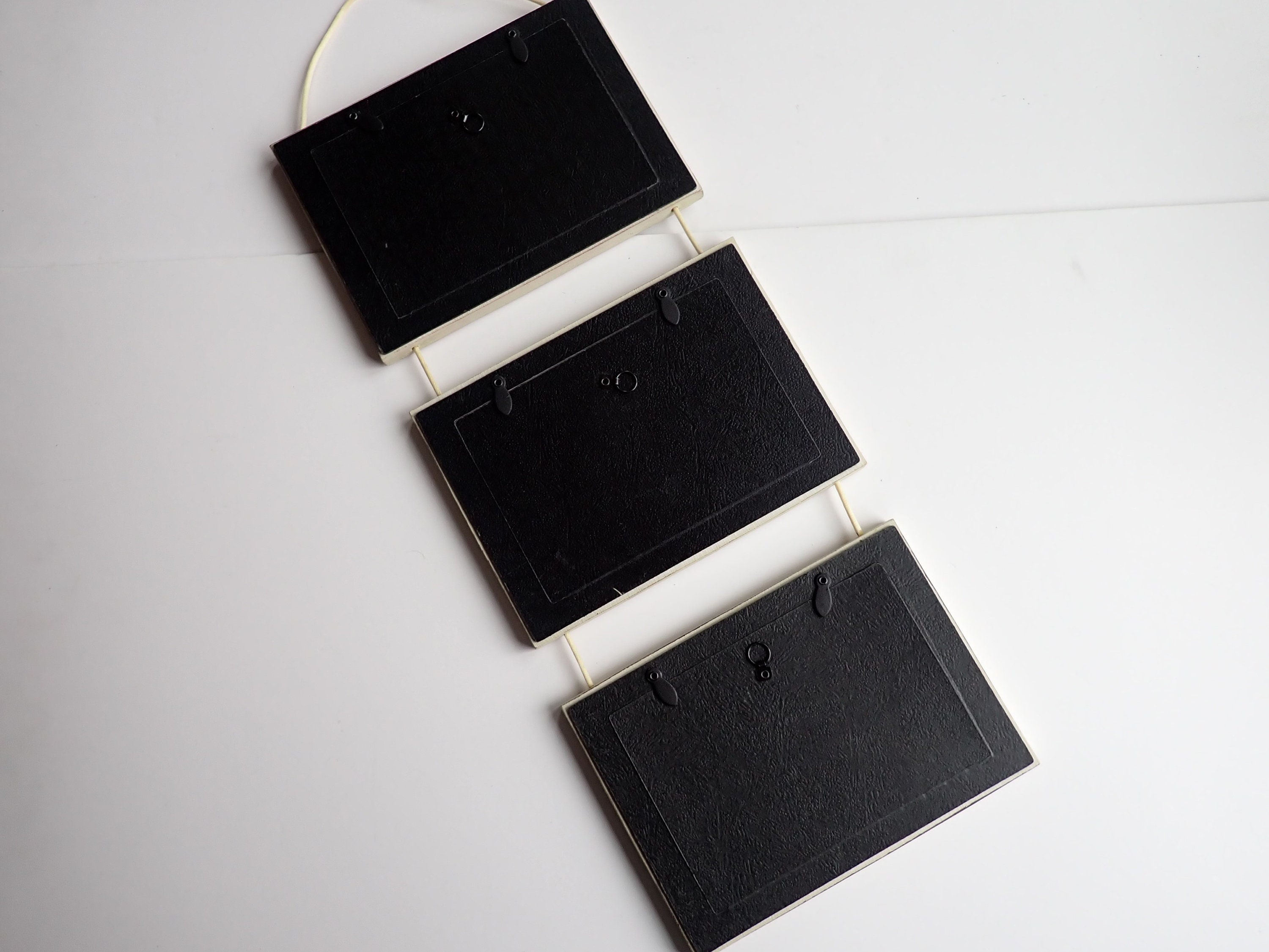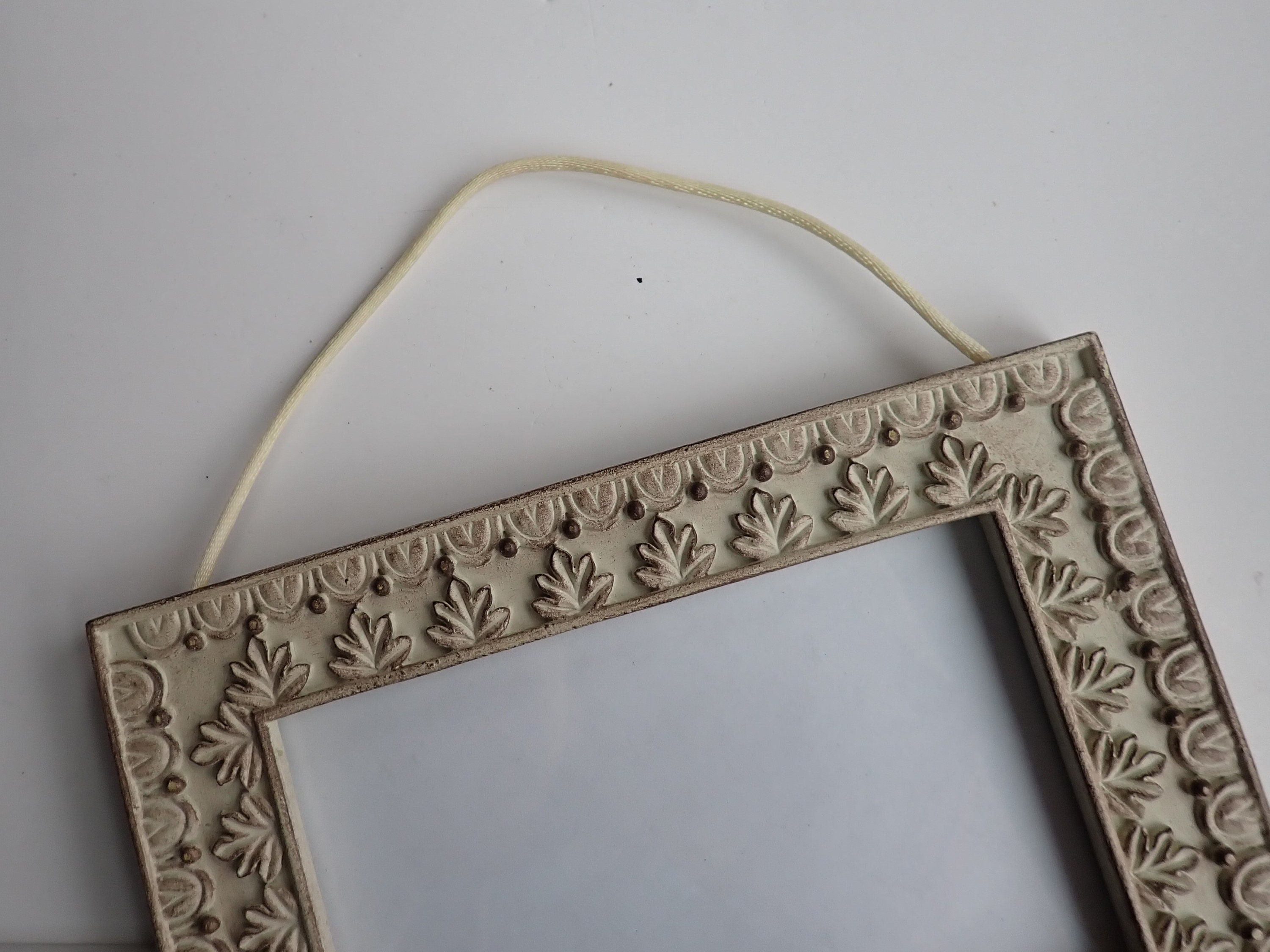 This hanging wall frame has 3 4x6 frames connected together with a cream-colored cord. Each frame is 5.5" x 7.5" and can hold one 4x6 photo. Overall the frame is 21" long when hung. The frames are decorated with a leaf design, and has a rustic finish with some brown showing through the cream colored paint. The frame is made of a resin-type material.