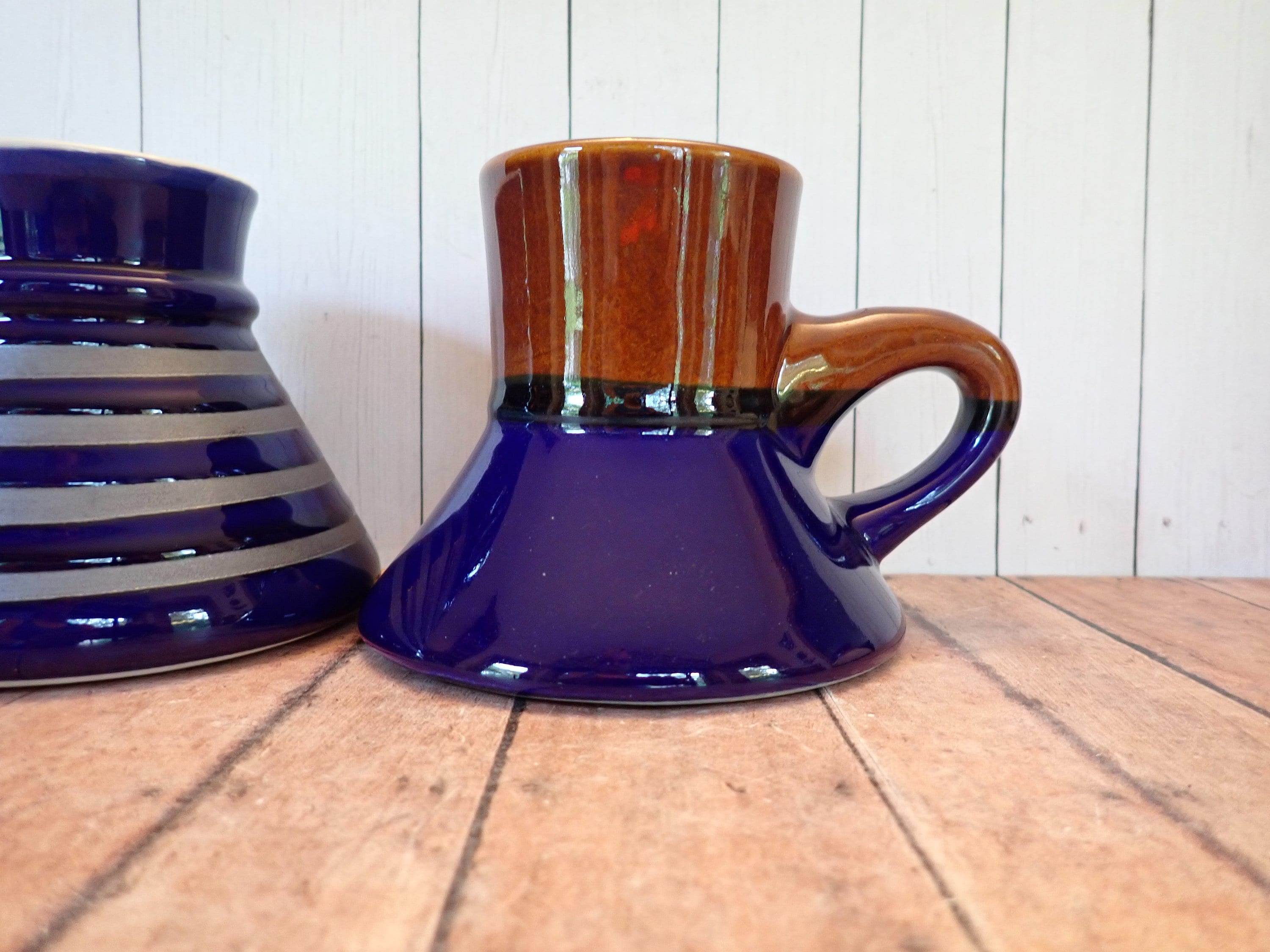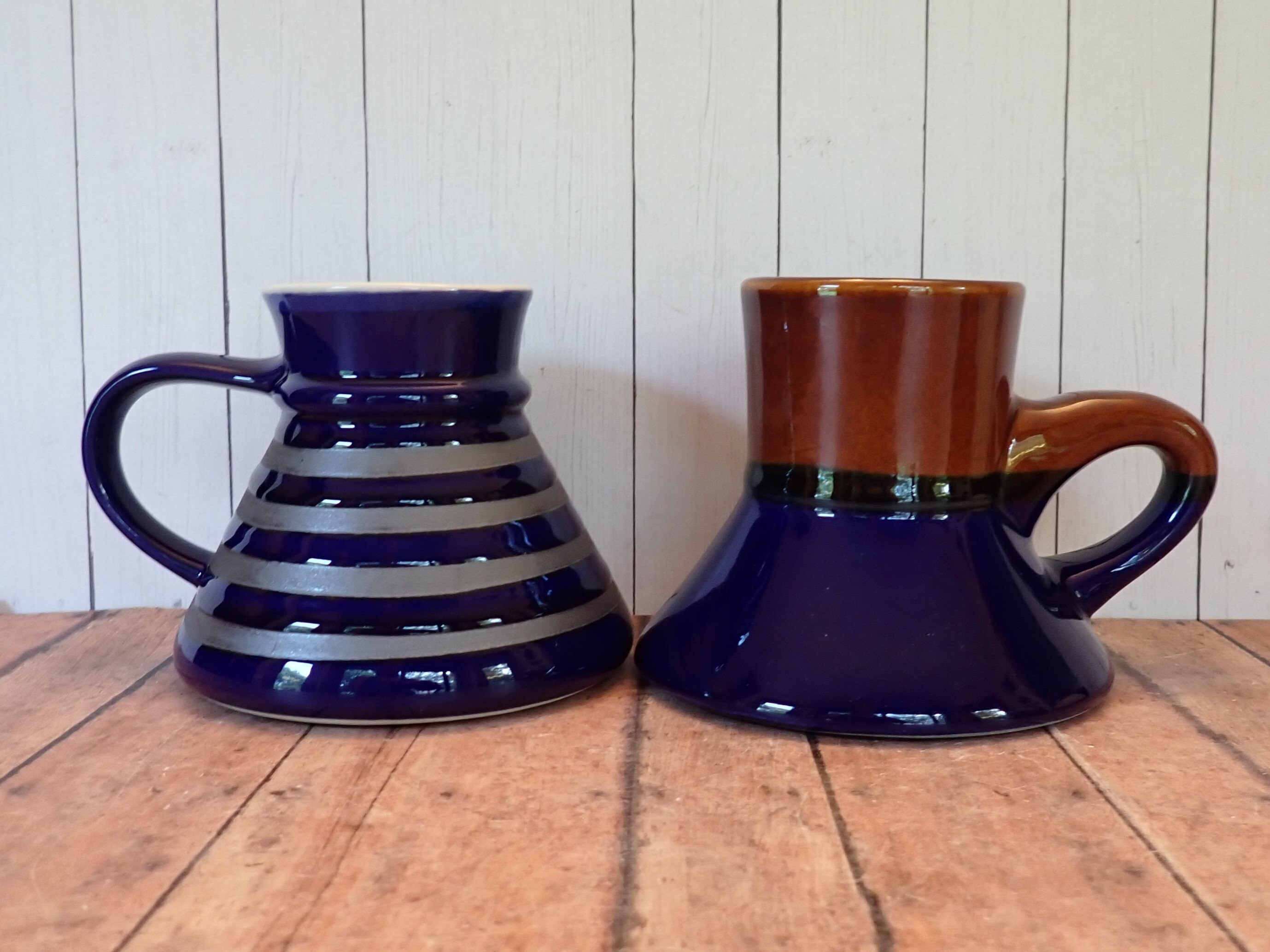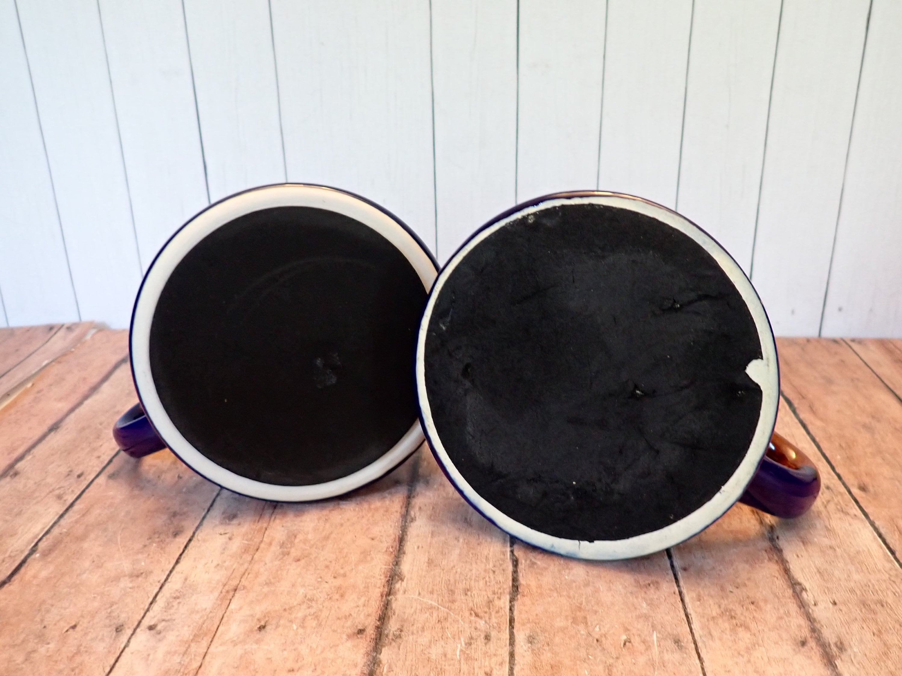 Both mugs are in very good condition with no chips or cracks. There are some imperfections on the surface of the mugs, and the finish on the blue portion of the mug is a little worn/splotchy. Great pair of coordinating wide bottom mugs!